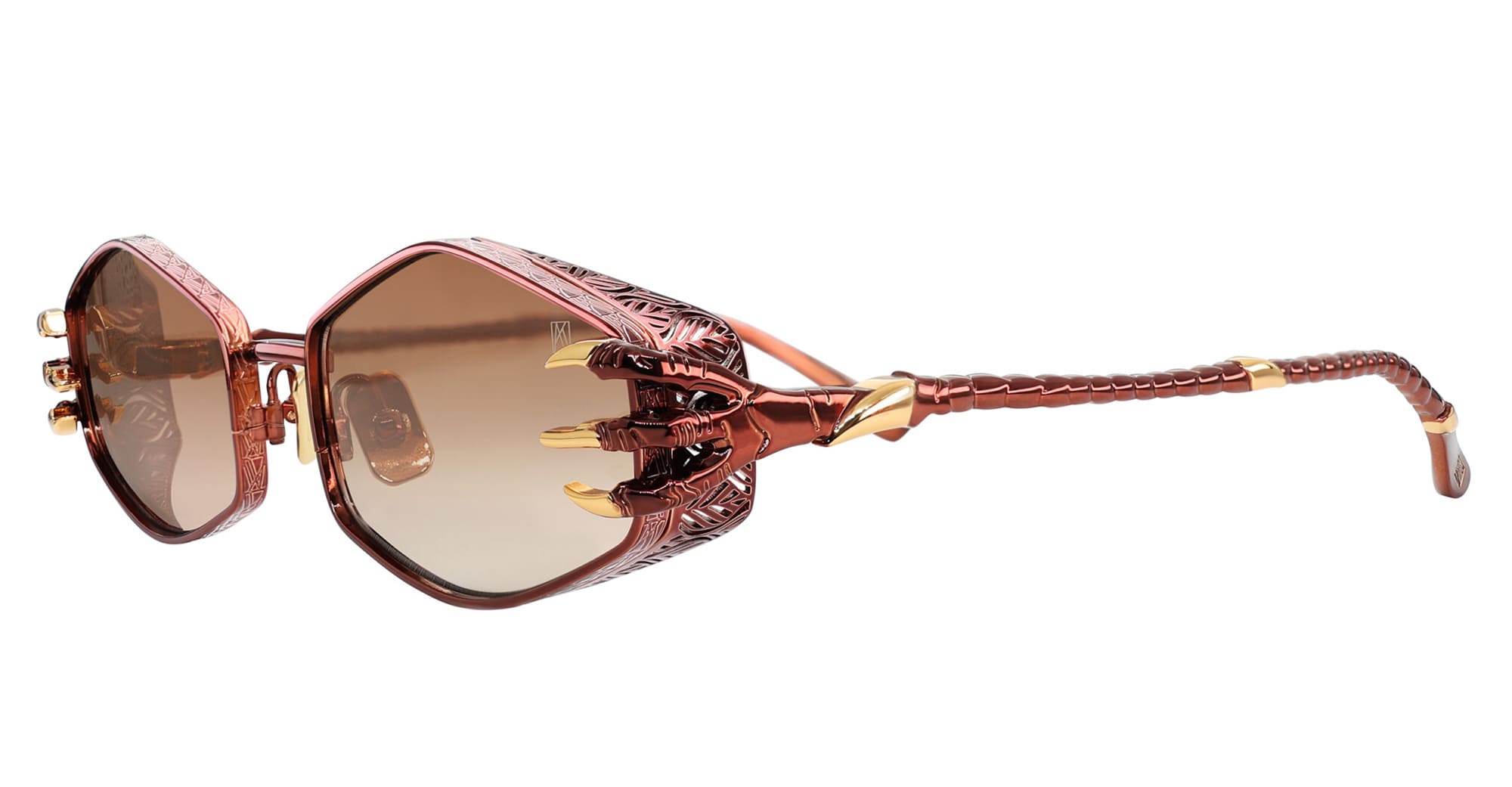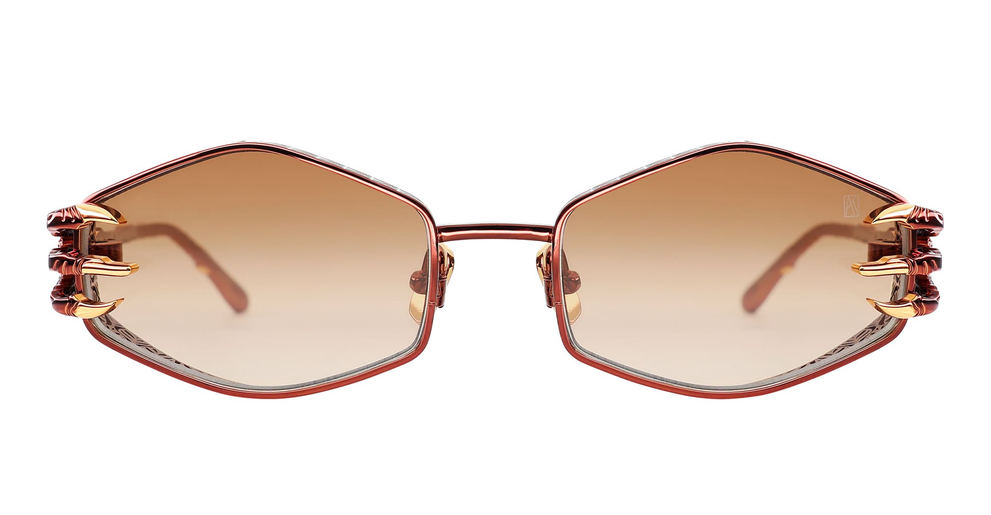 Anna-Karin Karlsson CLAW PLUME - COCOA (S252-8807) are luxurious, feminine hexagonal sunglasses, part of the exclusive Anna-Karin Karlsson eyewear collection. They feature brown and gold-plated titanium structure with claw detail, custom nose pads, titanium temples with intricated details, brown gradient Zeiss lens engraved with AKK logo and 100% UV protection.