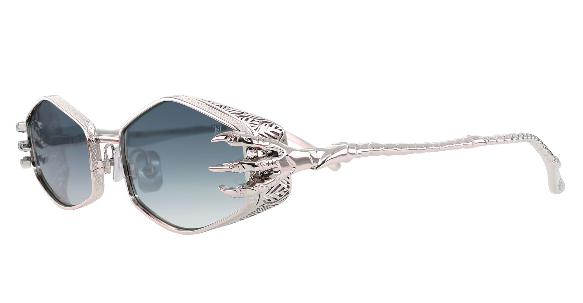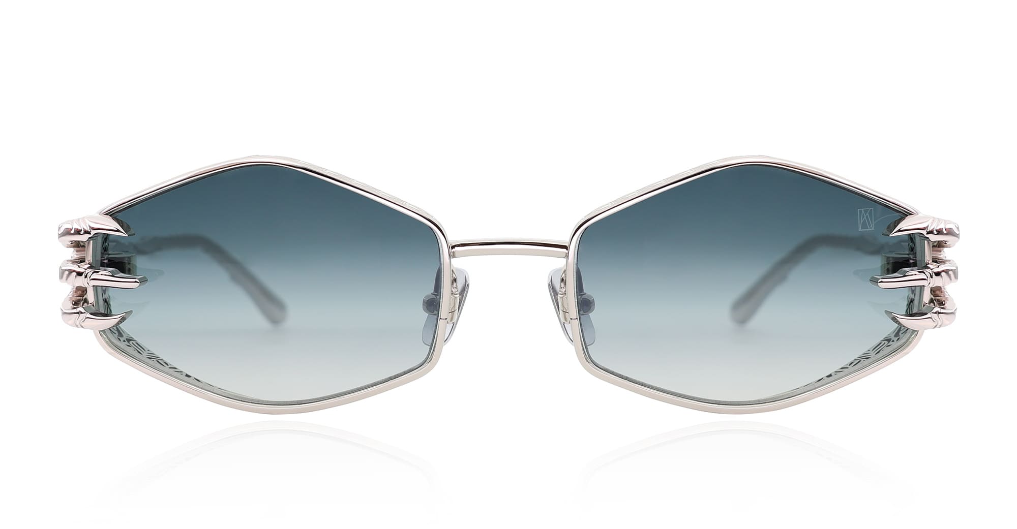 Anna-Karin Karlsson CLAW PLUME - WHITE GOLD (S252-8802) are luxurious, feminine hexagonal sunglasses, part of the exclusive Anna-Karin Karlsson eyewear collection. They feature white gold-plated titanium structure with claw detail, custom nose pads, titanium temples with intricated details, radient blue Zeiss lens engraved with AKK logo and 100% UV protection.