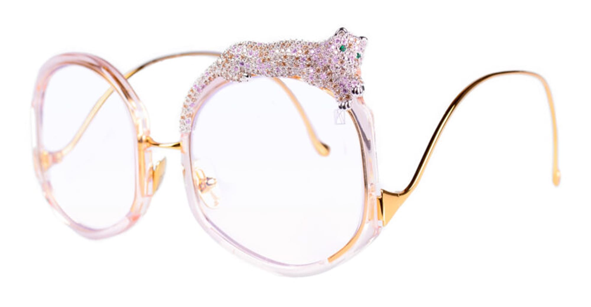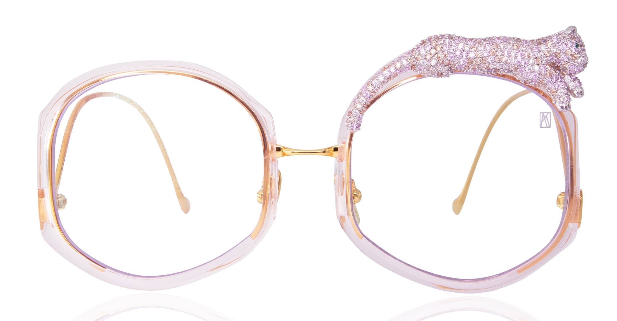Anna-Karin Karlsson ROSE ET LE REVE - HOT PINK RX (0201-2004) are luxurious, feminine octagonal eyeglasses, part of the exclusive Anna-Karin Karlsson eyewear collection. They feature transparent pink acetate front with a zirconia crystal encrusted panther, integrated nose pads, and gold-plated steel curved temples.