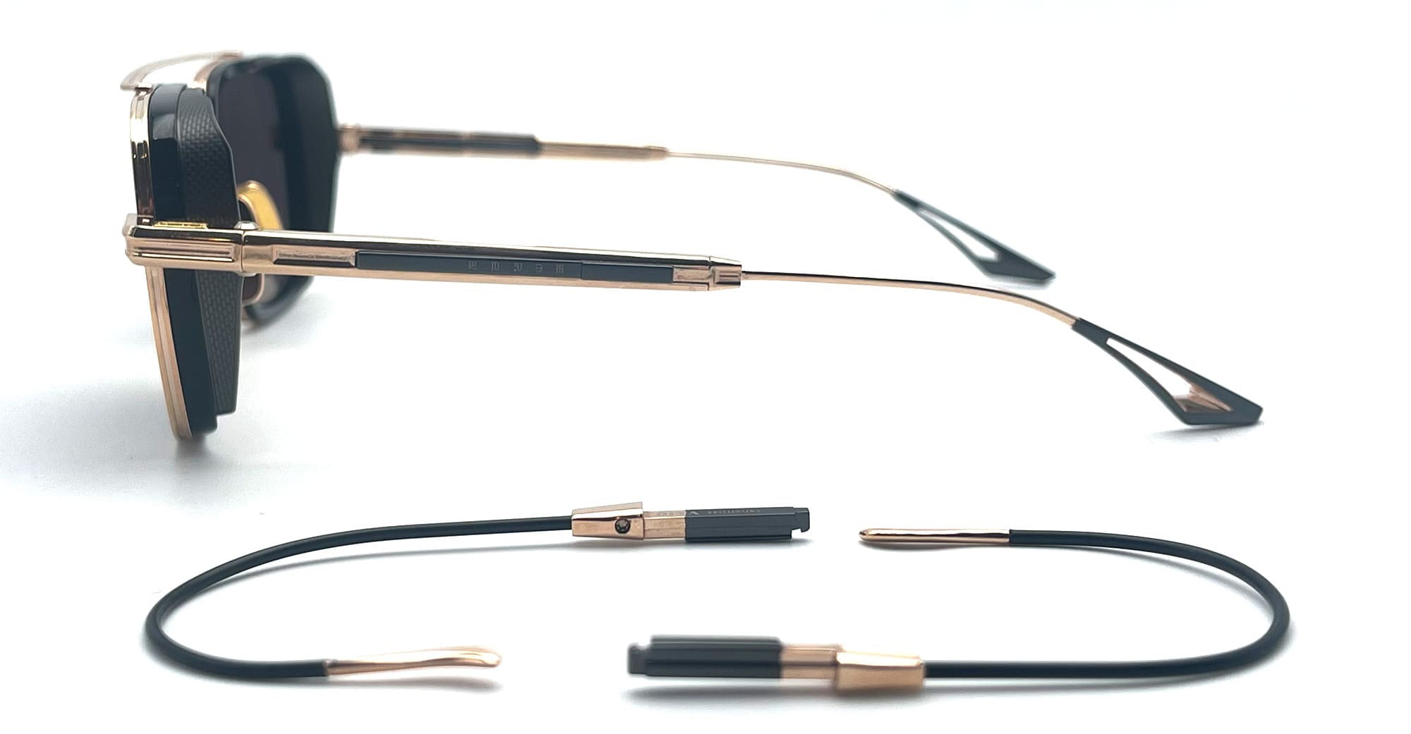 DITA EPILUXURY 8 - ROSE GOLD / BLACK IRON (DES008-A-06) are limited edition navigator sunglasses handmade in Japan. They feature high quality Japanese rose gold and black titanium and acetate construction, titanium double bridge, titanium side shields with pressesd details, custom Dita's spring hinge, interchangeable temple system, and dark grey polarizes mineral glass lens with 100% UV protection. It comes with additional cable temples.