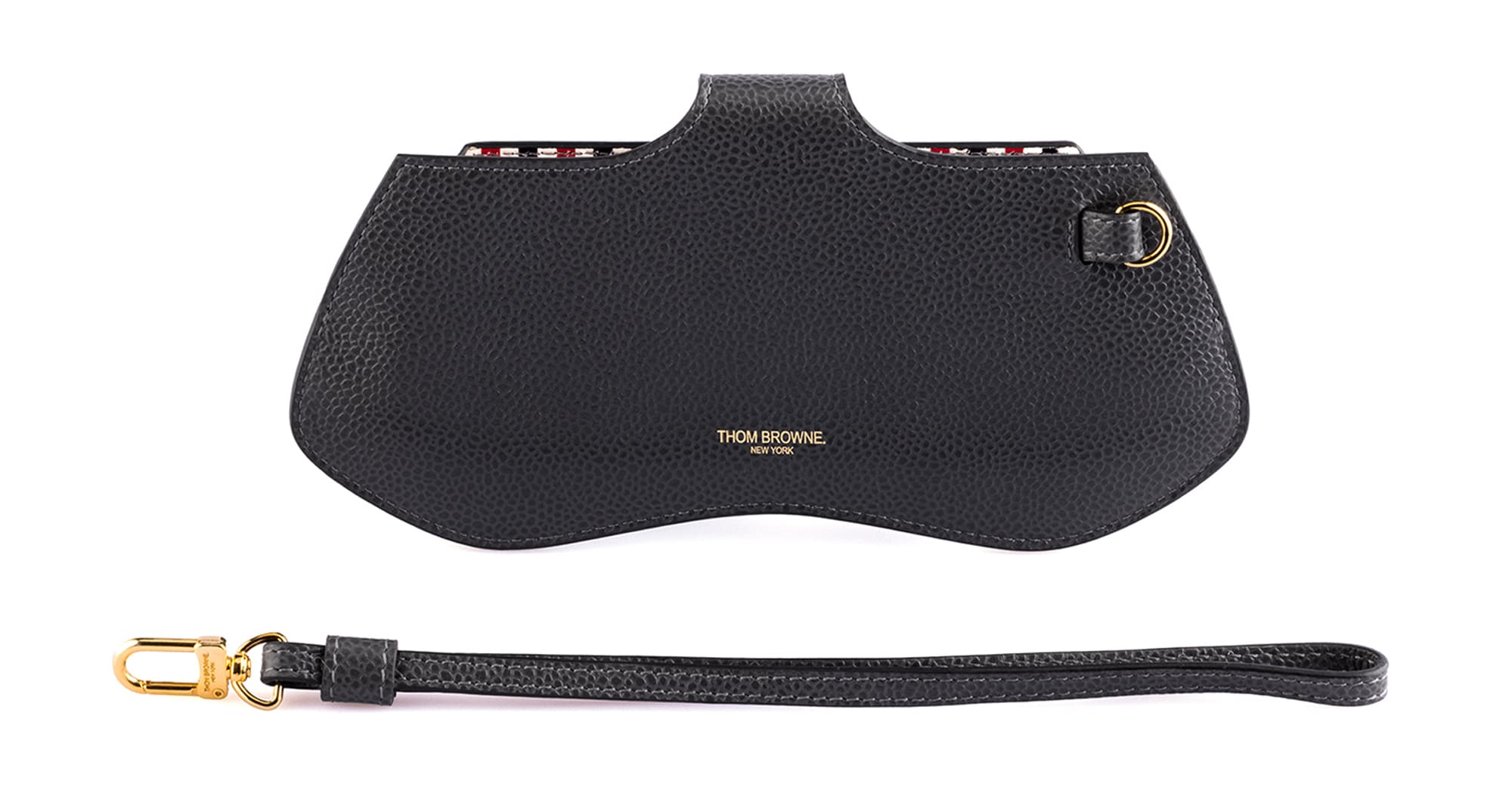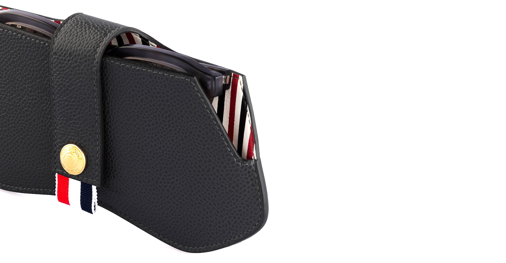 Thom Browne EYWEAR LEATHER CASE - DARK GREY (UAC058A-00198-025) is an elegant eyewear case crafted in Italy. It features dark grey pebble grain cow leather, 24k gold half-dome snap button with embossed Thom Brown logo, detachable leather wrist strap. The internal design has a cotton pattern with the Thom Browne iconic stripes. Perfect to keep your sunglsses or eyeglasses always profected.