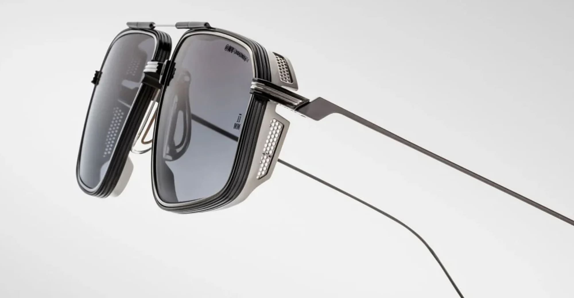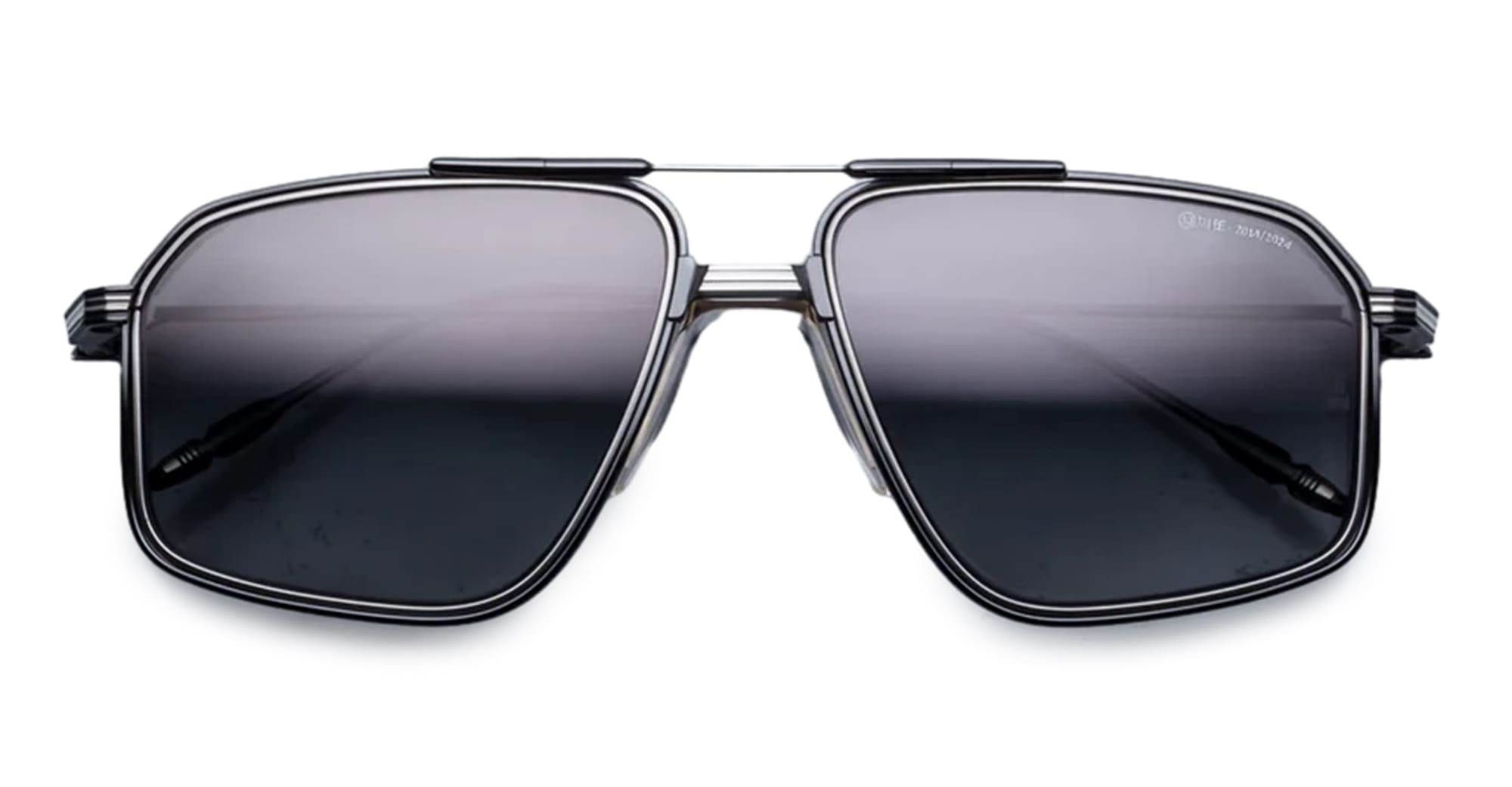 Jacques Marie Mage DECADE COLLECTION: JAGGER - DECADE (JMMJG-10Y1) are oversized late '70s-inspired aviator sunglasses with sculptural Art Deco-inspired double bridge, re-imagined for the JMM's The Decade Collection. They feature silver 100% beta titanium frame with black accent, unique 6mm titanium lens-rim inserts, extended eyeshields with sculptural cut-outs, custom monoblock hinge construction, custom nose pads, signature hand-painted epoxy tailfin temple tips, gradient grey polarized glass lens with backside anti-reflective treatment and 100% UV protection.