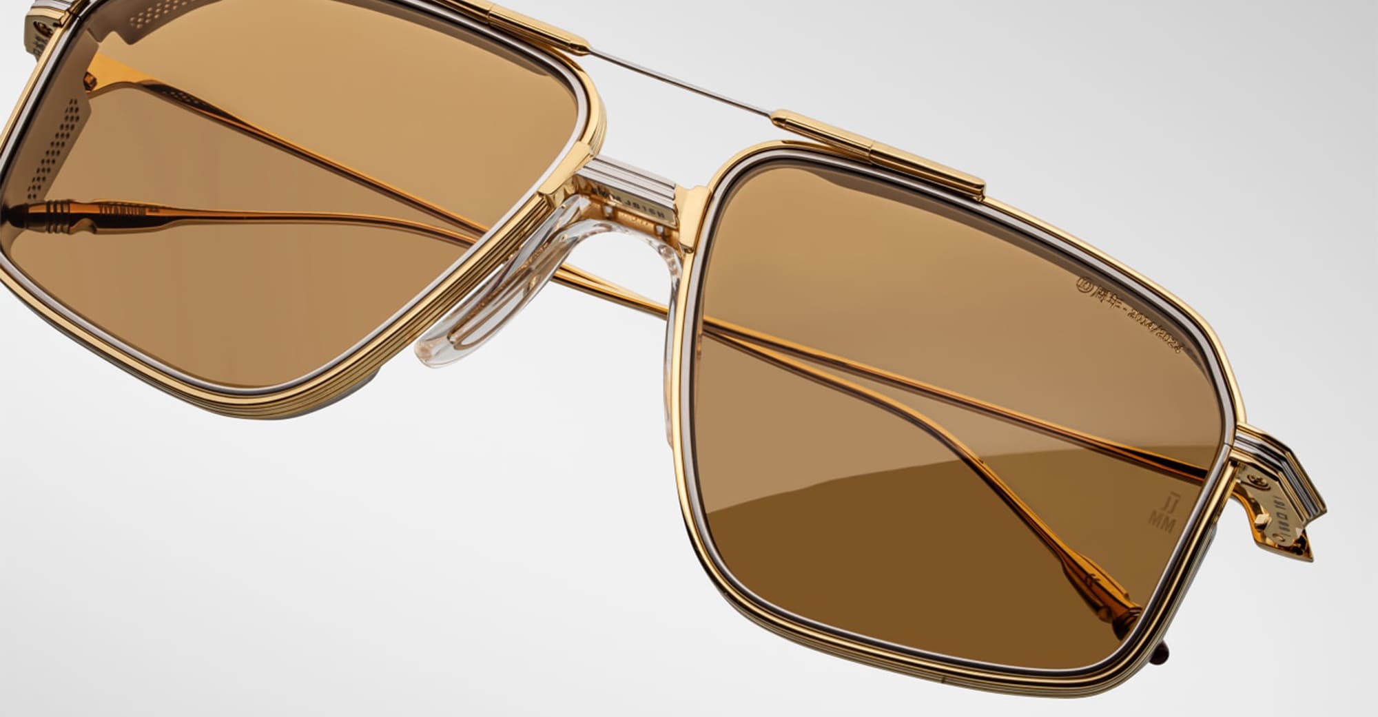 Jacques Marie Mage DECADE COLLECTION: JAGGER - ROMA (JMMJG-16H) are oversized late '70s-inspired aviator sunglasses with sculptural Art Deco-inspired double bridge, re-imagined for the JMM's The Decade Collection. They feature moon gold 100% beta titanium frame with silver accent, unique 6mm titanium lens-rim inserts, extended eyeshields with sculptural cut-outs, custom monoblock hinge construction, custom nose pads, signature hand-painted epoxy tailfin temple tips, honey glass lens with backside anti-reflective treatment and 100% UV protection.