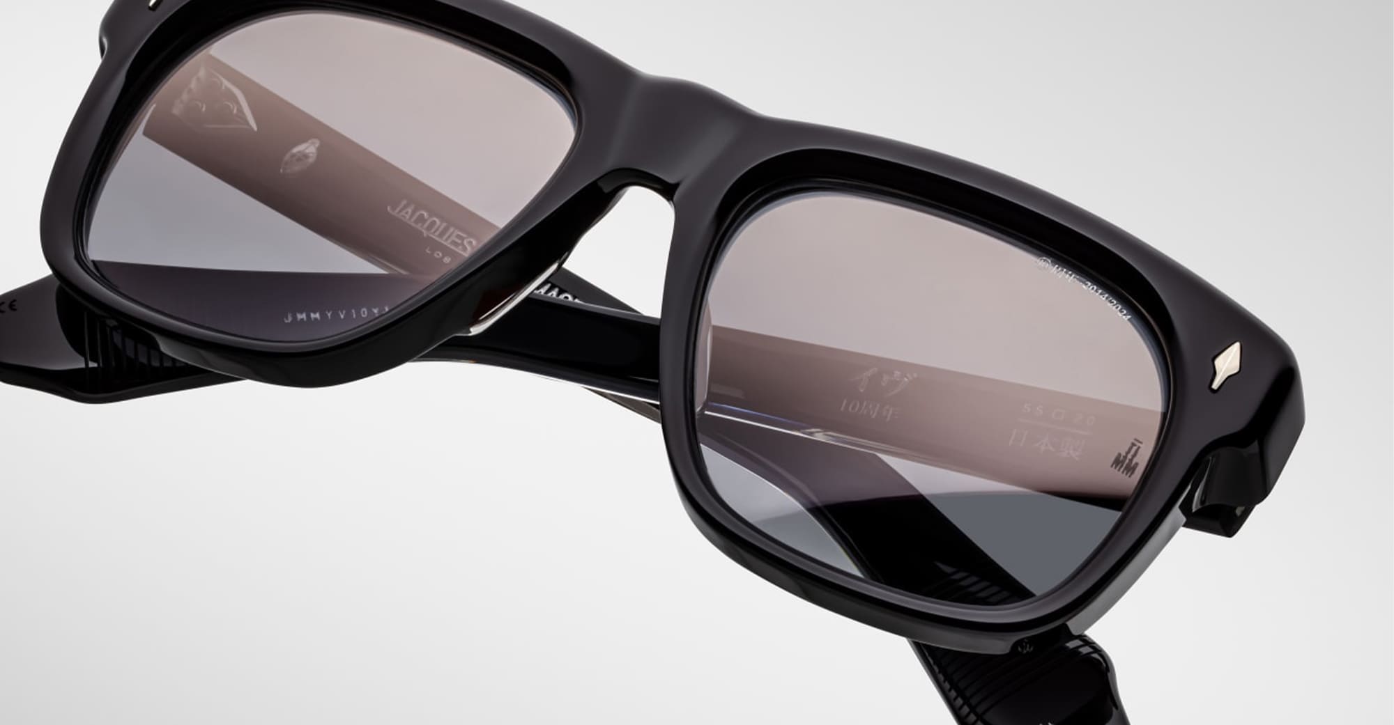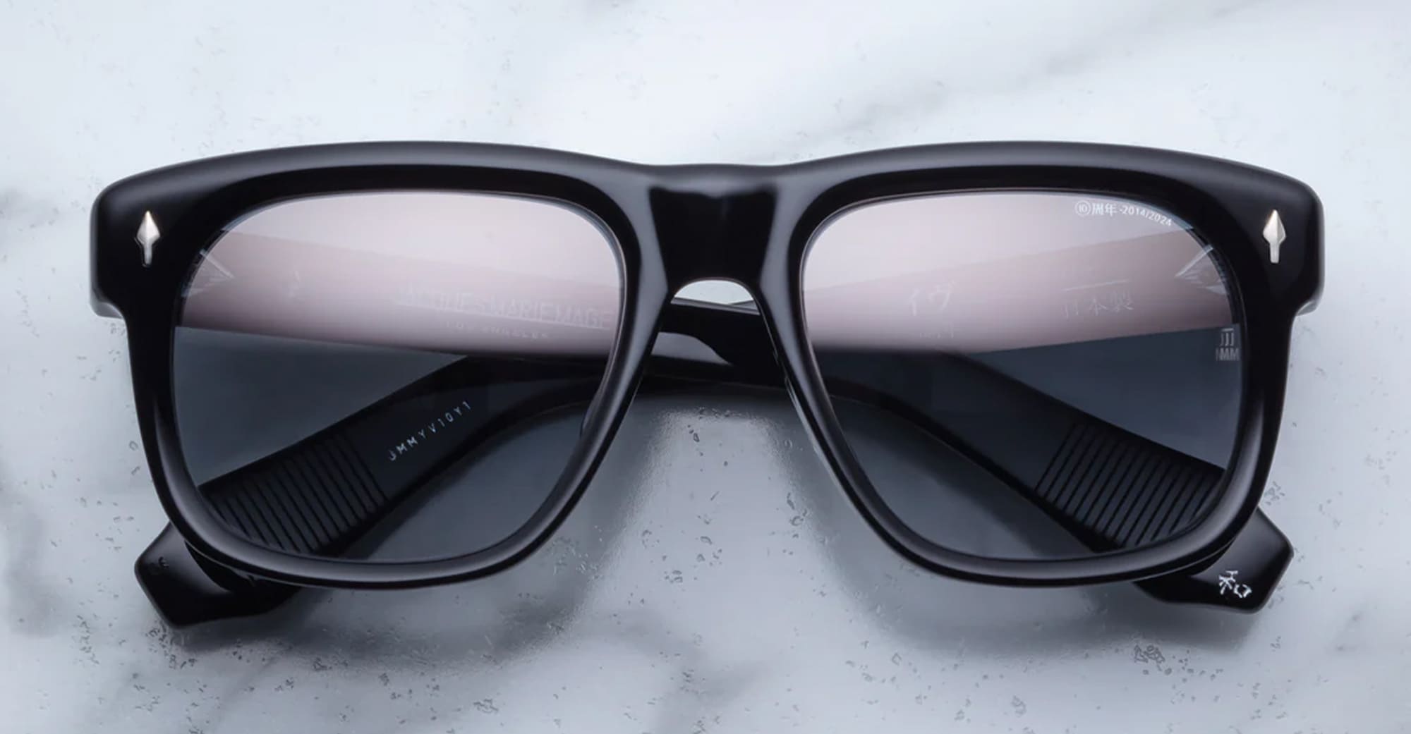 Jacques Marie Mage DECADE COLLECTION: YVES - DECADE (JMMYV-10Y1) are squared sunglasses with soft lens shape, inspired by the iconic frames worn worn by Yves Saint Laurent during the '70s - re-imagined for the JMM The Decade Collection. They feature a thicker 12mm black cured cellulose acetate frame, custom sterling silver arrowhead front pins designed with additional volume, custom double laminated temples with exposed 'Decade' wirecore and polished metal plaques with special 10 marking, tension-secured custom 7 barrel hinge, gradient grey 4 base CR39 lens with backside anti-reflective treatment and 100% UV protection.
