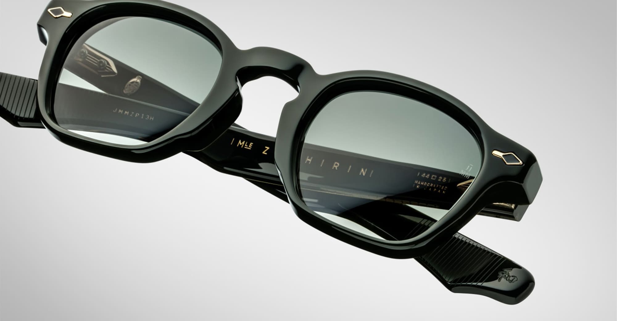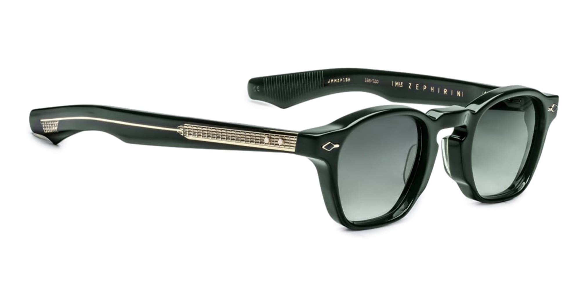 Jacques Marie Mage ZEPHIRIN EPOXY - SACRAMENTO (JMMZP-13H) are squared sunglasses with a distinctive pre-WWII sizing, a re-imagined version from Jacques Marie Mage Epoxy Collection. They feature a green 10mm cured cellulose acetate frame, custom double laminated sculpted acetate temples, dark gold custom arrowhead front pins with dark green epoxy inlay, exposed wirecore with 'baguette' pattern, tension-secured custom 5 barrel hinge, emerald green gradient CR39 6 base lens with anti-reflective treatment and 100% UV protection.