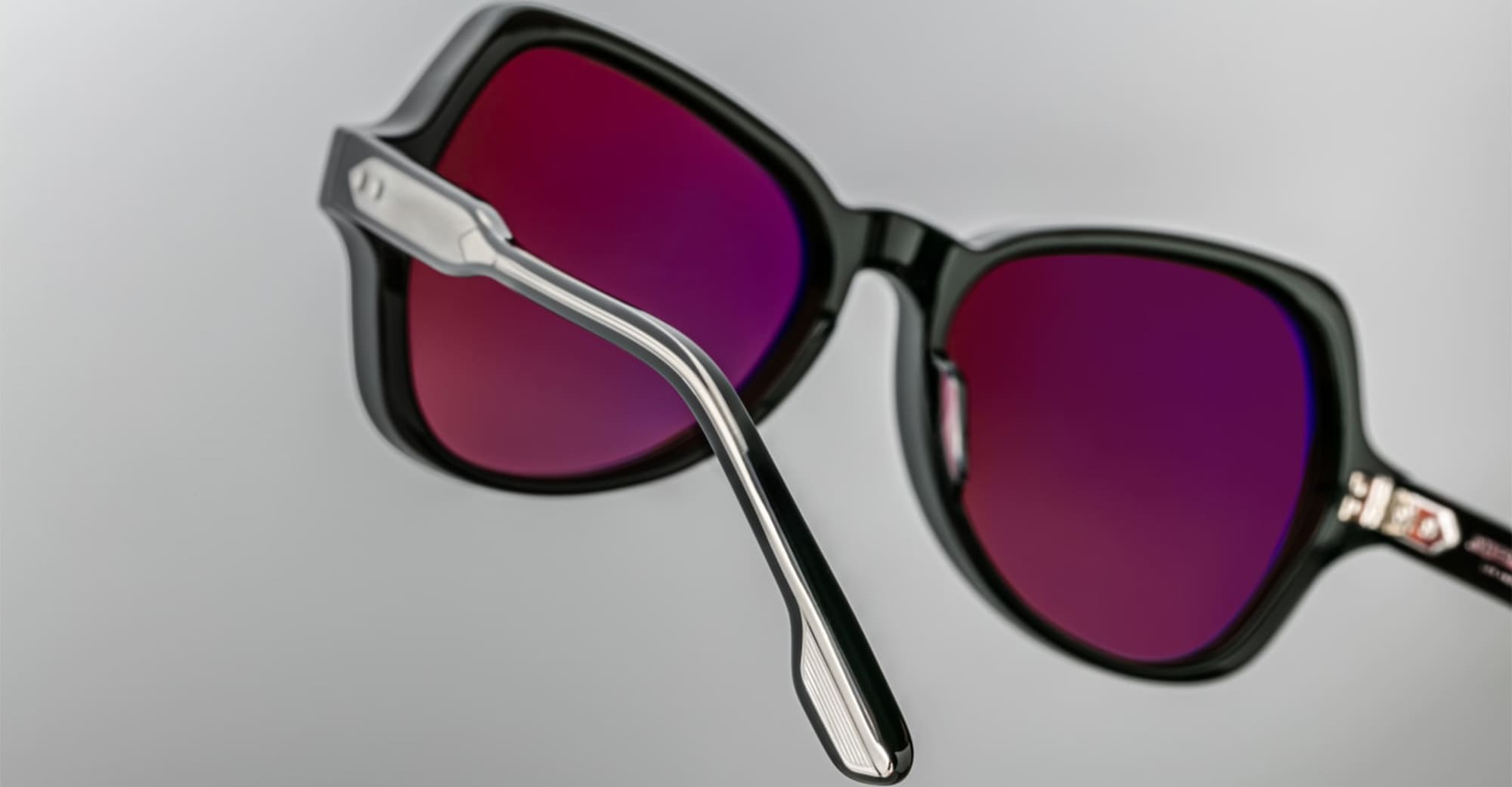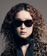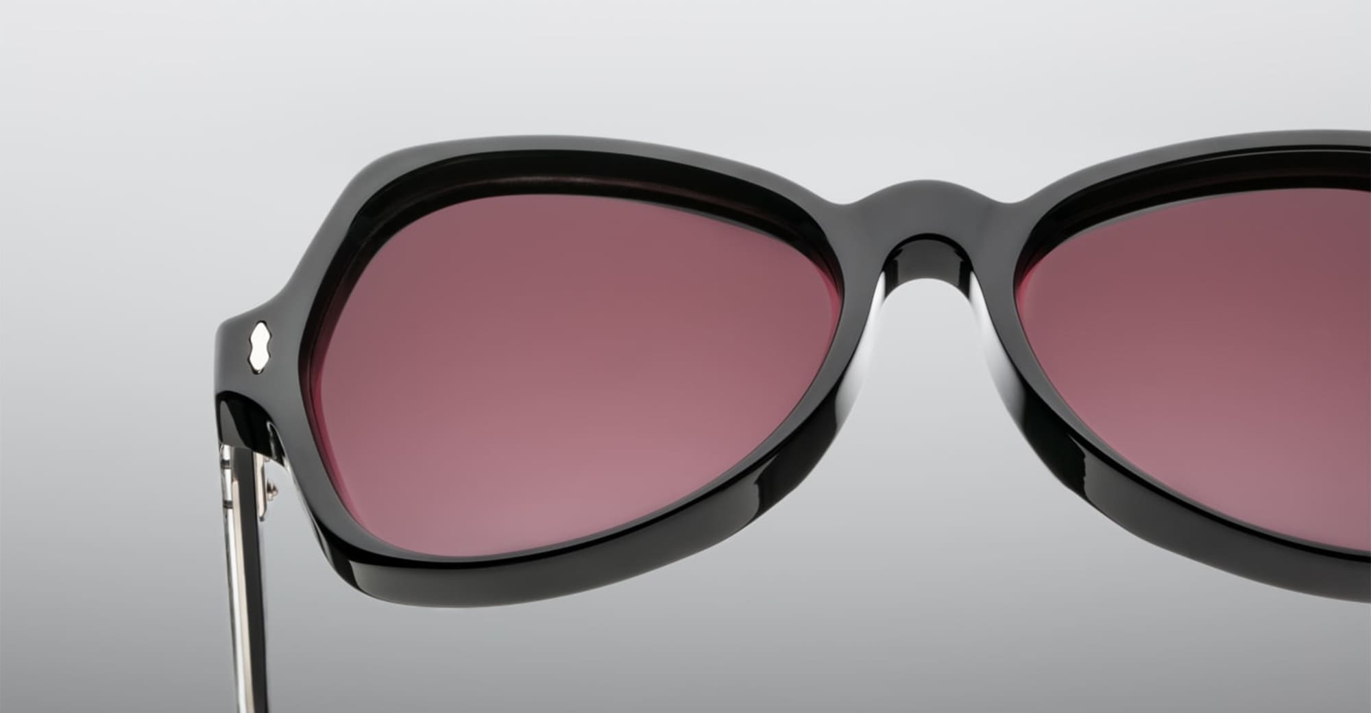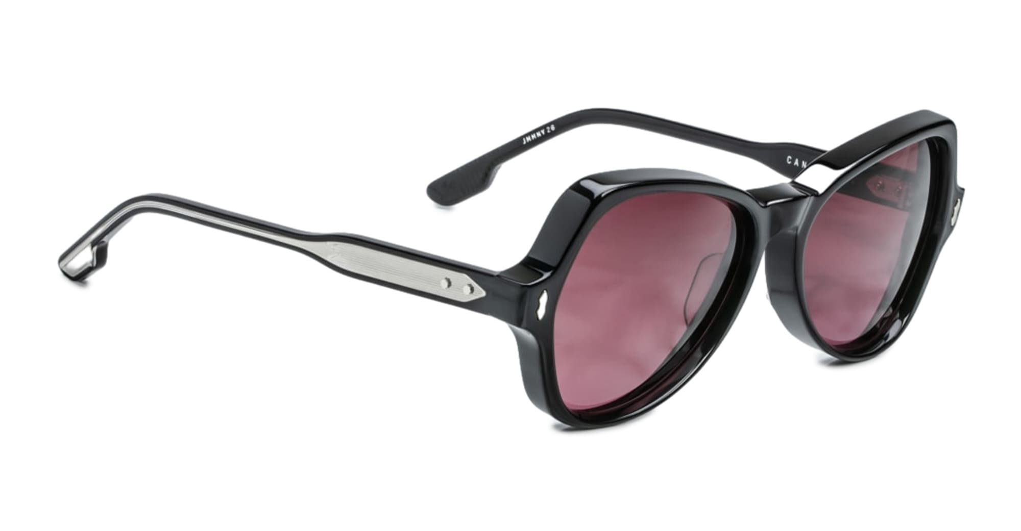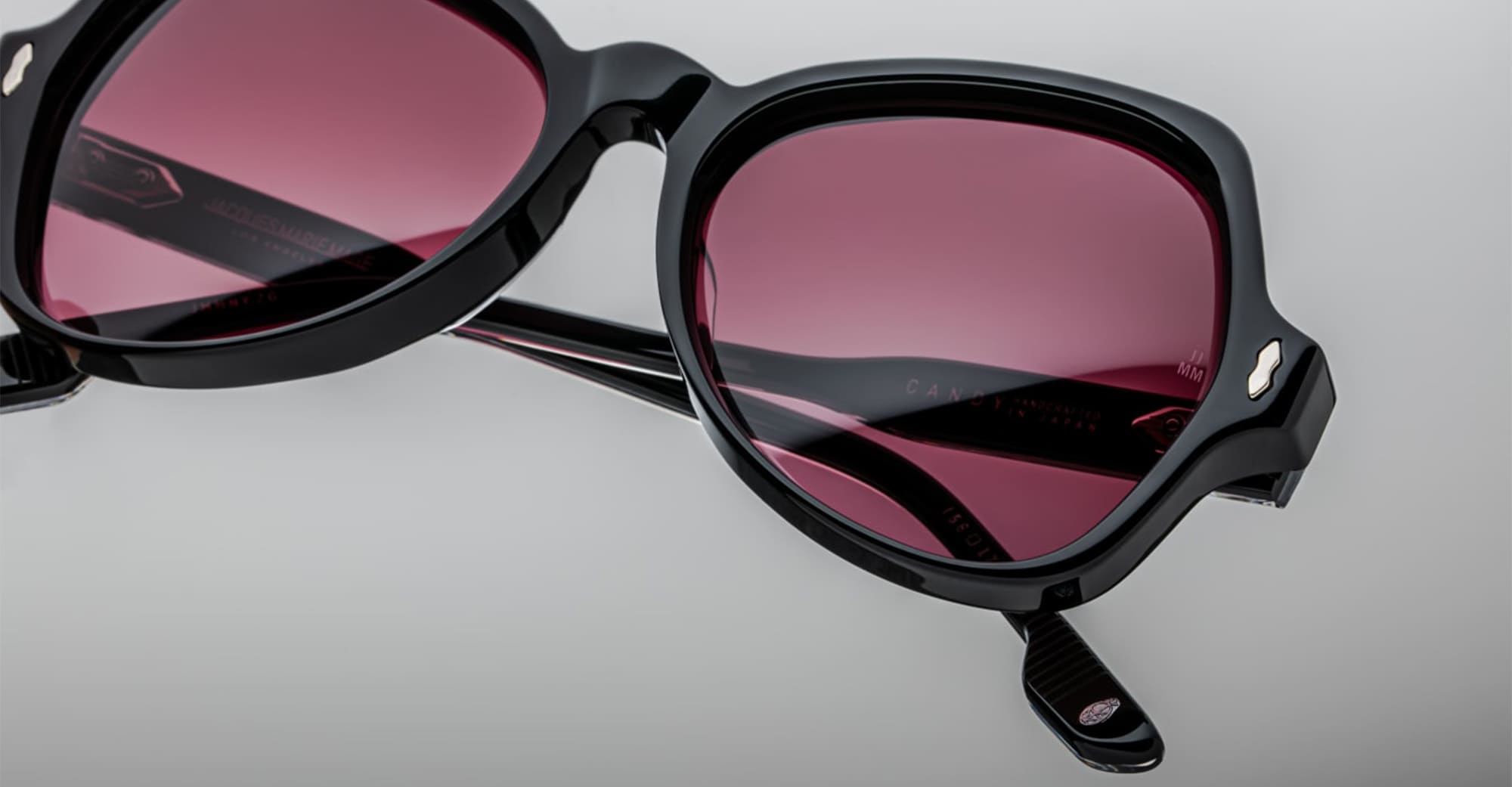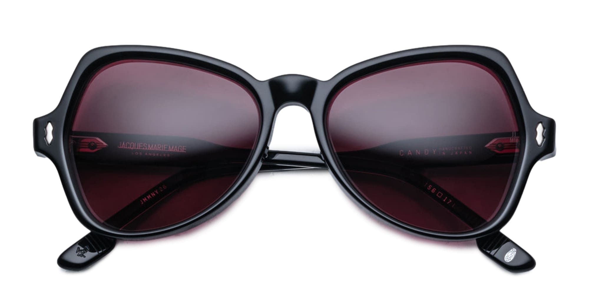 Jacques Marie Mage CANDY - SHADOW (JMMNY-26) are early '80s-inspired butterfly sunglasses and a slim silhouhette, handcrafted in Japan. They feature black 10mm cured cellulose acetate frame, custom acetate temple, signature sterling silver double-arrowhead front pins, exposed Vauxhall wirecore, tension-secured custom 5 barrel hinge, mohogany gradient green 4 base CR39 lens with backside anti-reflective treatment with 100% UV protection.