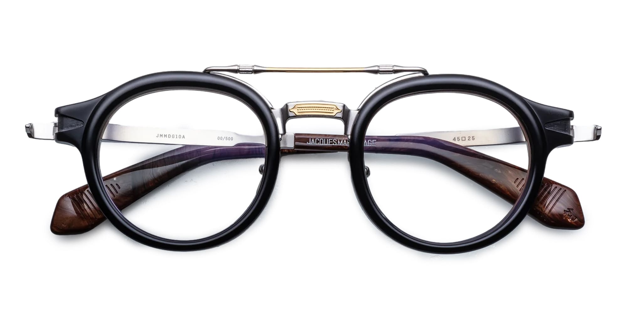 Jacques Marie Mage DELAGE - NOIR X RX (JMMDGRX-10A) are round eyeglasses made in Japan. They feature black acetate/titanium structure.
