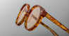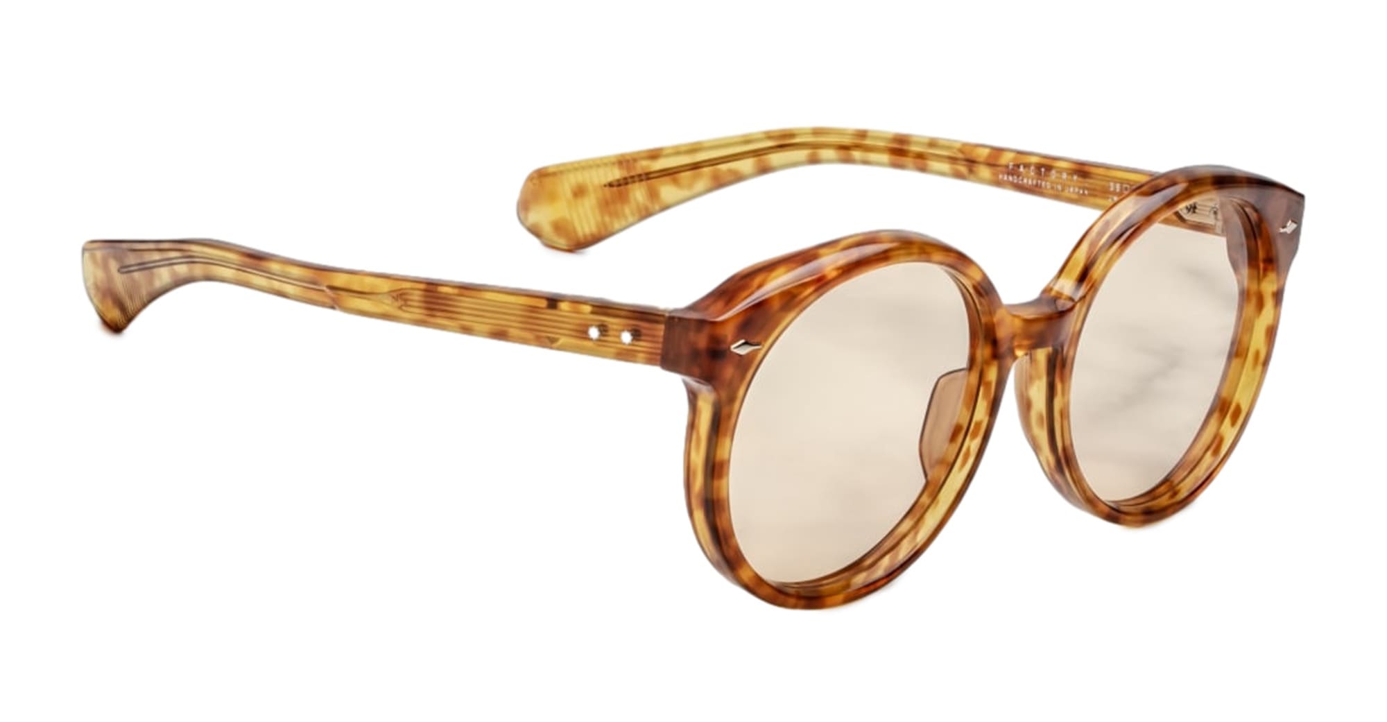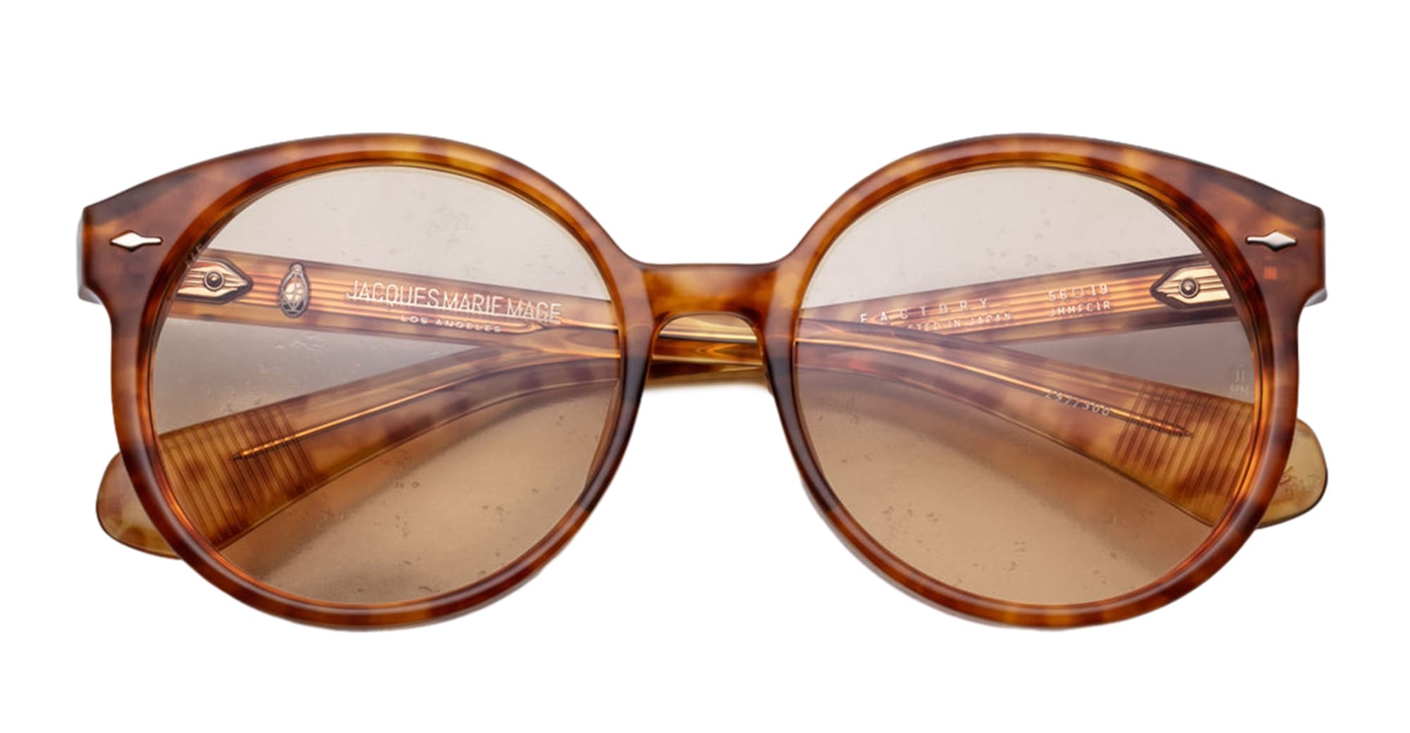 Jacques Marie Mage FACTORY - CAMEL (JMMFC-1R) are round pop-art inspired eyeglasses handcratfed Japan. They feature havana brown 10mm cured cellulose acetate frame, custom double laminated acetate temples featuring precious metal hardware, hidden wirecore, signature light gold horizontal arrowhead front pins, tension-secured custom 5 barrel hinge with spur-shaped rivets, yellow 4 base CR39 lens with backside anti-reflective treatment, and 100% UV protection.