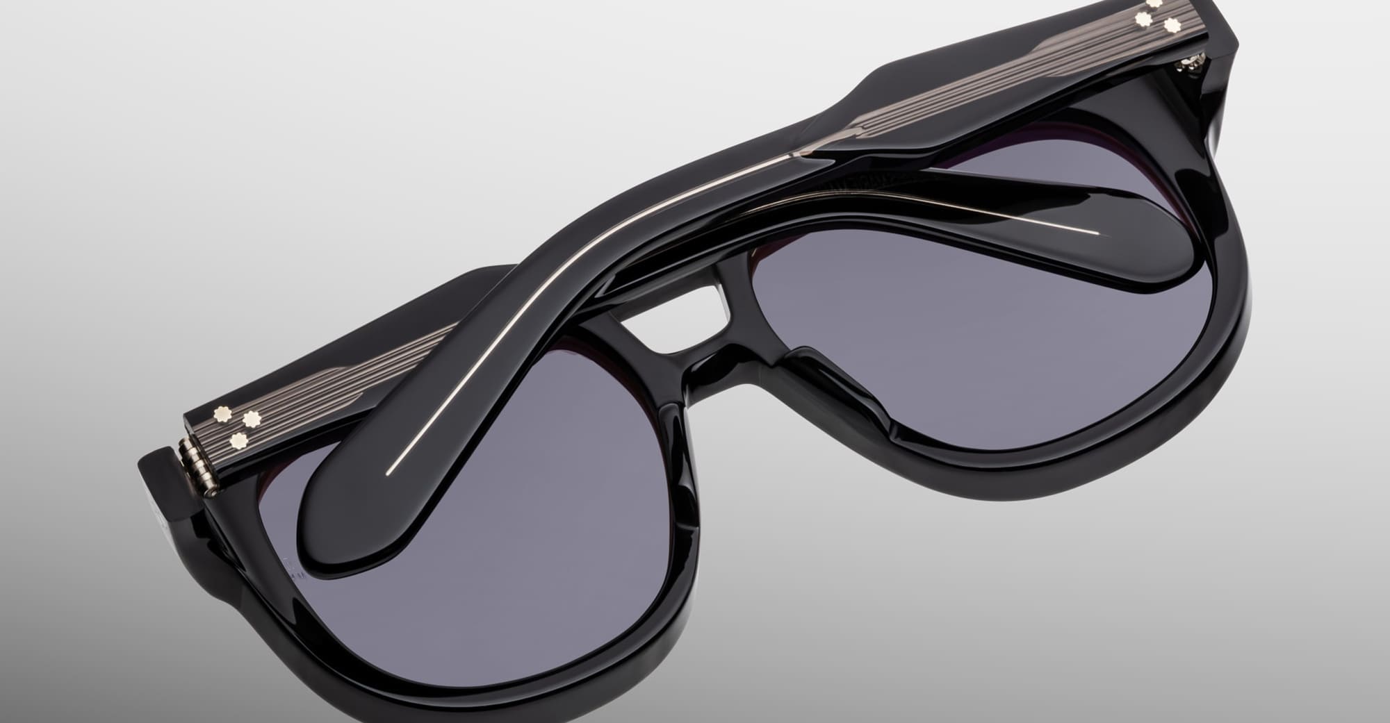 Jacques Marie Mage JASPER - RAVEN (JMMJA-58) are unisex 70s-inspired aviators with a medium fit. They feature black 8mm cured cellulose acetate frame, custom double laminated temples with precious metal hardware, tension-secured custom 7 barrel hinge, exposed wirecore, tension-secured custom 7 barrel hinge, charcoal 4 base CR39 lens with backside anti-reflective treatment and 100% UV protection.