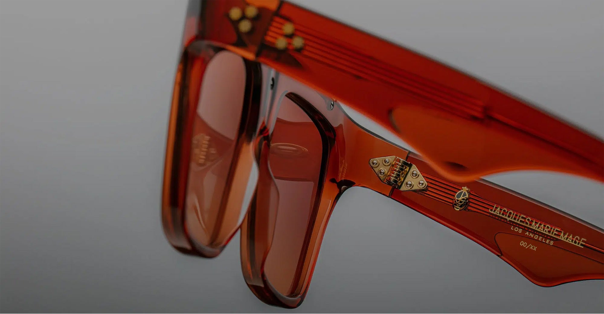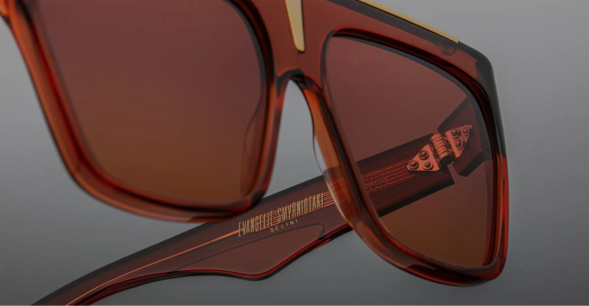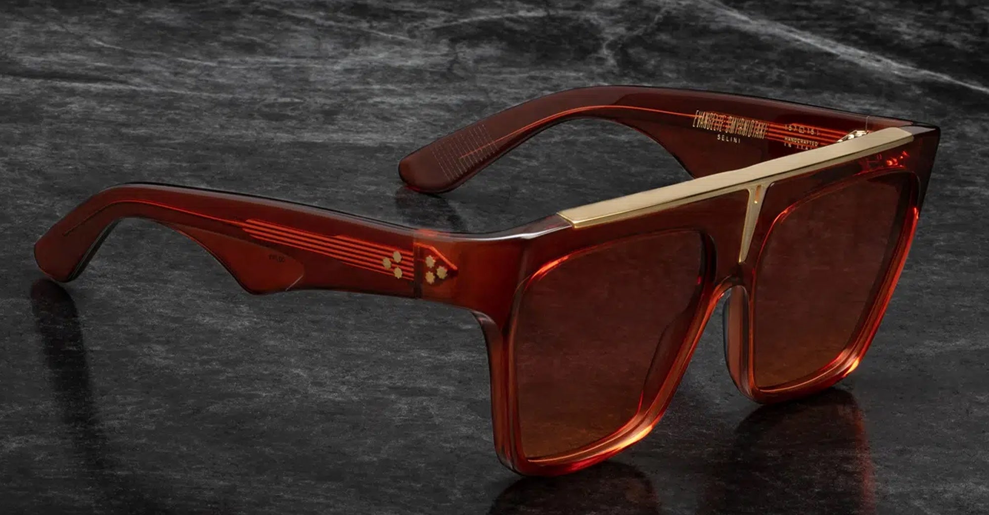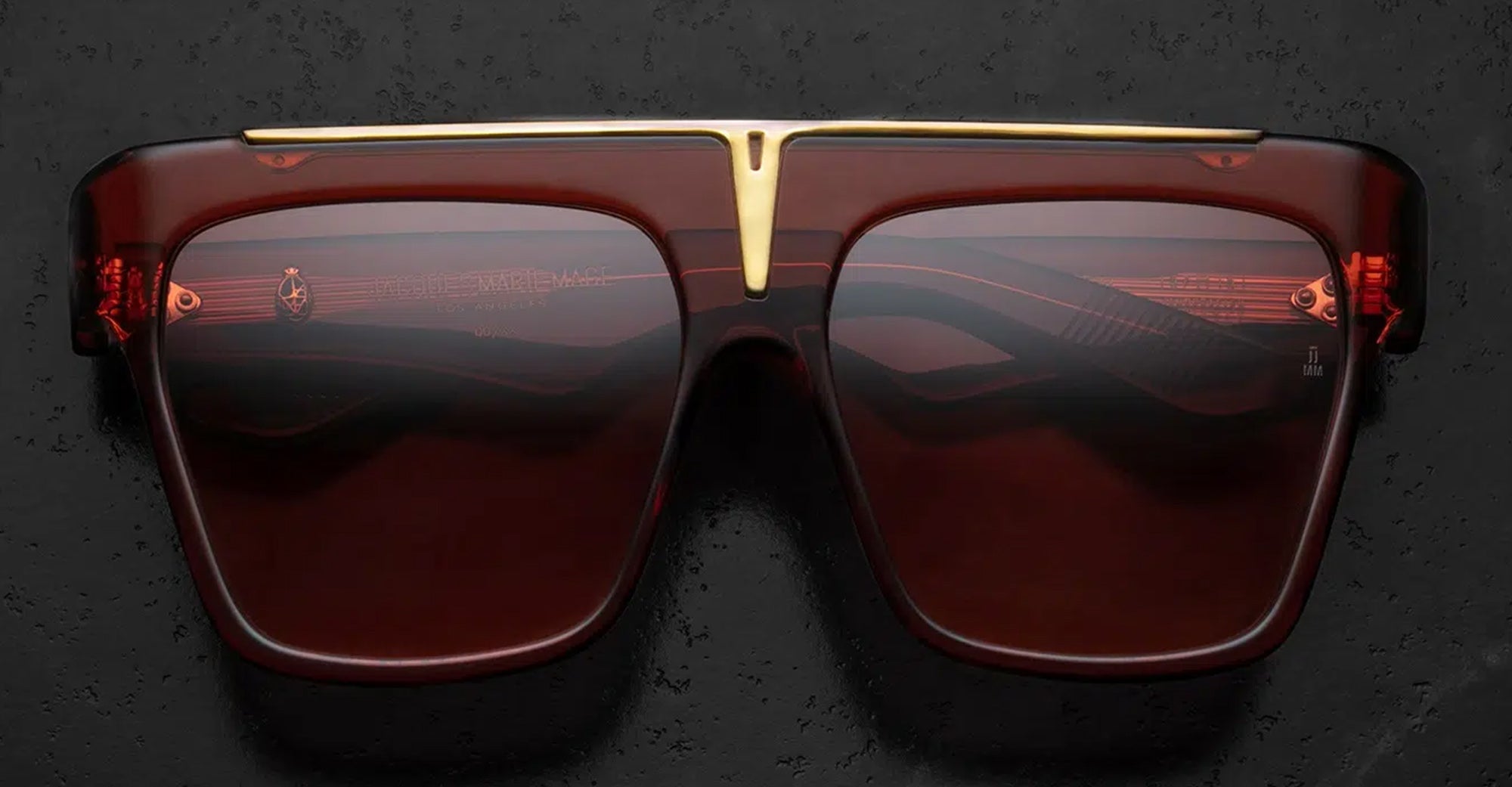 Jacques Marie Mage SELINI - UMBER (JMMSEL-3B) are bold and balanced navigators sunglasses, a limited-edition expression of the EVANGELIE SMYRNIOTAKI BY JMM collection. They feature 7mm cellulose acetare frame with custom temples and precious metal hardware, hidden wirecore with filigree engraving, tension-secured custom 7 barrel hinge, top bar metal insert, 2 base CR39 lenses with backside anti-reflective treatment and 100% UV protection.