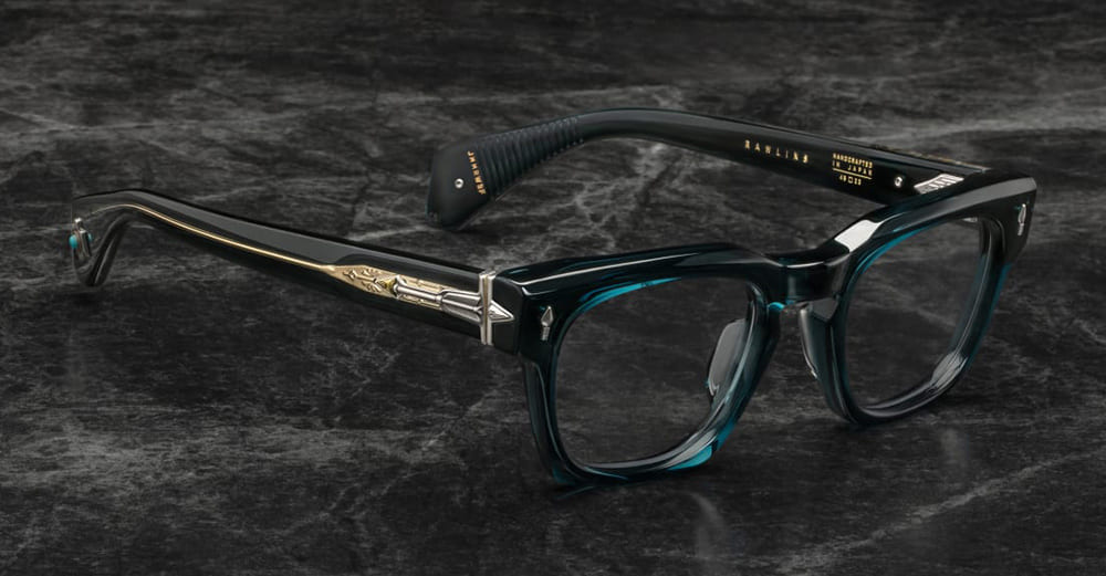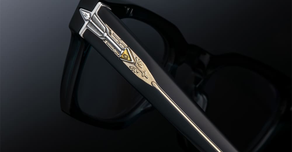 Jacques Marie Mage LAST FRONTIER V - RAWLINS - INDIGO RX (J-ERX-RW-T209F-OS) are refined eyeglasses inspired by the arts and cultures of the American southwest - part of the JMM Last Frontier Collection. They feature 10mm indigo blue cured cellulose acetate frame, custom double laminated acetate temples, sterling silver arrowhead front pins, dark gold and silver exposed wirecore with custom arrowhead temple decoration, tension-secured custom 7 barrel hinge, sterling silver thunderbird temple tip decoration with natural turquoise inlay.