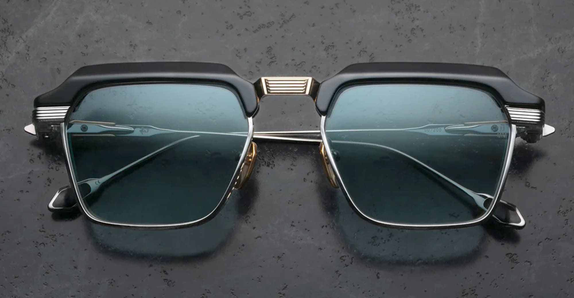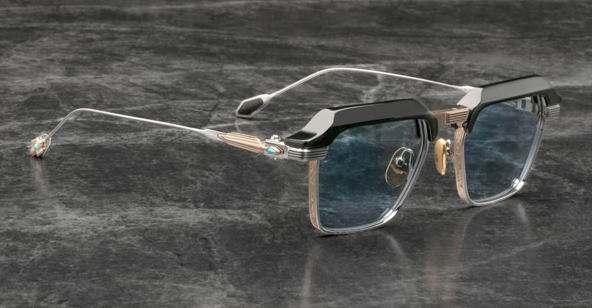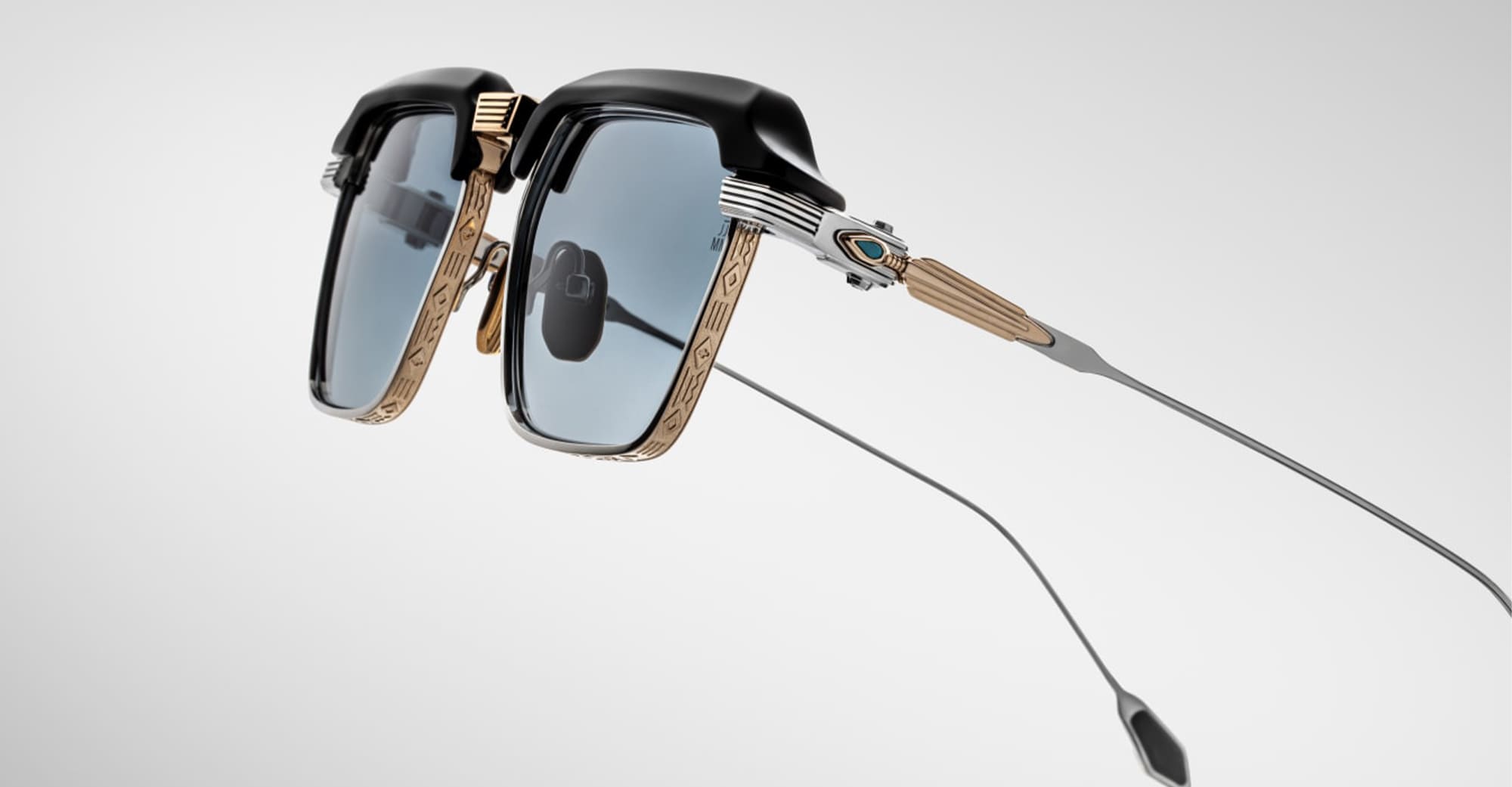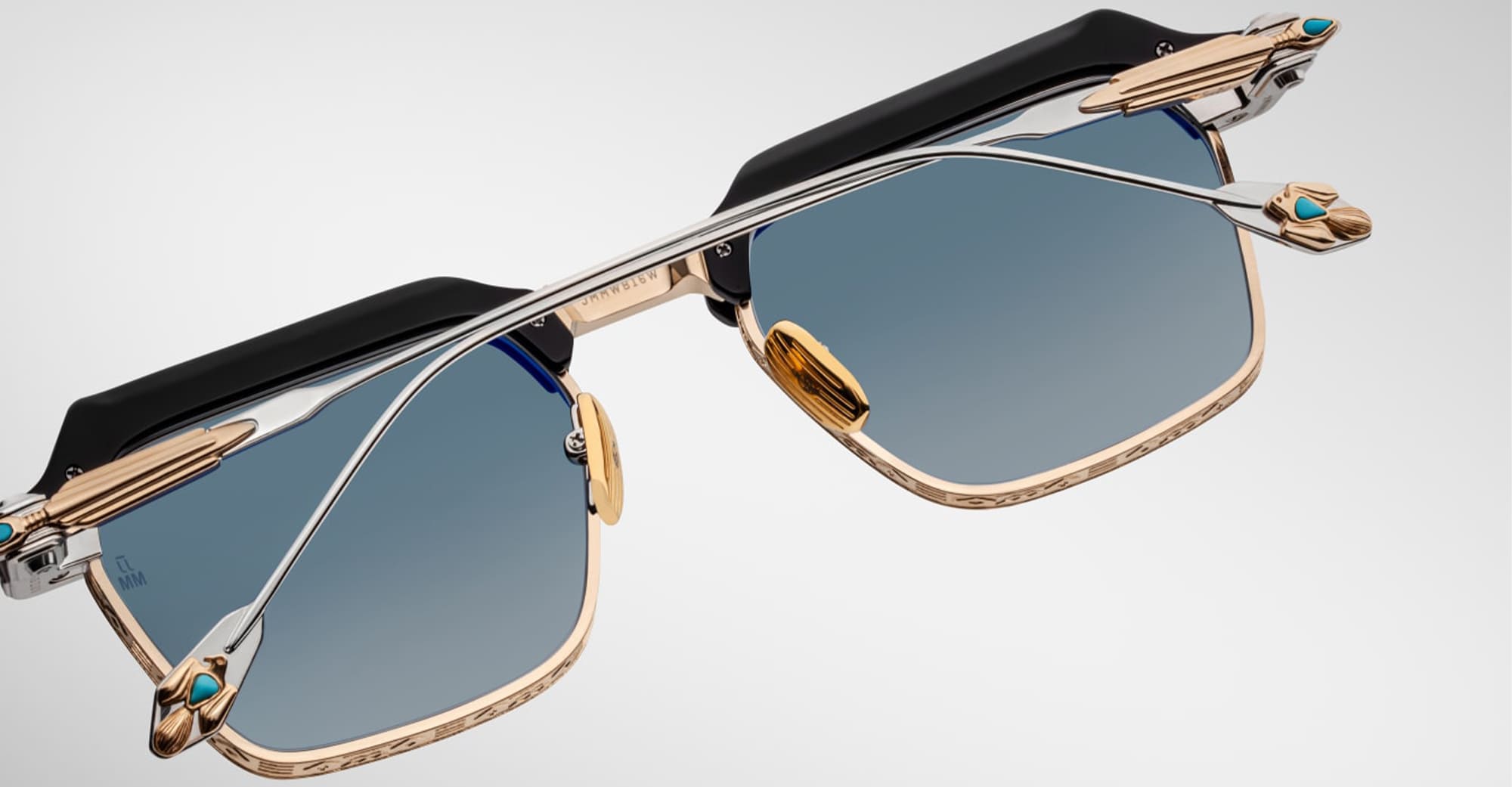 Jacques Marie Mage LAST FRONTIER VI - WORLAND- HADES (JMMWB-16W) are exclusive 50s-inspired squared clubmaster sunglasses - the first ever Last Frontier combo style. They feature silver and gold 100% beta titanium frame with a prominent black acetate top bar, finely-engraved eye rims, custom nose pads, tension-secured custom monoblock hinge, silver beta titanium temples with sculptural 18k gold-plated arrowhead temple motif complemented by polished thunderbird cameos - embellished with hand-shaped turquoise inlays, and gradient blue glass 4 base lens with backside anti-reflective treatment and 100% UV protection.
