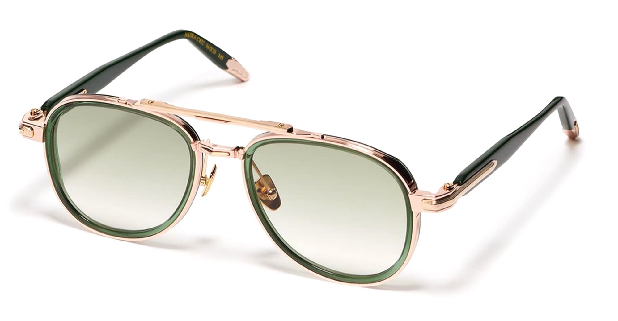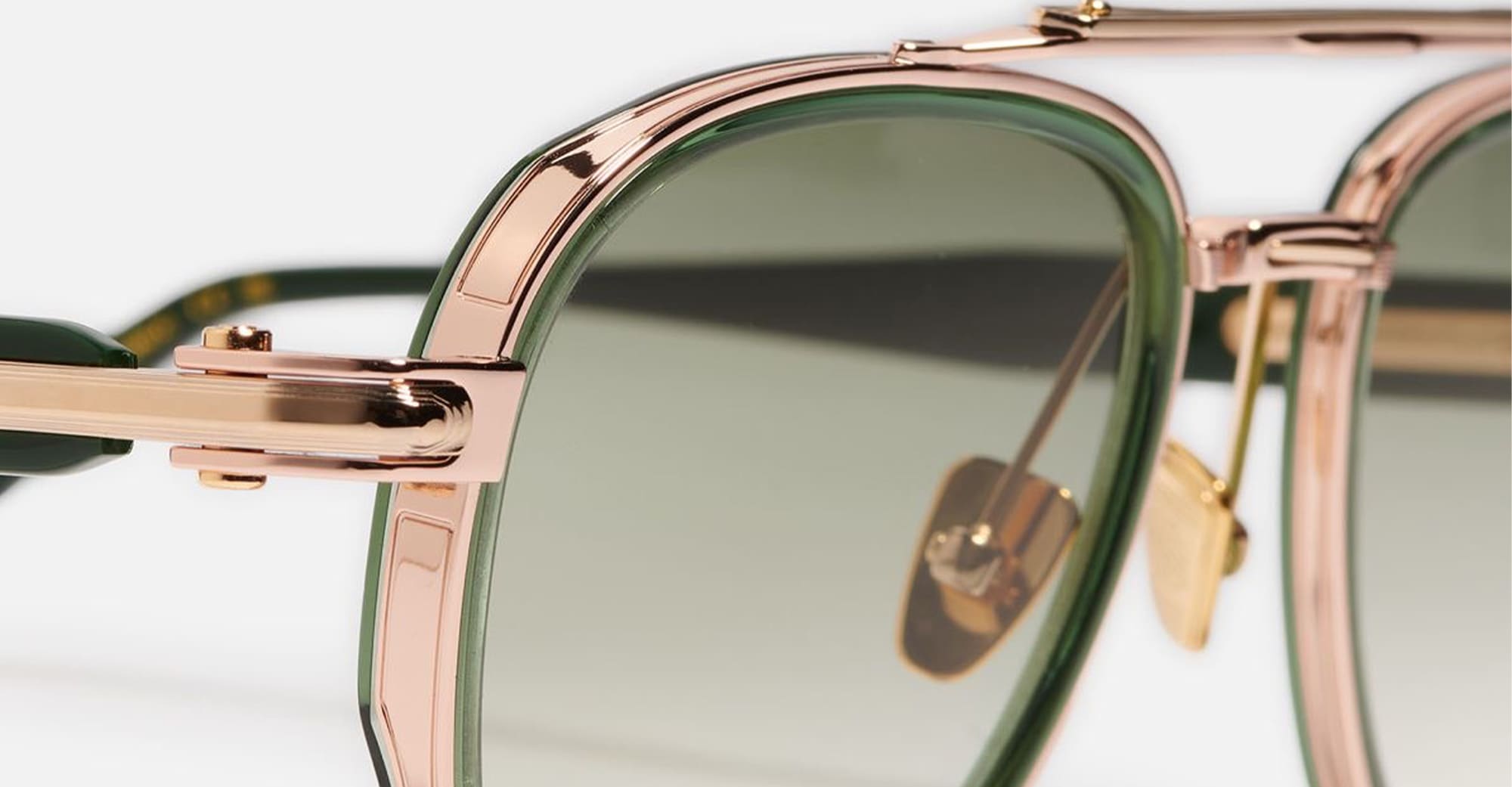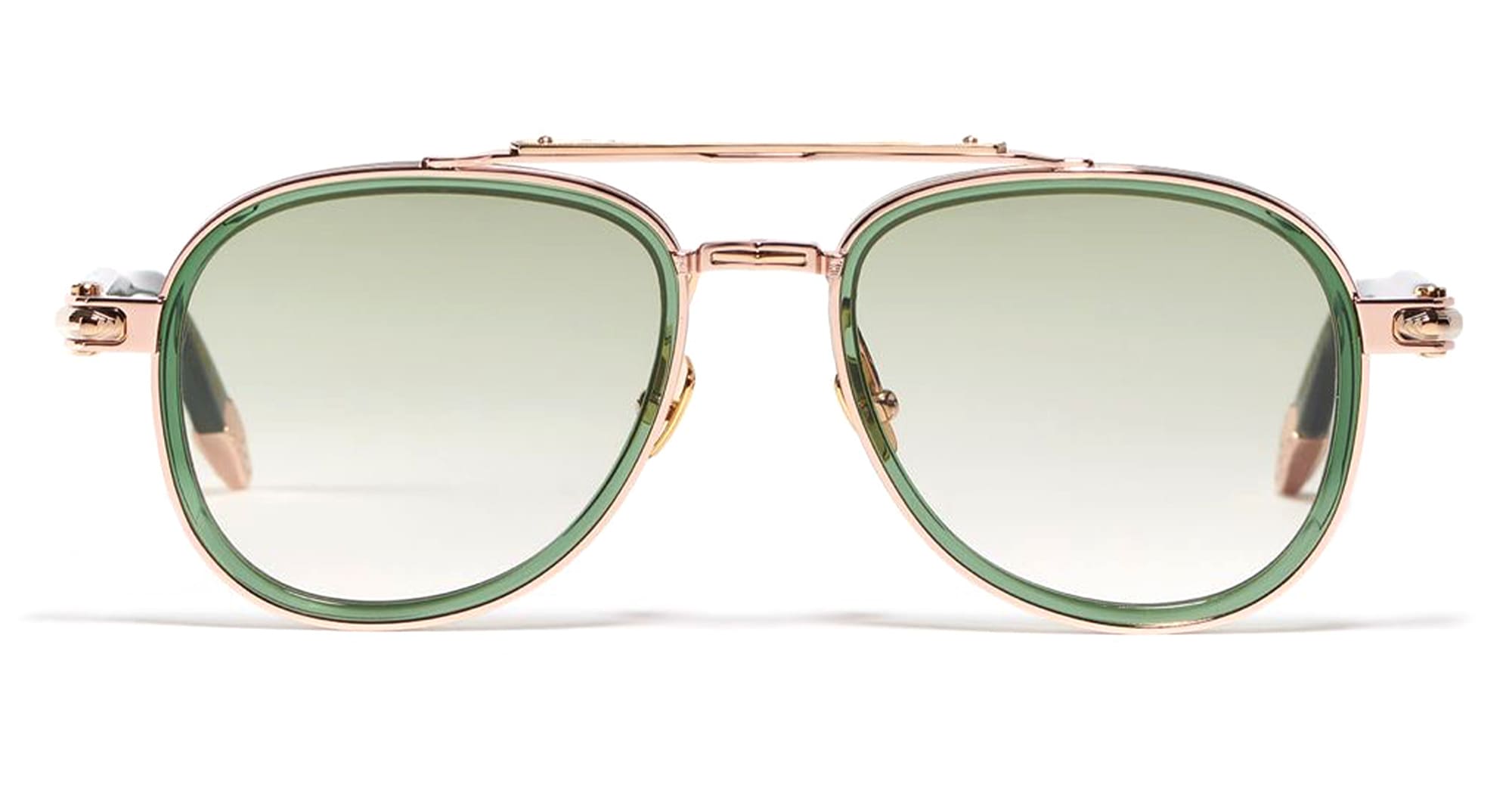 John Dalia AKIRA - C432 DARK GREEN TRANSLUCID / ROSE GOLD (AKIRA-C432) are unisex aviator sunglasses combining, titanium, metal and acetate elements, part of the exclusive John Dalia eyewear collection. They feature a rose gold titanium corewire structure with platinium plated decorative elements (3µ) and green acetate eyerims, black acetate temples with sculpted metal end tips, custom nose pads, double nose bridge, where the titanium nose pads are attached via a metallic extension, green gradient CR39 lenses with an anti-reflective coating on the inner surface, and 100% UV protection.