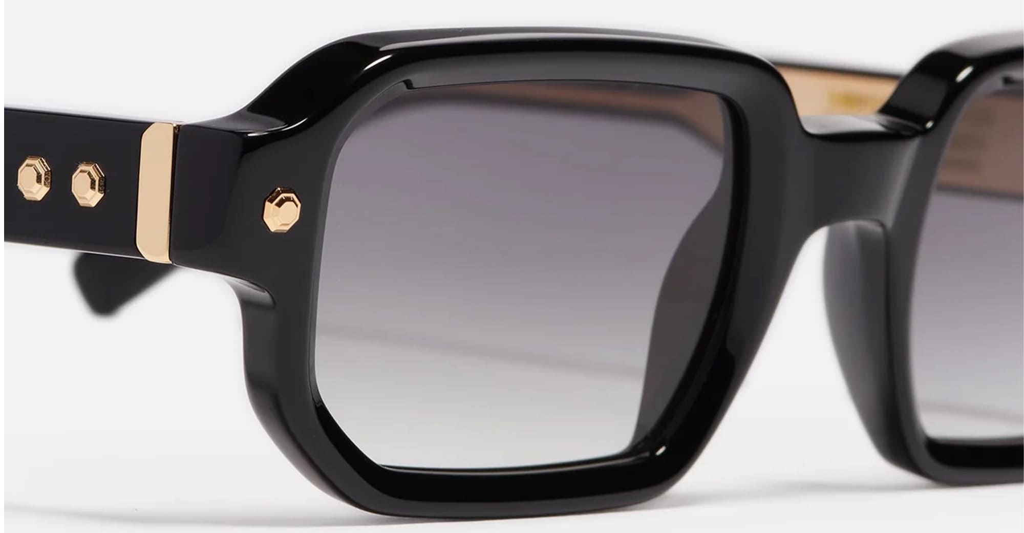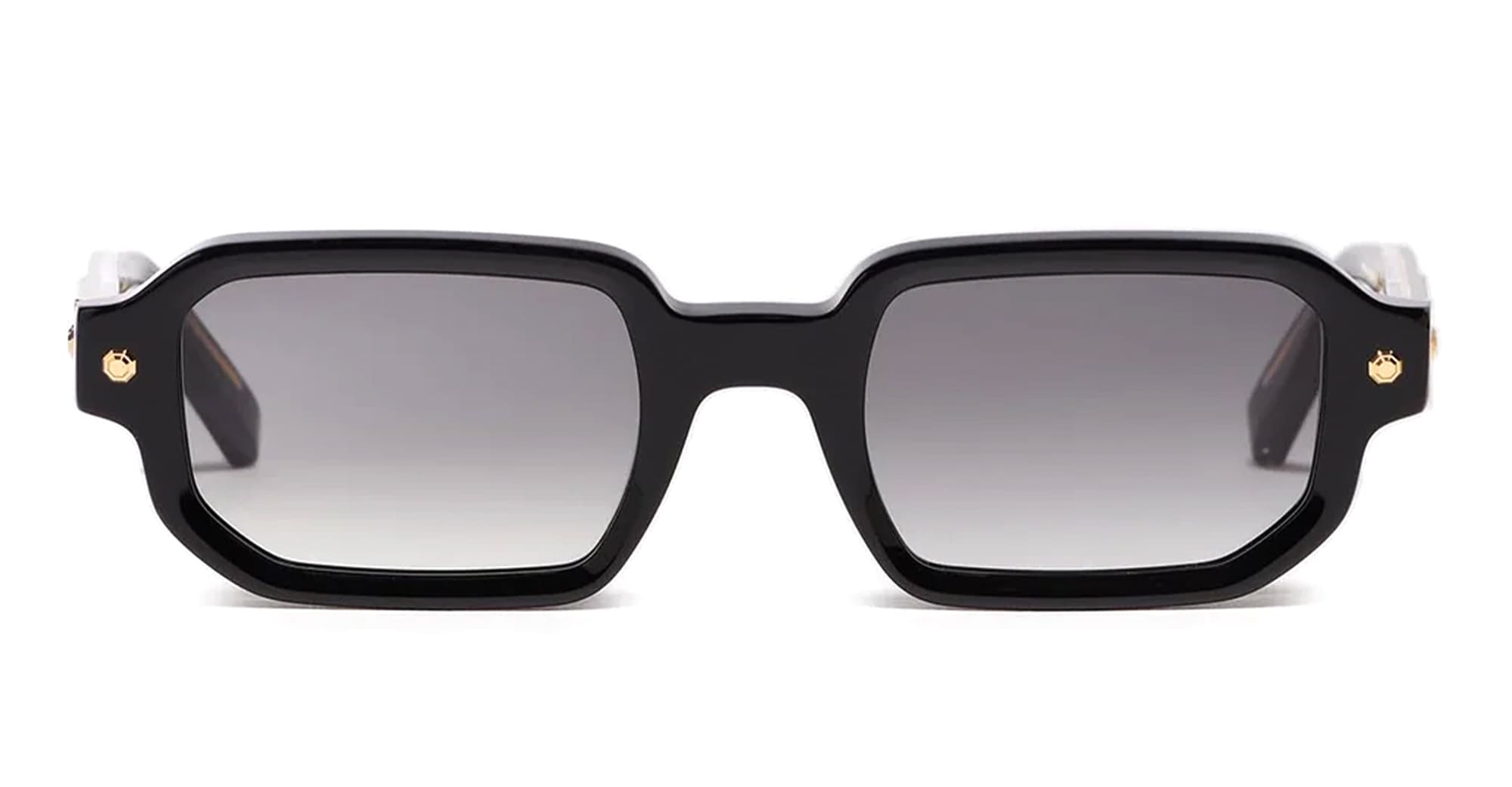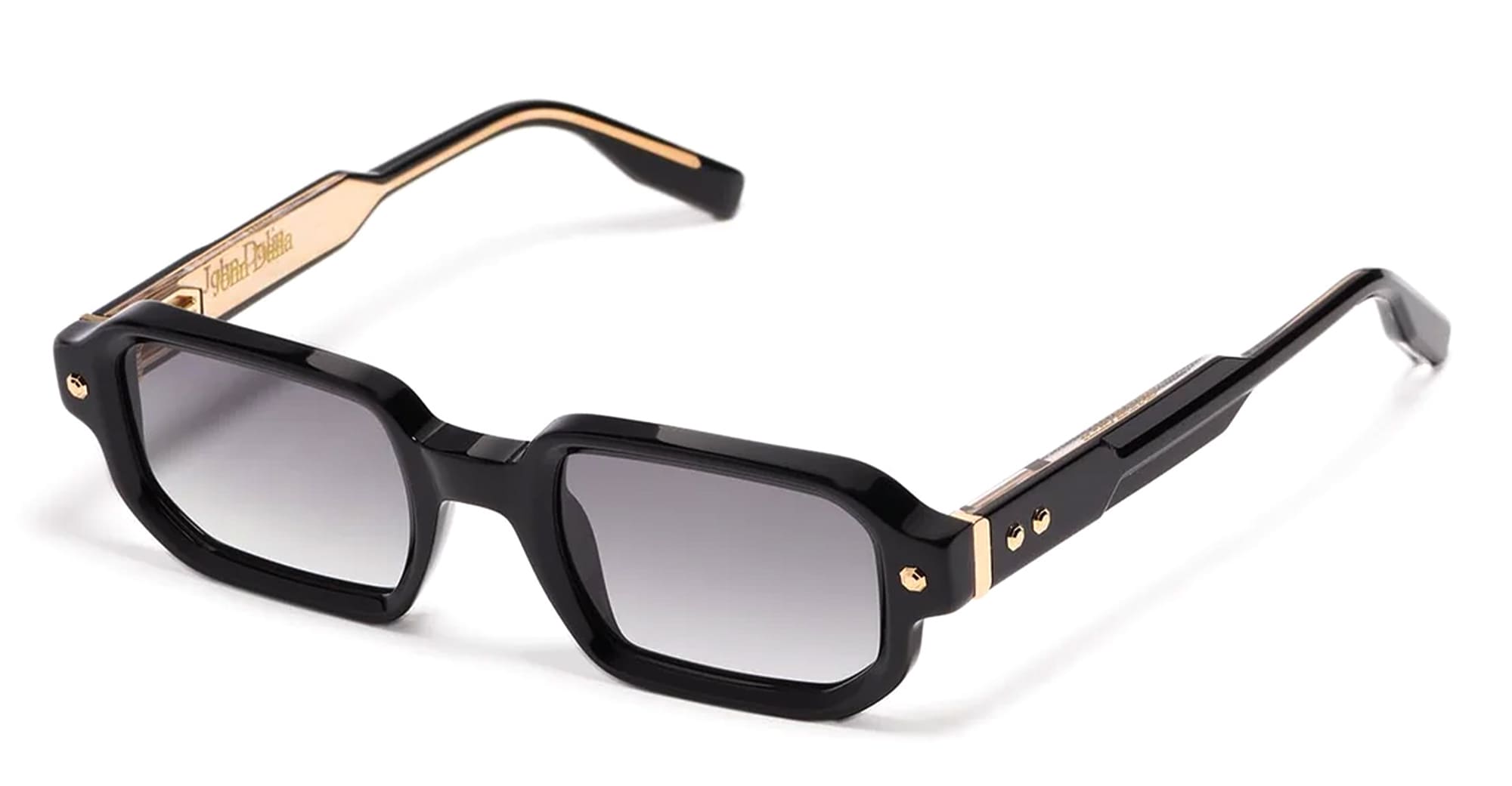 John Dalia PROJECT 06 - C100 SHINY BLACK/ YELLOW GOLD (P06-C100) are elegant unisex rectangular sunglasses, part of the exclusive John Dalia eyewear collection. They feature a black grey acetate frame with yellow decorative pins, sculpted acetate temples, exposed wirecore, grey gradient CR39 lenses with an anti-reflective coating on the inner surface, and 100% UV protection.