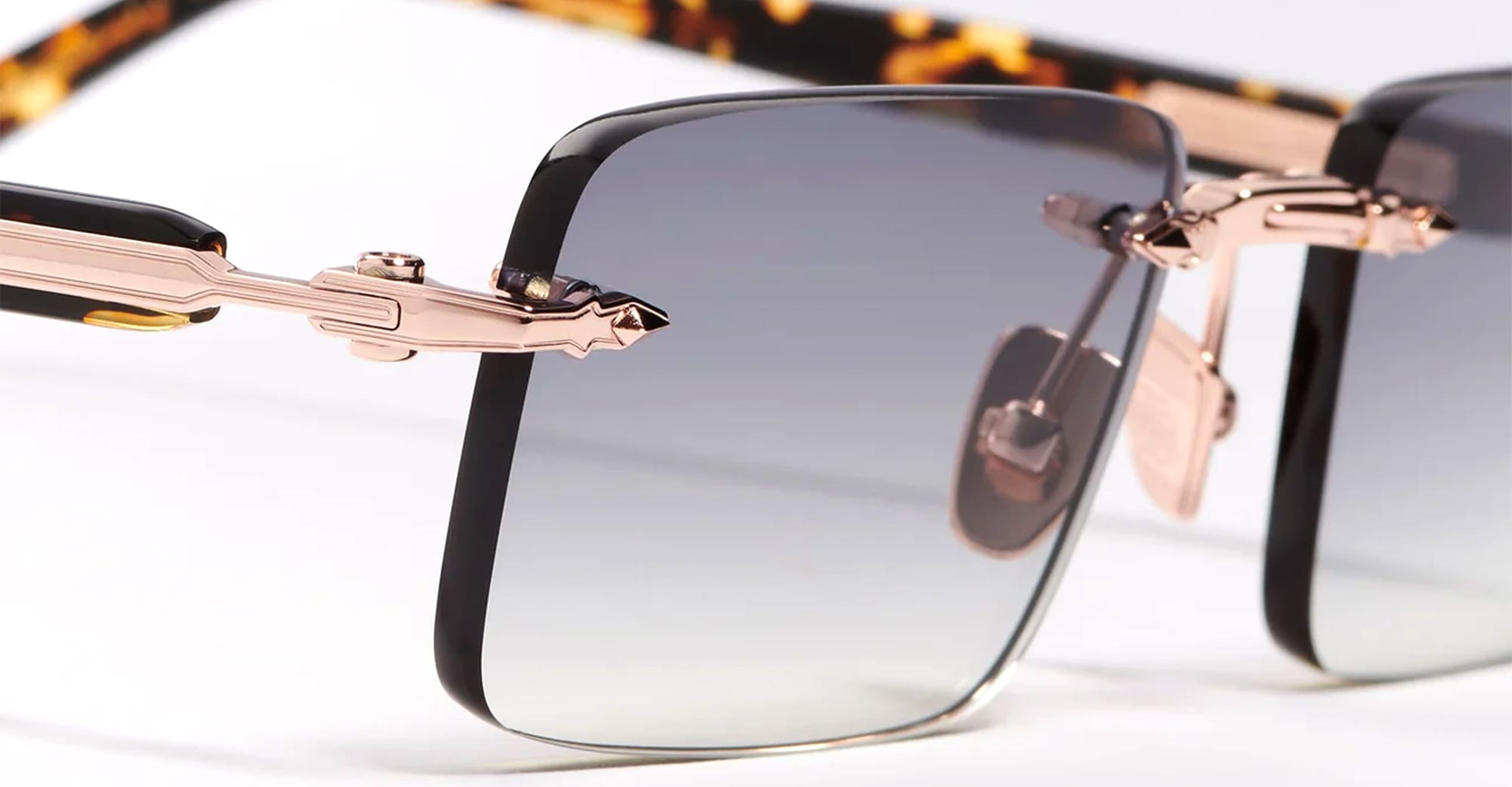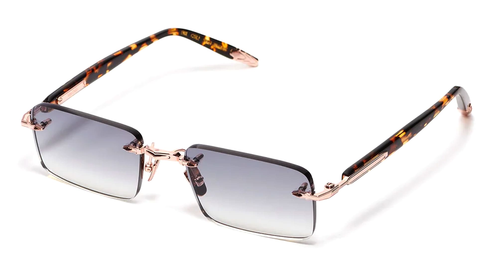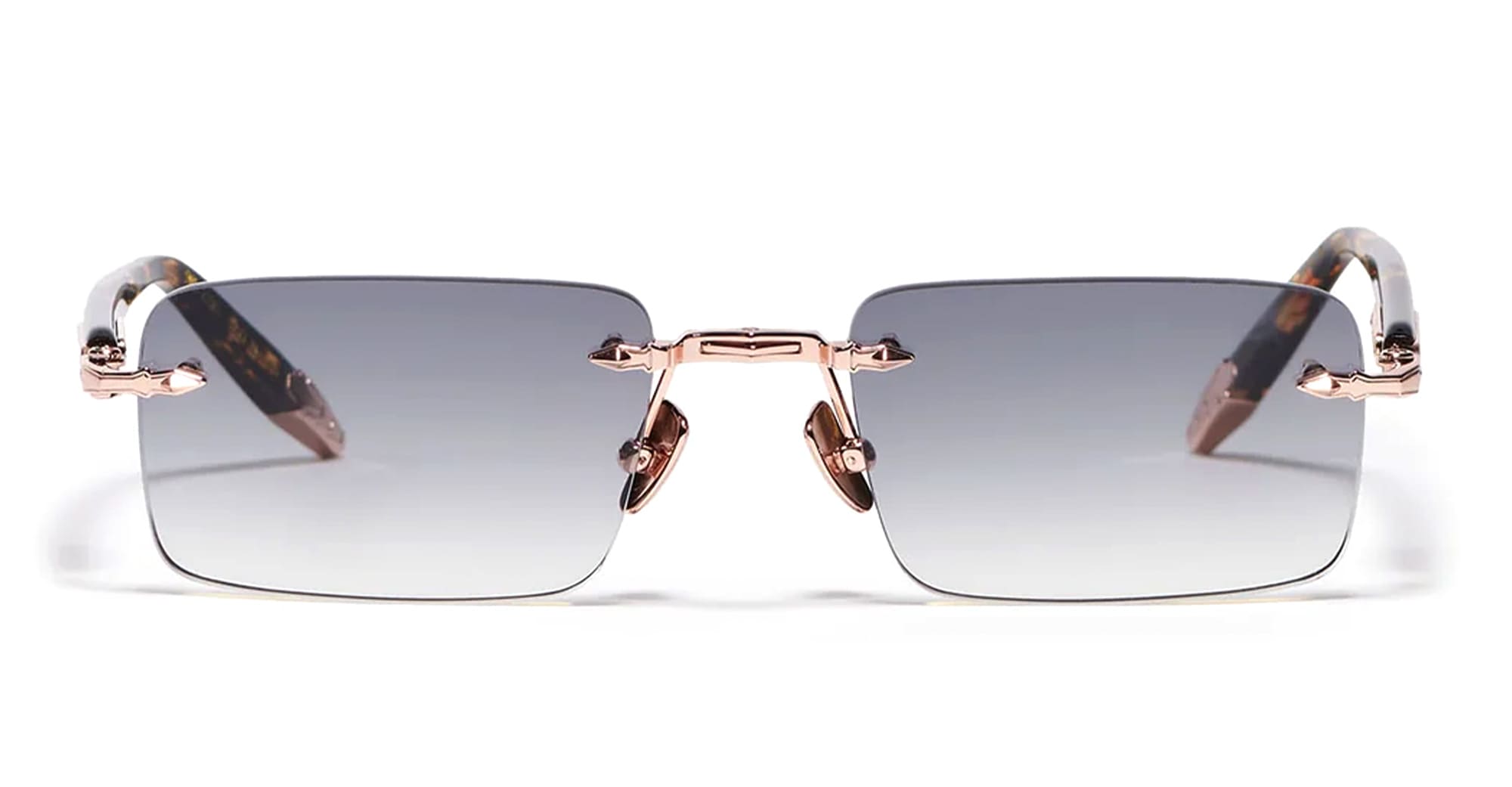John Dalia R01 - C512 ROSE GOLD 18K (R01-C512) are elegant rimless sunglasses with half moon lens shape, part of the exclusive John Dalia eyewear collection. They feature a stainless steel with a 5µ rose gold plating (jeweler s hallmark inside the temple), sculpted acetate temples, grey gradient CR39 lenses with an anti-reflective coating on the inner surface, and 100% UV protection.
