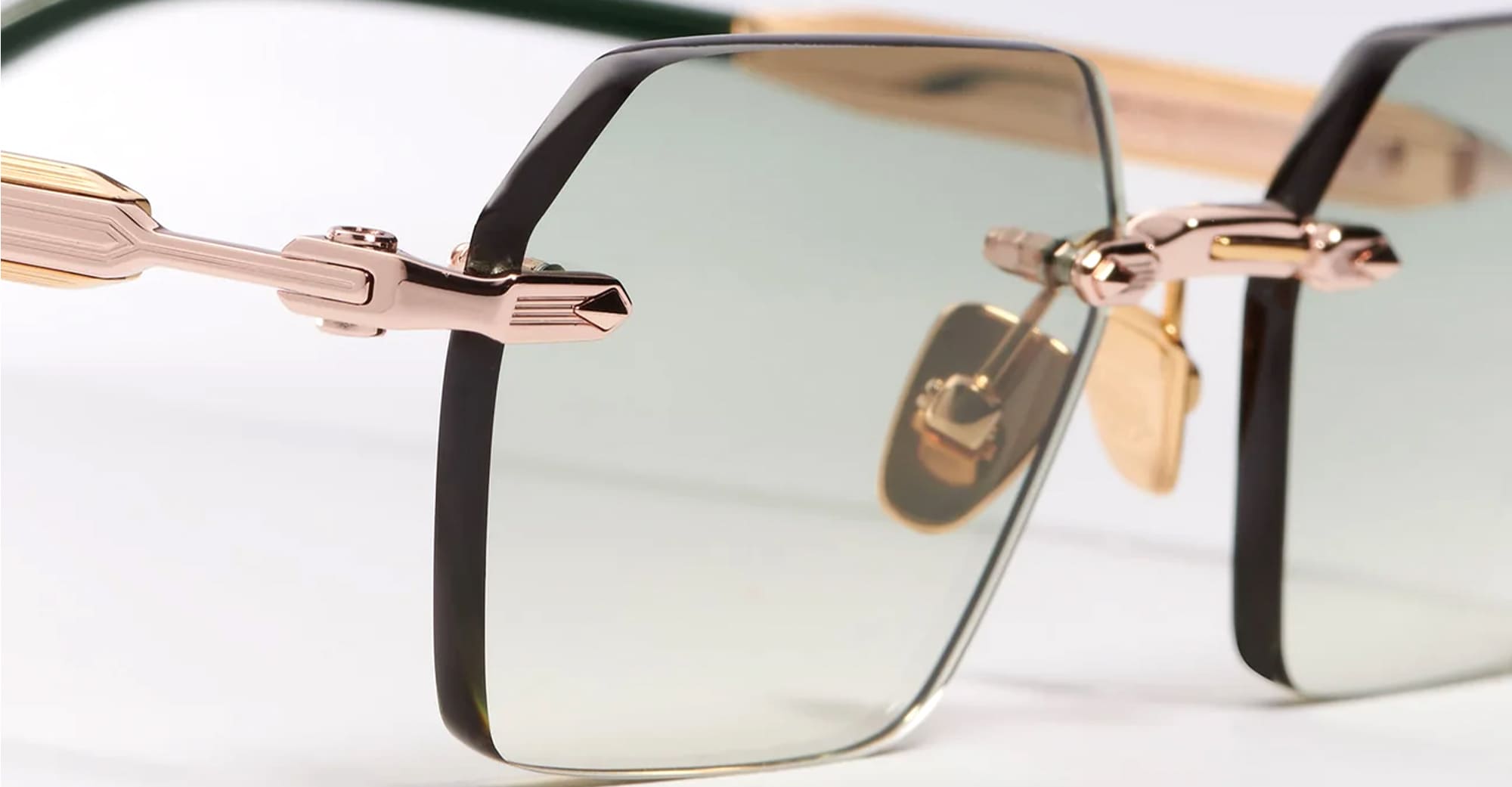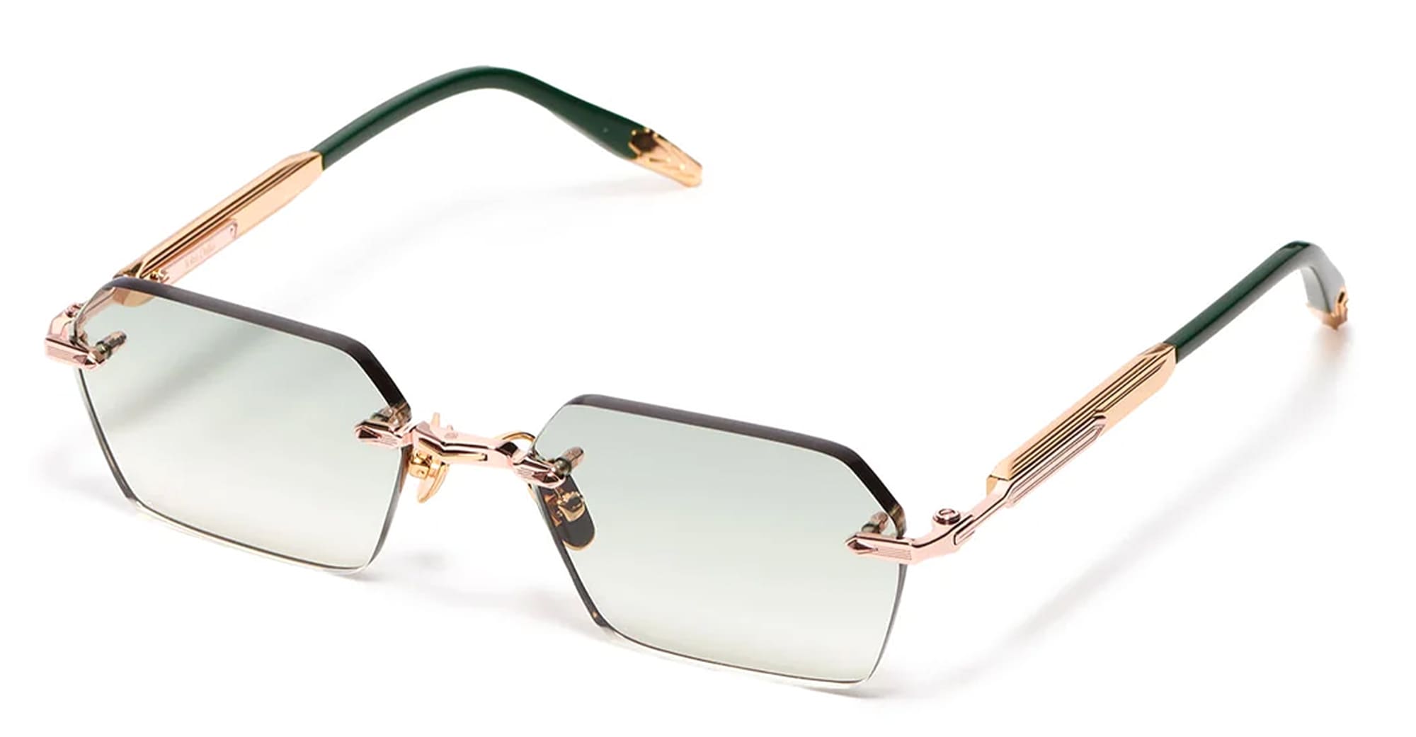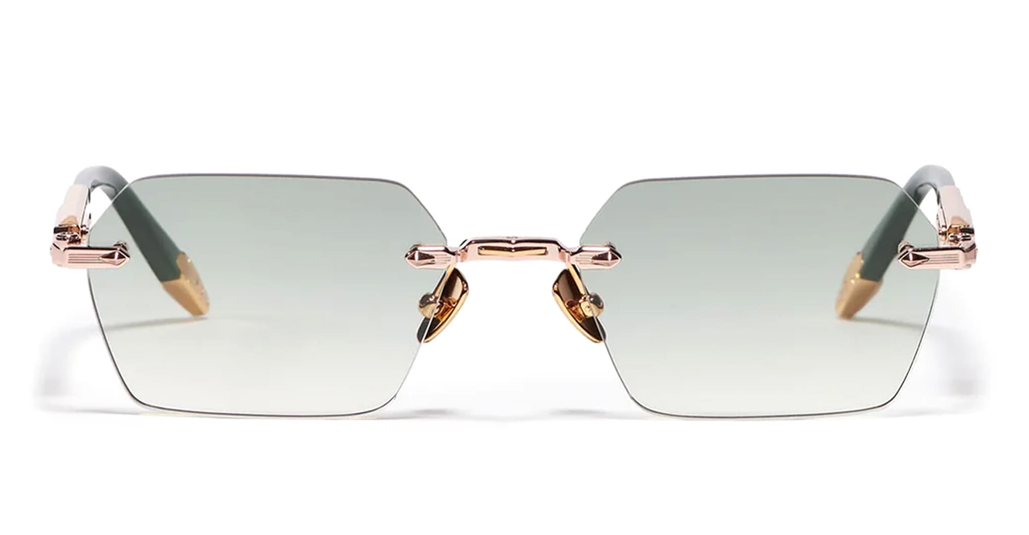 John Dalia R03 - C432 ROSE GOLD / YELLOW GOLD (R03-C432) are elegant rimless sunglasses with rectangular lens shape, part of the exclusive John Dalia eyewear collection. They feature a stainless steel with a 5µ rose gold plating (jeweler s hallmark inside the temple), sculpted acetate temples, green gradient CR39 lenses with an anti-reflective coating on the inner surface, and 100% UV protection.