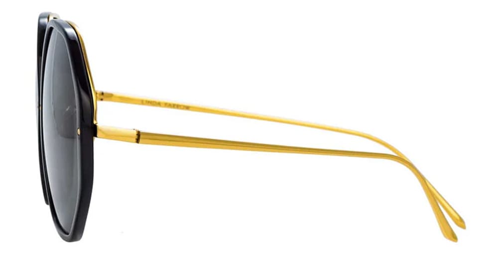 LINDA FARROW ALONA - BLACK / YELLOW GOLD (LFL901C29SUN) are '60s-inspired oversize hexagonal sunglasses made in Japan. They feature Italian black acetate front, 18-22k gold-plated titanium structure, custom nose pads, and grey Zeiss lens with 100% UV protection.