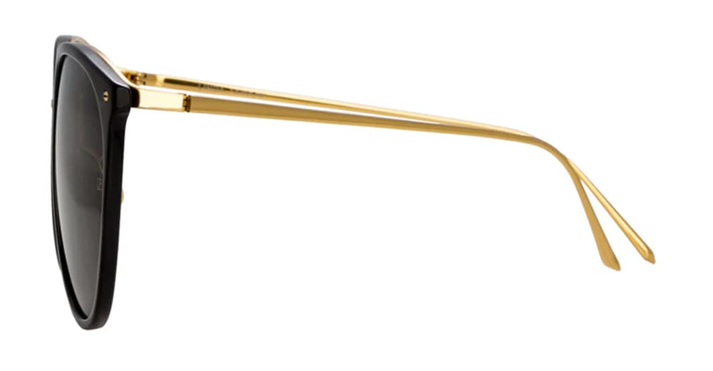 LINDA FARROW KINGS - BLACK / YELLOW GOLD (LFL747C32SUN) are elegant round oversize sunglasses made in Japan. They feature black acetate front, yellow gold titanium nose bridge and temples, and grey lens with 100% UV protection.