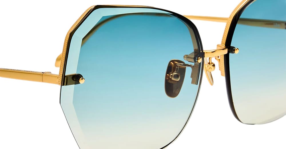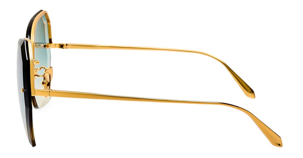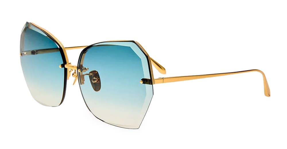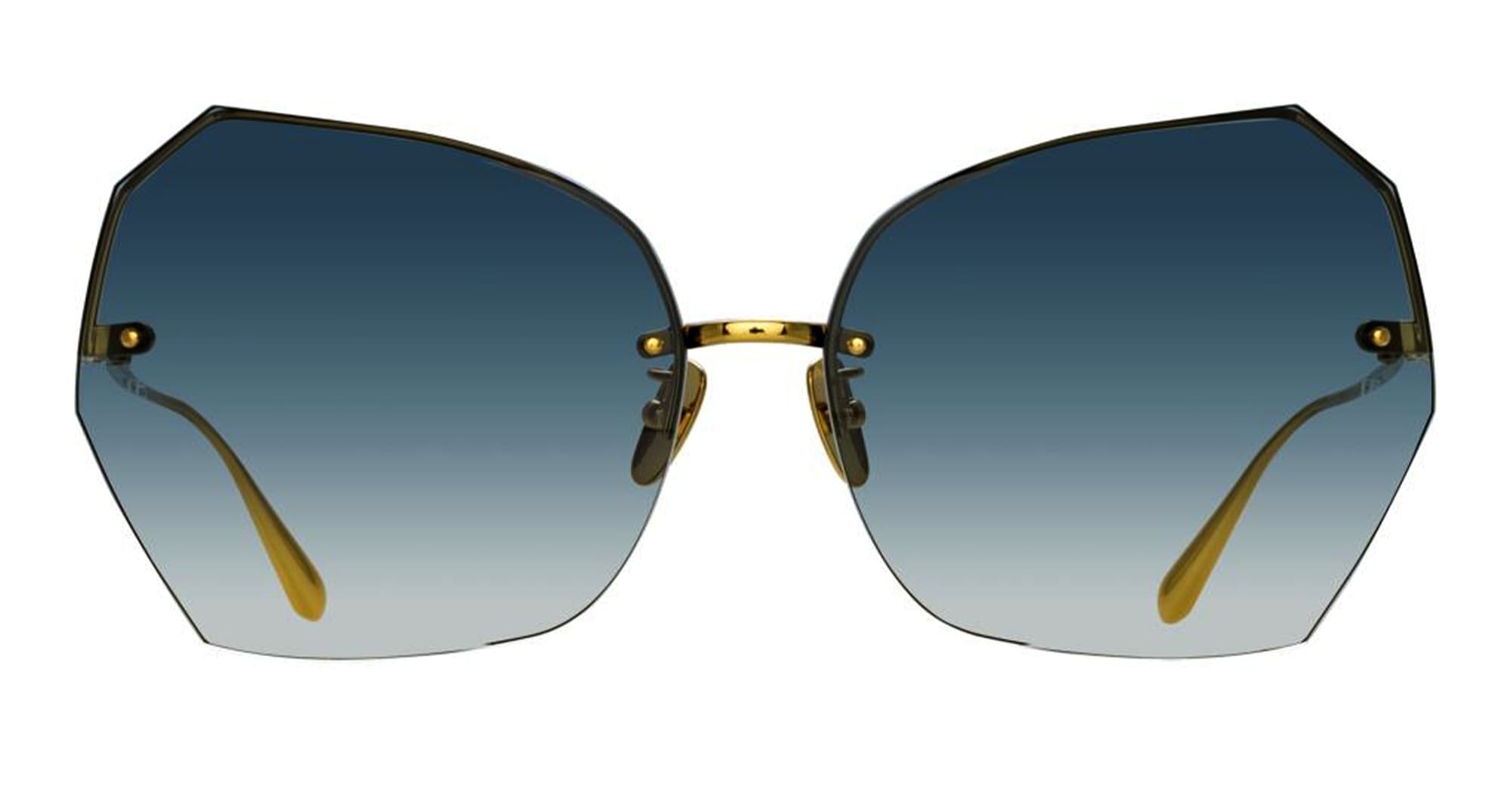 LINDA FARROW LILA - YELLOW GOLD / AQUA (LFL1546C2SUN) are limited-edition bold butterfly sunglasses, inspired by one of Linda s very first iconic vintage designs. They feature finest yellow gold Japanese titanium frame, titanium temples with rounded temple tips for maximum comfort, custom nose pads, and angular beveled blue lens with a jewel-like finish, and 100% UV protection.
