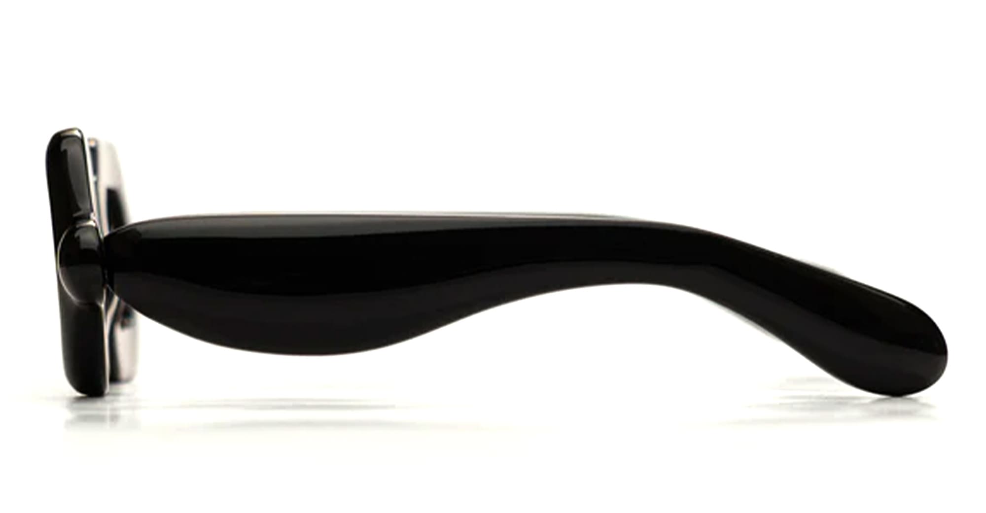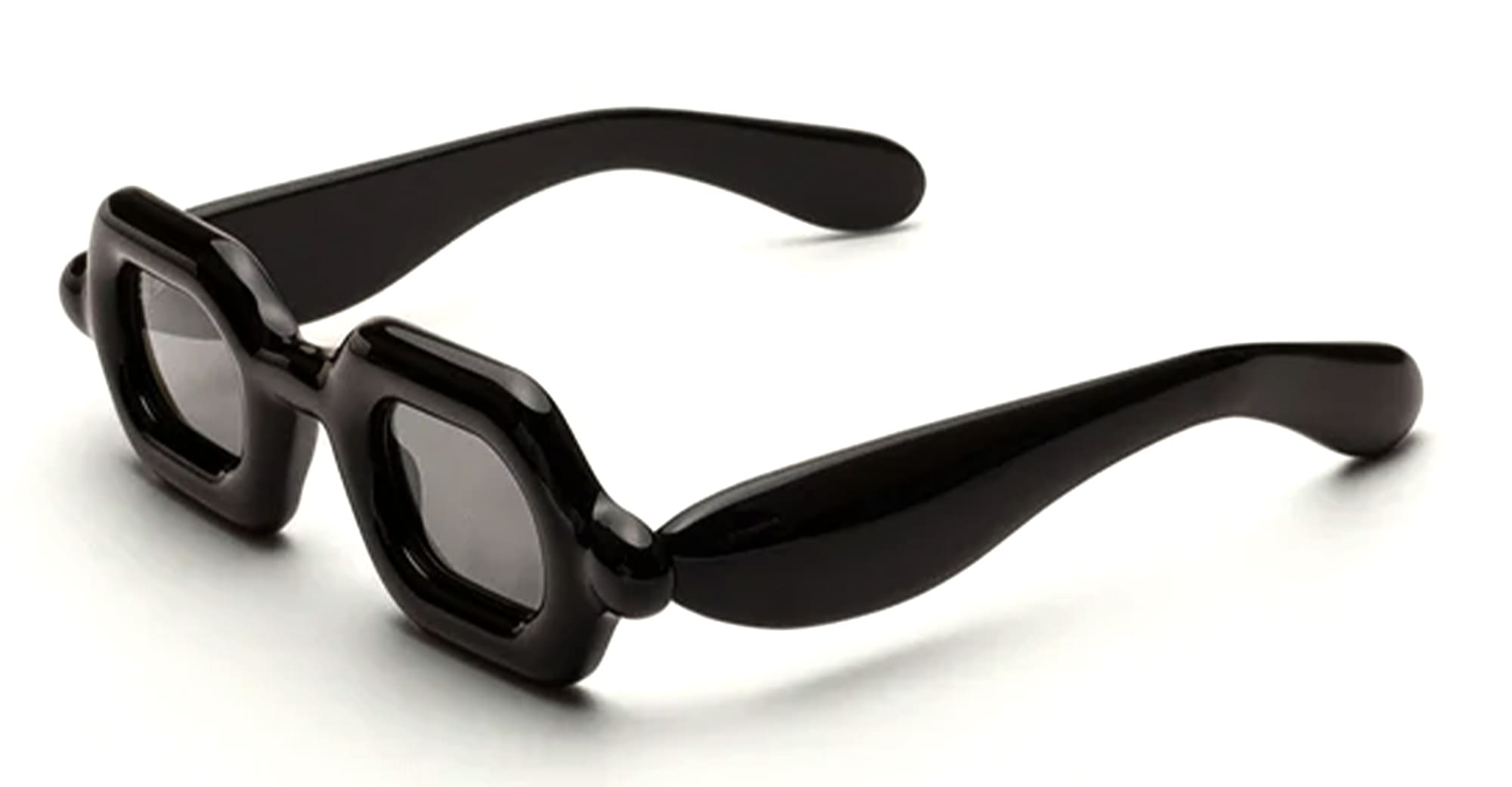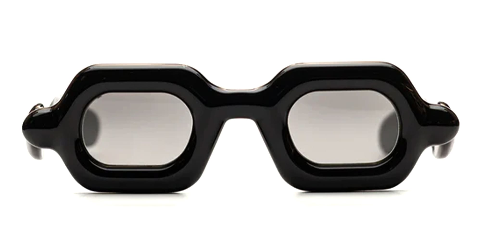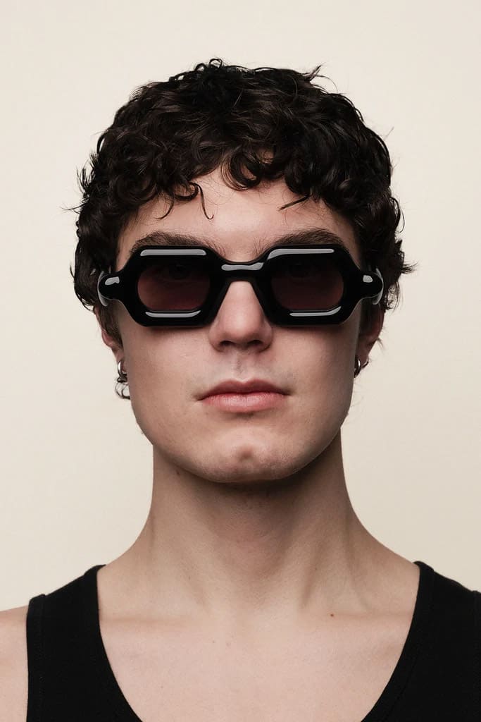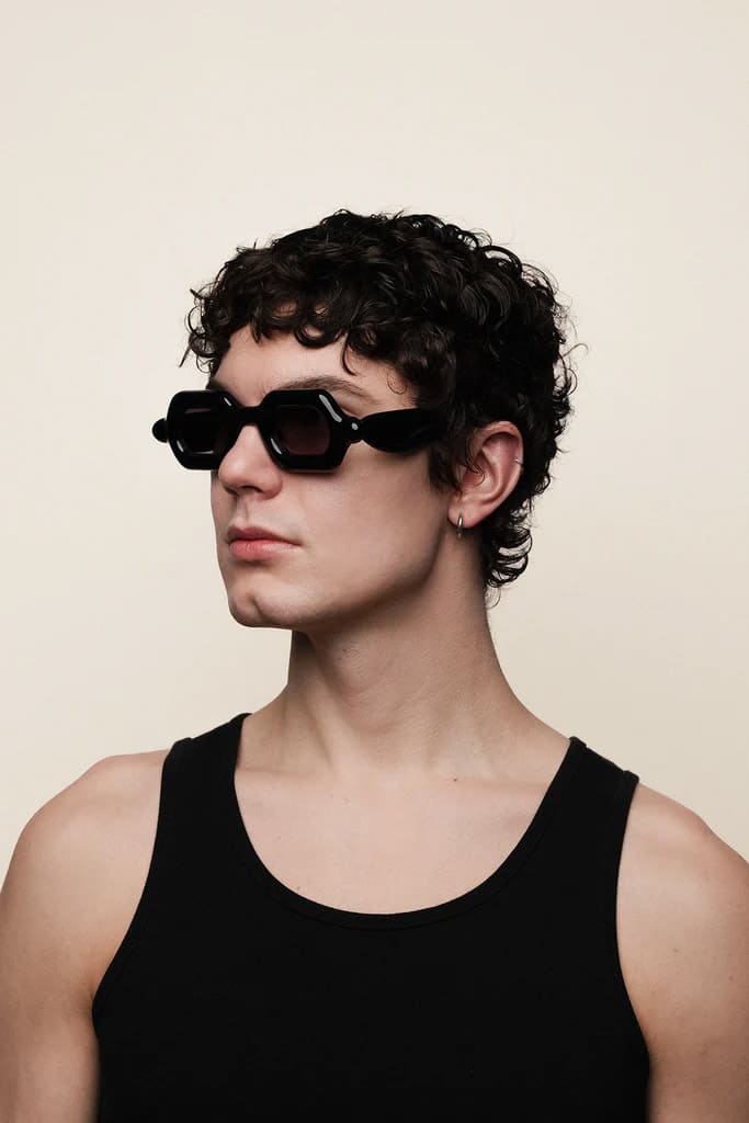 Paloceras PEBBLE - DOUBLE BLACK SX (DB-SX) are squared sunglasses with exaggerated, inflated volumes. They feature 8mm black cured Mazzucchelli acetate frame with DualLayer™ laminated construction, custom Visottica gold-plated wirecore and 5-joint hinge system, and CR39 2 base gradient grey lens with backside anti-reflective treatement and 100% UV protection.