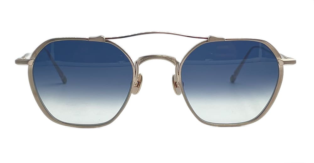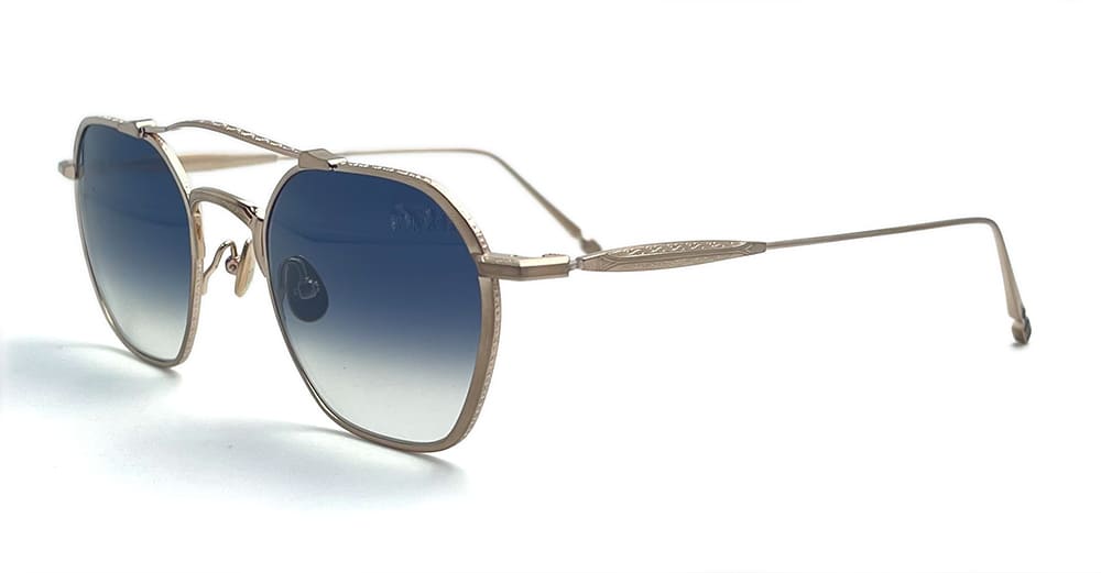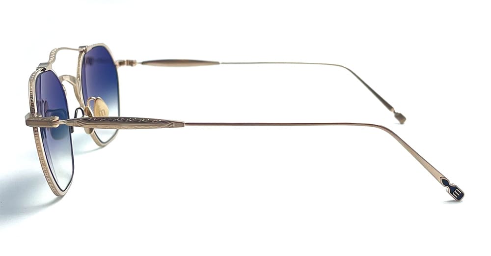 Matsuda M3145 - BRUSHED GOLD (M3145.SG.BG.50) are vintage-inspired navigator sunglasses with unique asymmetrical rims, made in Japan. They feature brushed gold structure cut from solid titanium, high arched double nose bridge, elegant engraved titanium temples, custom nose pads, and blue gradient lens with 100% UV protection.