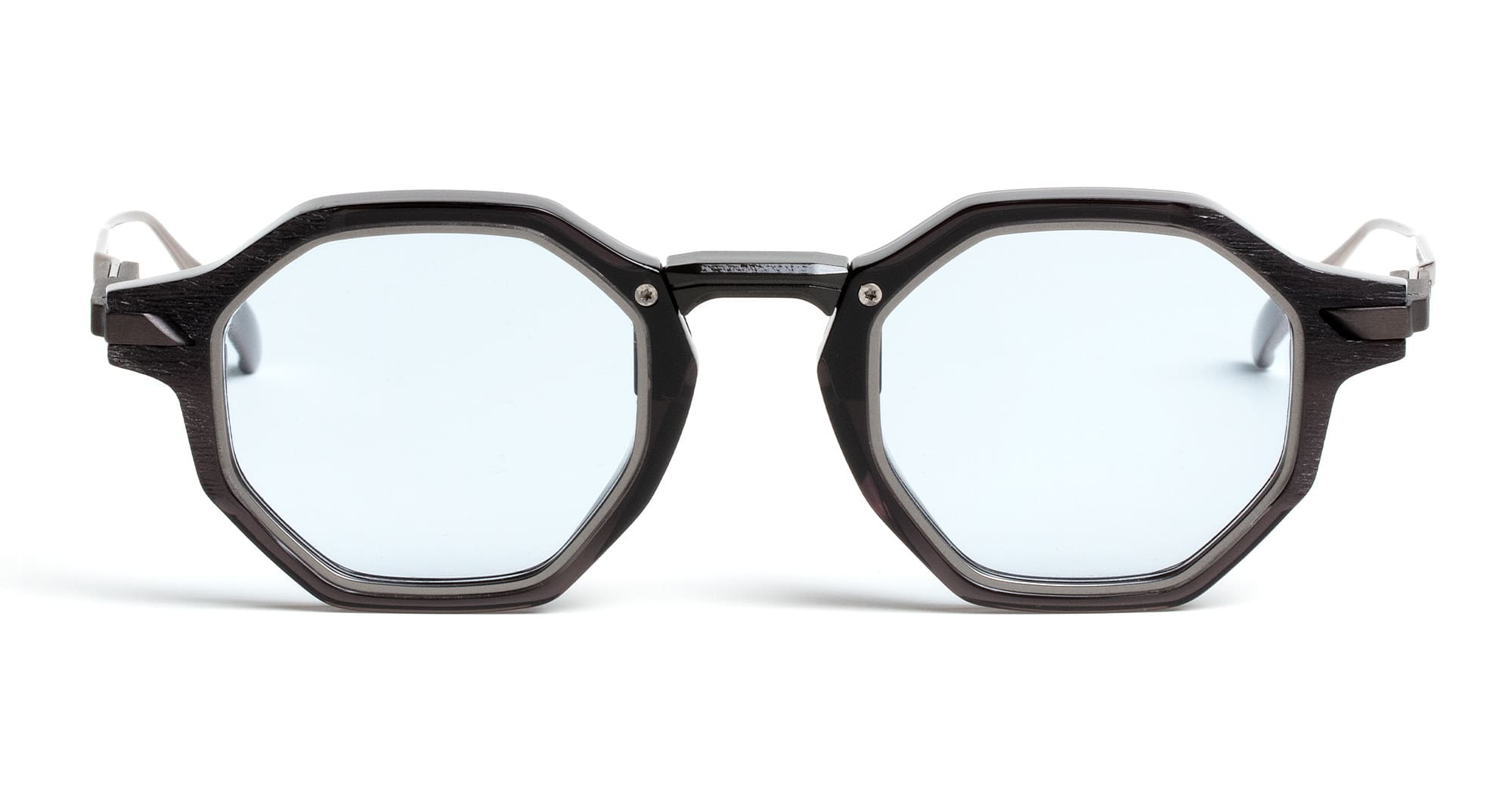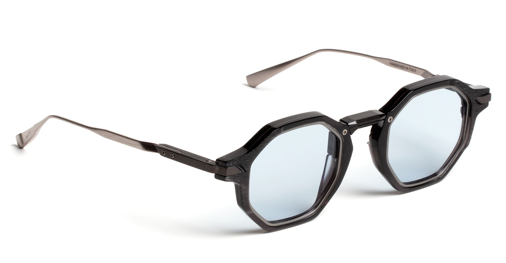 Movitra CLIMAX 04 - C2 CRYSTAL BLACK / LIGHT BLUE LENS (CLIMAX 04-C2 S) are elegant octagonal sunglasses handcrafted in Italy, part of the innovative Movitra collection. They feature crystal black Mazzucchelli acetate frame with dual polished brushed finish, titanium bar behind the front with integrated MOTUS rotation mechanism, spring hinge with custom titanium hinge block, metal temples, exposed screws and bushings with Torx heads, differentiated galvanic inserts, and light blue Zeiss lens with 100% UV protection.