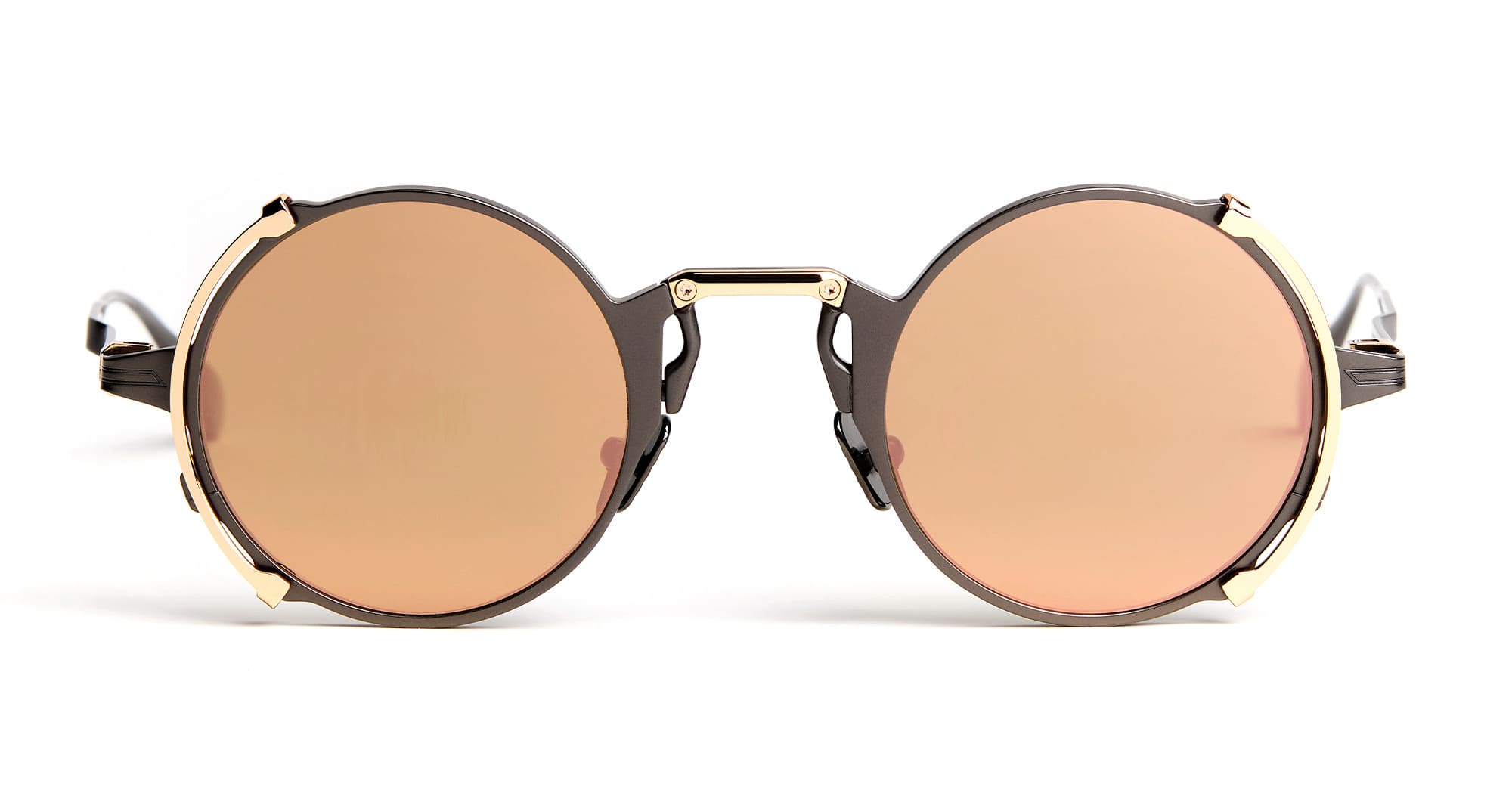 Movitra TECTUM 01 - C1 GUNMETAL / ROSE GOLD LENS (TECTUM 01-C1) are modern round sunglasses handcrafted in Italy, part of the innovative Movitra collection. They feature gunmetal titanium structure, integrated MOTUS rotation mechanism behind the lens, custom nose pads, anti-unscrewing hinge, external bumper insert with brushed finish, stamped-cut temples, exposed screws and bushings with Torx heads, differentiated galvanic inserts, and rose gold Zeiss lens with 100% UV protection.