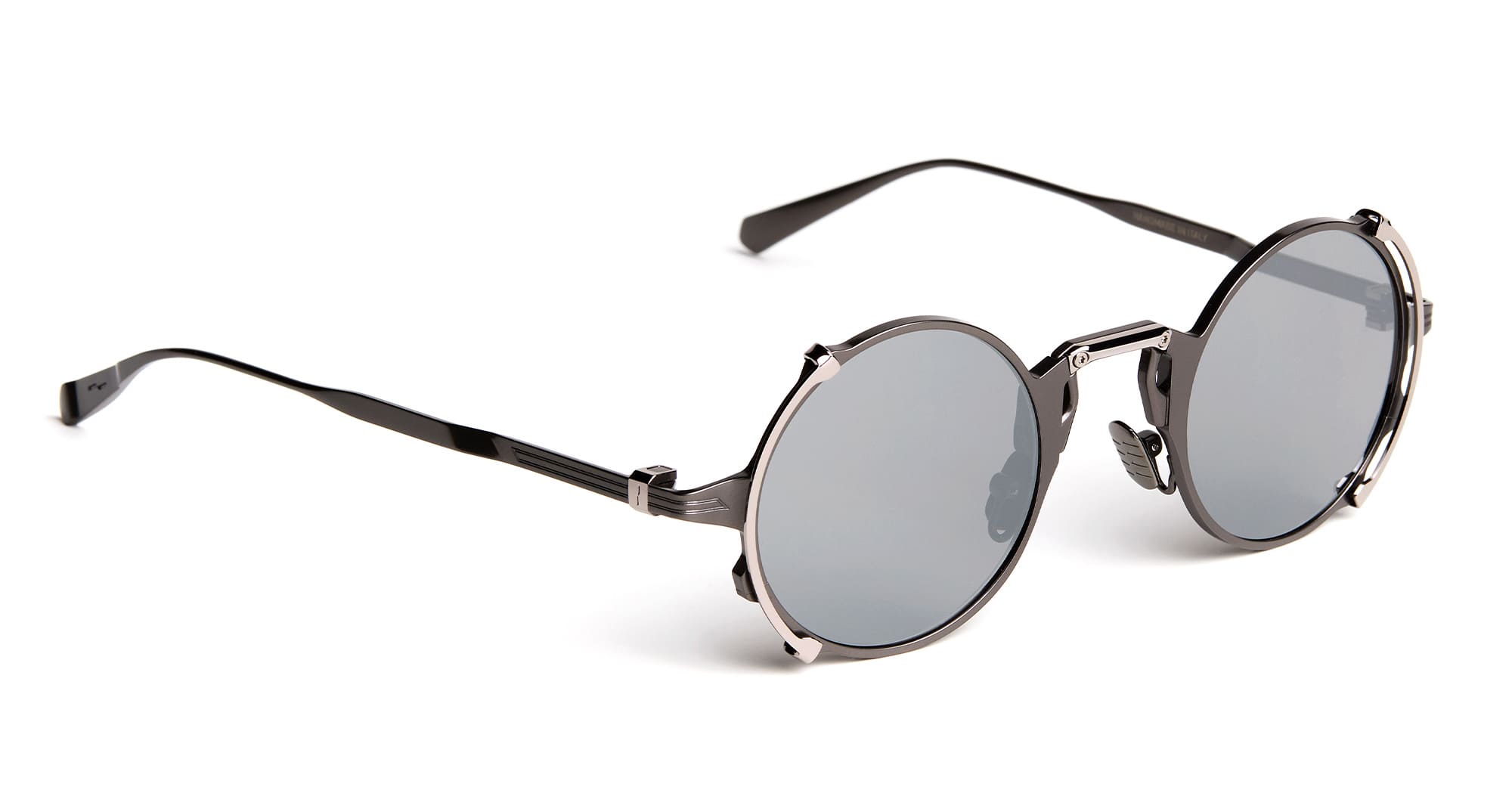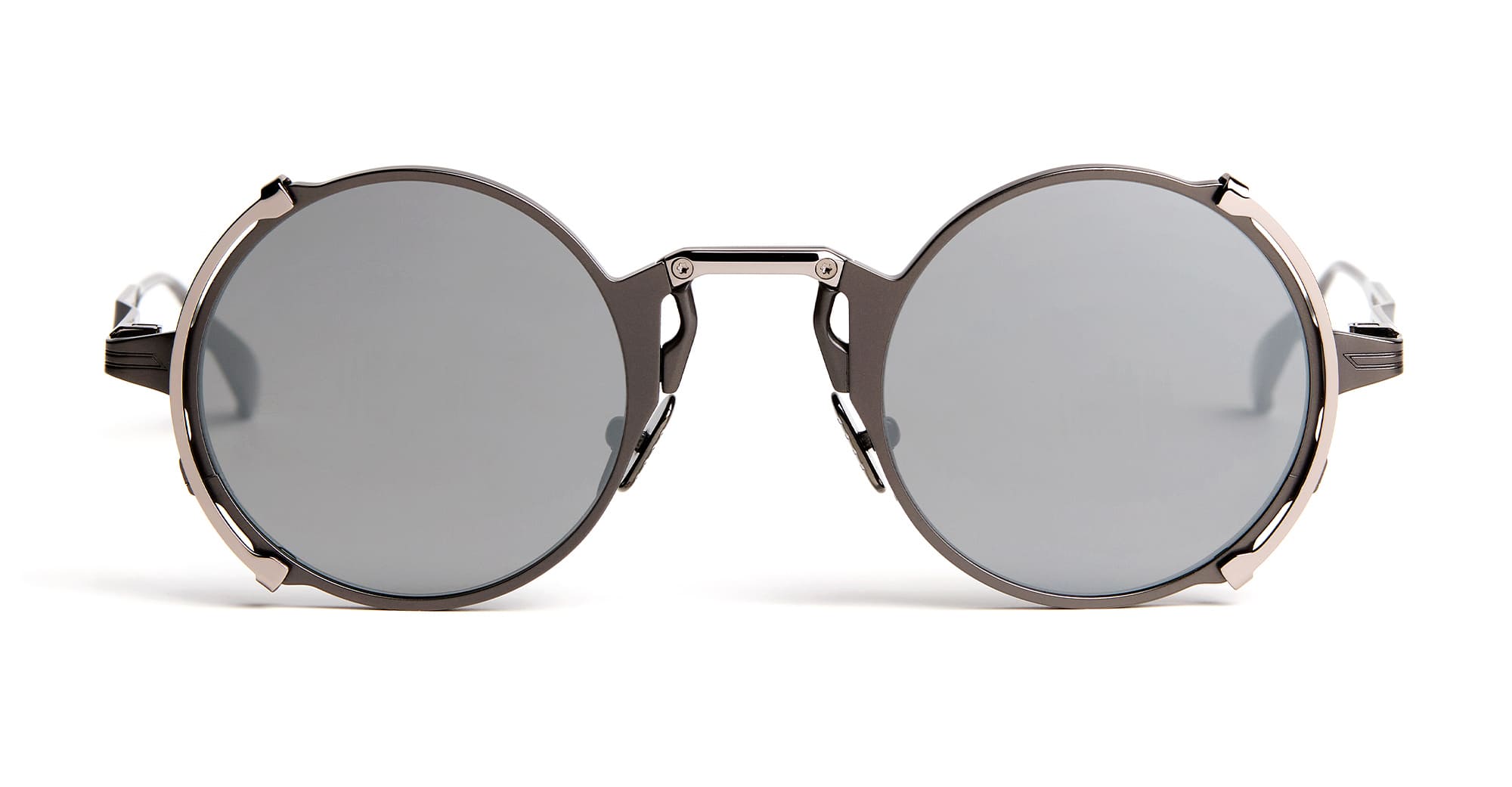 Movitra TECTUM 01 - C2 GUNMETAL / SILVER LENS (TECTUM 01-C2) are modern round sunglasses handcrafted in Italy, part of the innovative Movitra collection. They feature gunmetal titanium structure, integrated MOTUS rotation mechanism behind the lens, custom nose pads, anti-unscrewing hinge, external bumper insert with brushed finish, stamped-cut temples, exposed screws and bushings with Torx heads, differentiated galvanic inserts, and silver mirror Zeiss lens with 100% UV protection.
