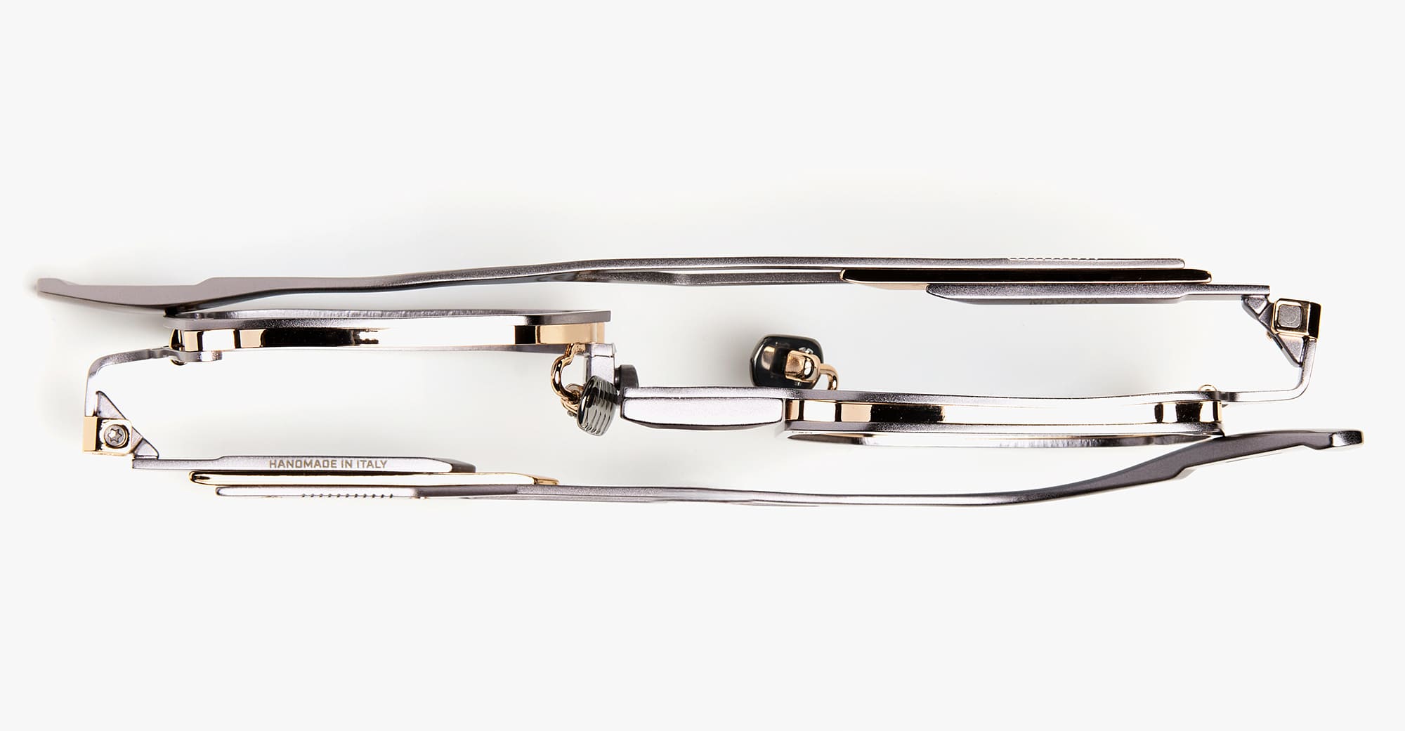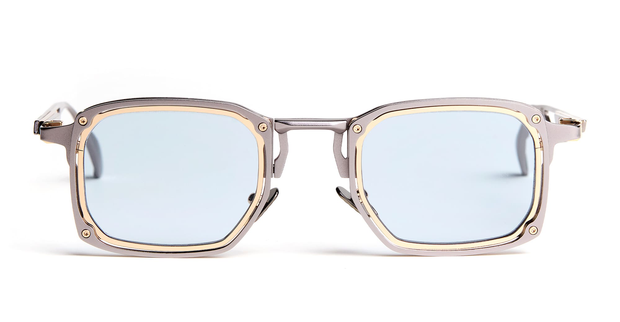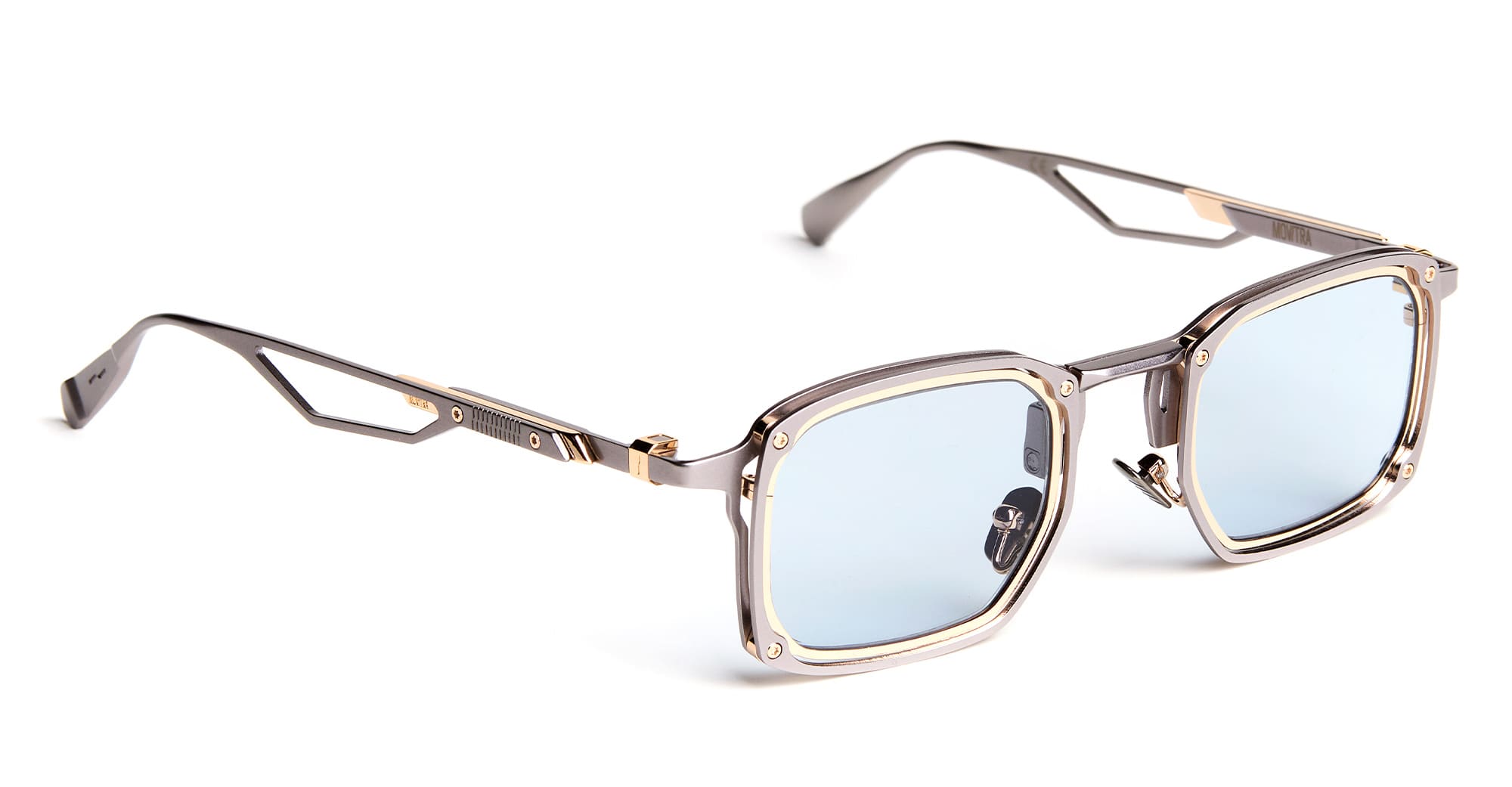 Movitra TRINITAS 02 - C2 LIGHT GUNMETAL / AZURE LENS (TRINITAS 02-C2) are modern rectangular sunglasses handcrafted in Italy, part of the innovative Movitra collection. They feature light gunmetal titanium structure with light gold galvanic inserts, integrated MOTUS rotation mechanism behind the lens, custom nose pads, anti-unscrewing hinge, external bumper insert with brushed finish, stamped-cut temples, exposed screws and bushings with Torx heads, and azure Zeiss lens with 100% UV protection.