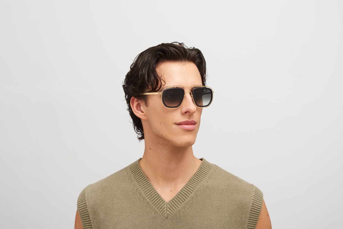 Mykita FERLO - MH7 PITCH BLACK / GLOSSY GOLD (10086150) are lightweight elegant squared sunglasses made in Germany, part of the Mykita Mylon Colletion. They feature black Mylon front fitted inside a golden steel structure, patented spiral hinge, silicone temple tips and nose pads, gradient black lens with 100% UV protection.