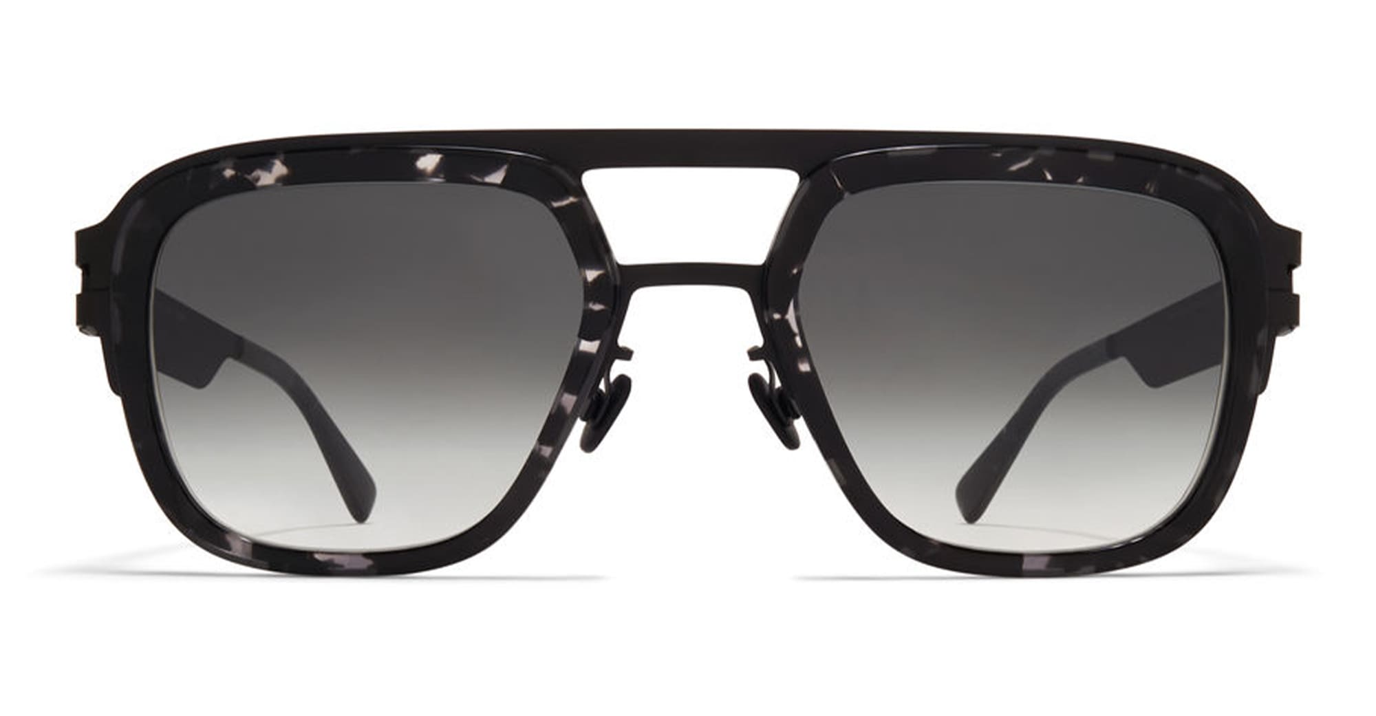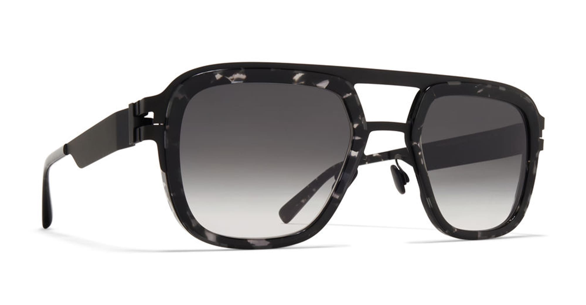 Mykita KNOX - A50 BLACK / BLACK HAVANA (10084841) are squared navigator sunglasses made in Germany, part of the Mykita Acetate Colletion. They feature a black stainless steel structure with black havana recycled acetate eyerim inserts, custom nose pads, patented spiral hinge, wide stainless steel temples with acetate tips, and black gradient lens with 100% UV protection.