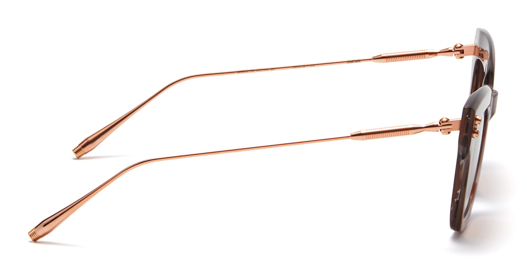 Akoni INNES - CRYSTAL NUDE GREY / ROSE GOLD (AKS-112B-49) are modern interpretation of a classic cat-eye sunglasses. They feature crystal nude grey Japanese acetate frame, iconic Akoni front pins, thin Japanese titanium temples with signature knurlind and temple tips, and gradient grey to rose lens with 100% UV protection.