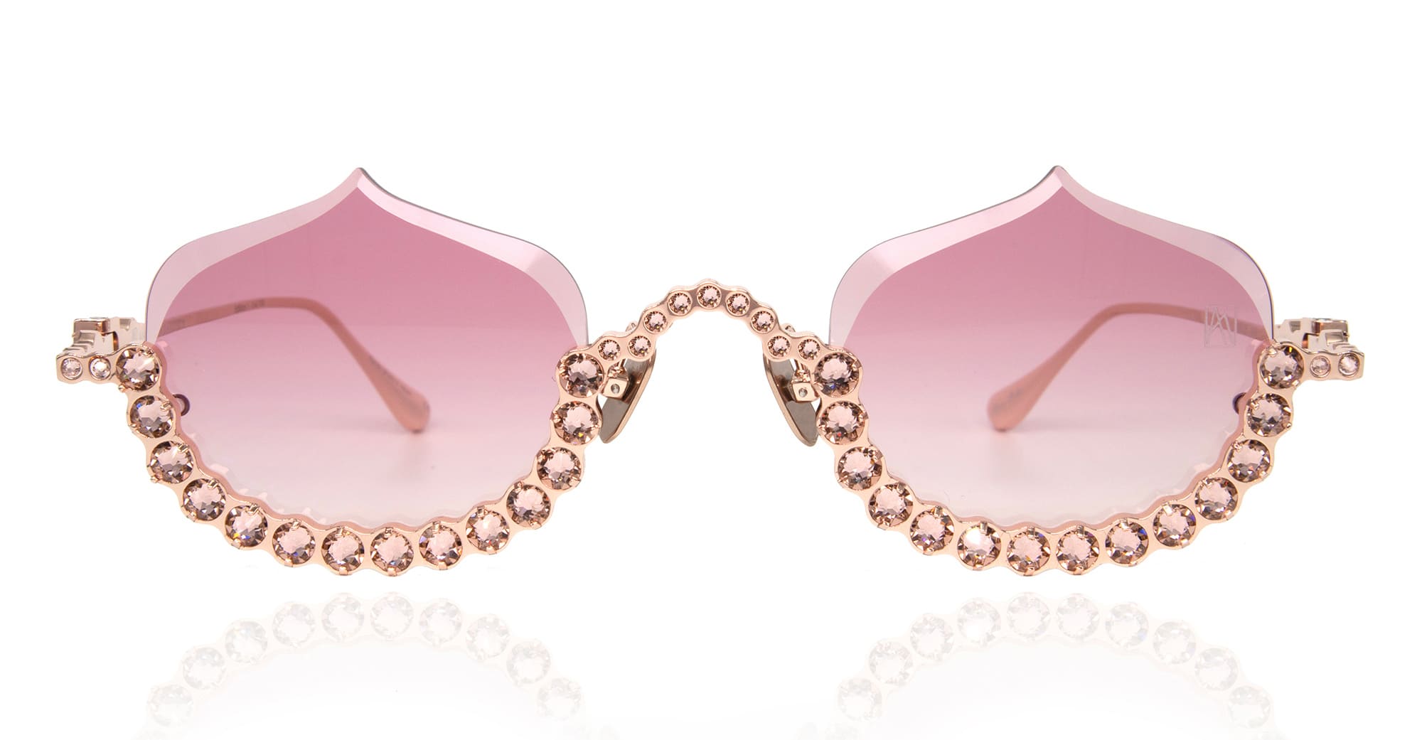 Anna-Karin Karlsson CRYSTAL MERINGUE - ROSE GOLD (S232-7703) are luxurious, feminine semi rimless sunglasses, part of the exclusive Anna-Karin Karlsson eyewear collection. They feature 24k gold-plated titanium structure with Swarovski crystal, custom nose pads, pink Zeiss lens engraved with AKK logo and 100% UV protection.