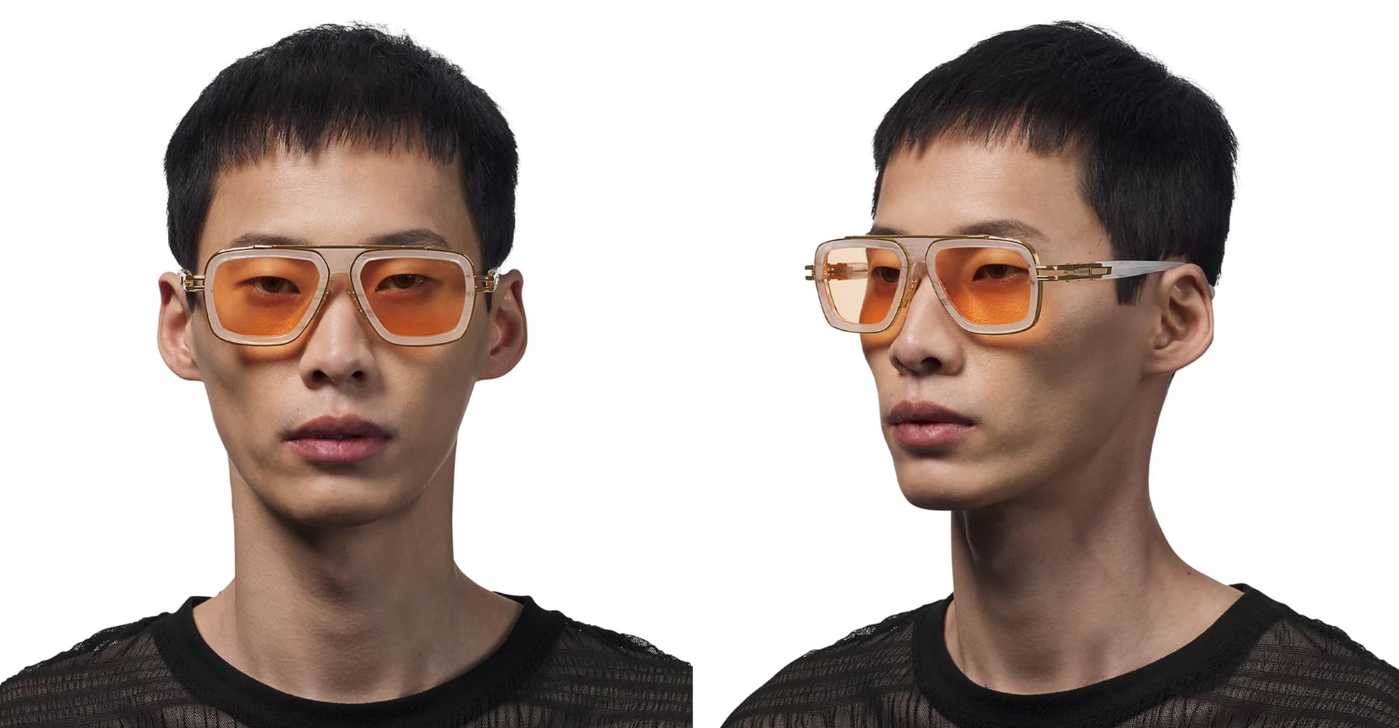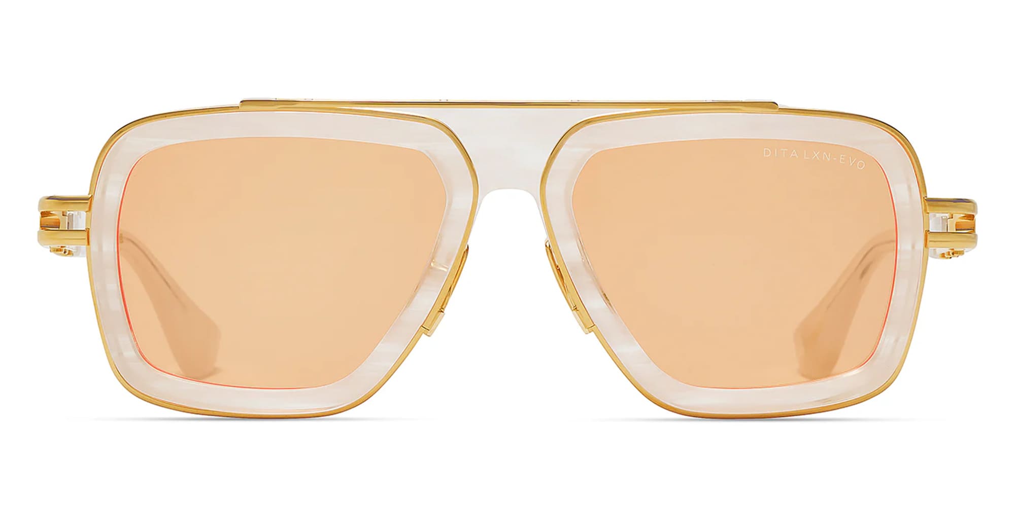 DITA LXN-EVO - WHITE SWIRL / YELLOW GOLD (DTS403-A-06) are classic navigator sunglasses with elegant details. They feature white acetate front frame with external gold titanium lens rims and brow bar, custom temple hinge plate with enamel inlay, custom titanium nose pad with diamond pressed detail, acetate temple tips, Dita's unique hex screw hinge, apricot CR39 lens with 100% UVA and UVB protection and anti-reflective coating.