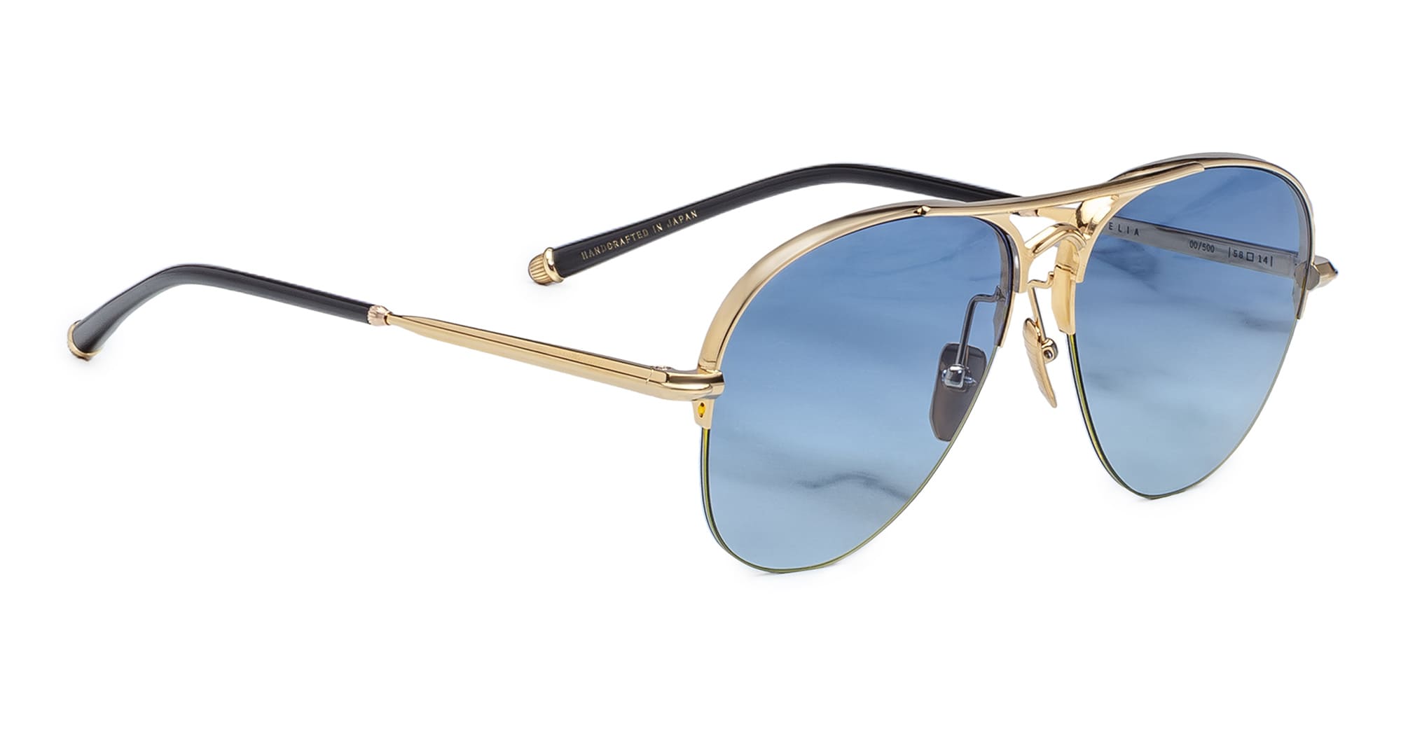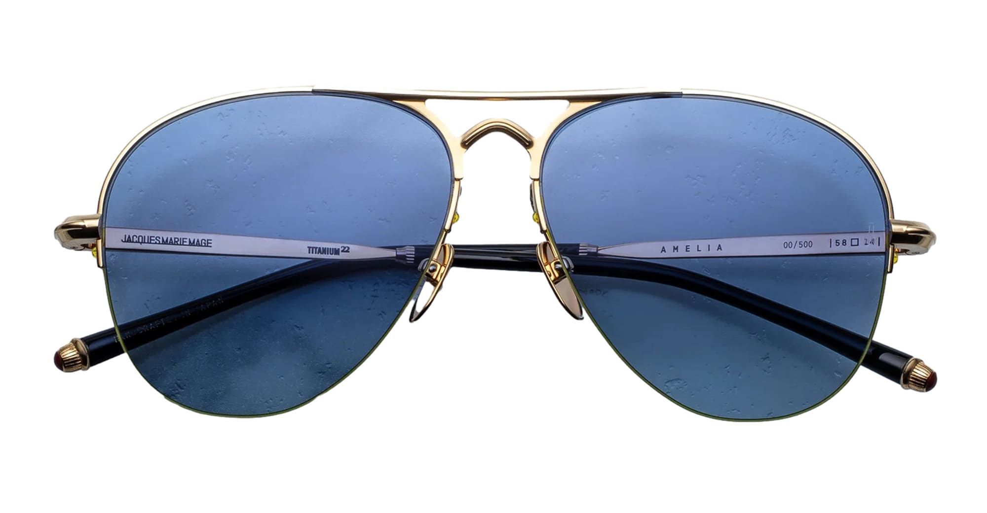 Jacques Marie Mage AMELIA - GOLD (JMMTV-40 ) are elegant semi-rimless titanium aviators with a medium fit, featuring arched double-bridge. They feature gold 100% beta titanium structure, engraved titanium temples with acetate temple tips and hand-painted bordeaux epoxy detail, tension-secured custom monoblock hinge, custom titanium nose pads, gradient blue 4 base armorlite lens with backside anti-reflective treatment and 100% UV protection.