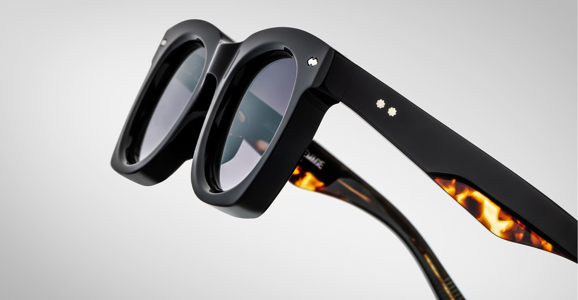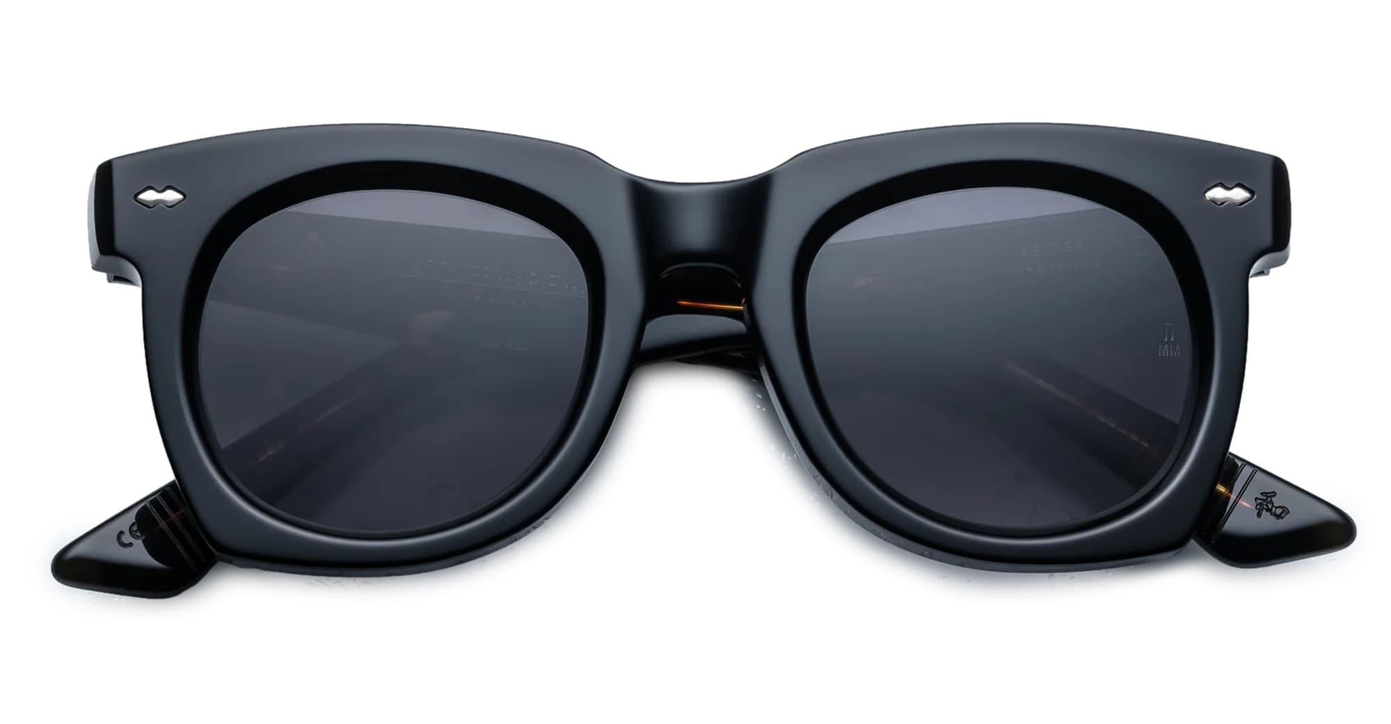 Jacques Marie Mage AVA - NOIR 11 (JMMAV-11A) are sleek '50s-inspired round sunglasses made in Japan. They feature black 8mm acetate frame, custom double laminated acetate, sterling silver signature double-arrowhead front pin, exposed wirecore with 'Lever' decoration, tension-secured custom barrel hinge, jet gradient 4 base CR39 lens with backside anti-reflective treatment and 100% UV protection.