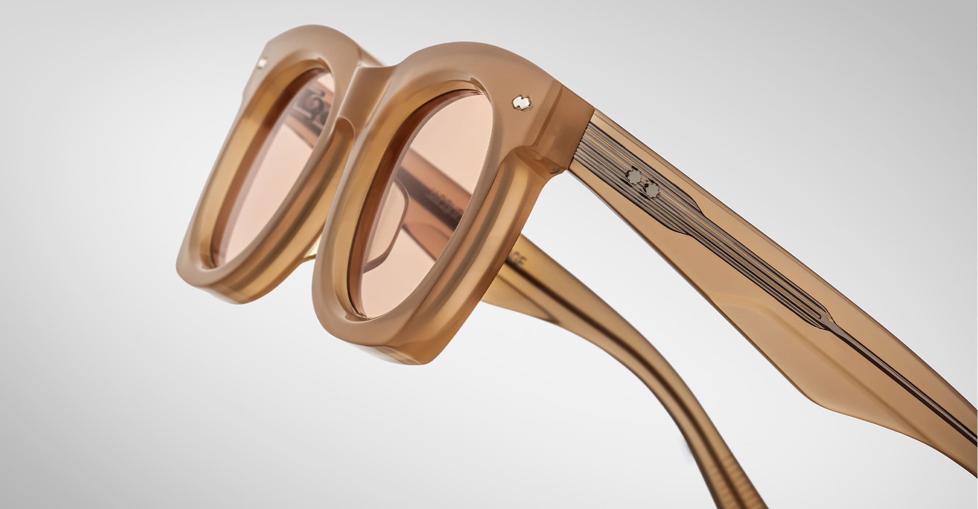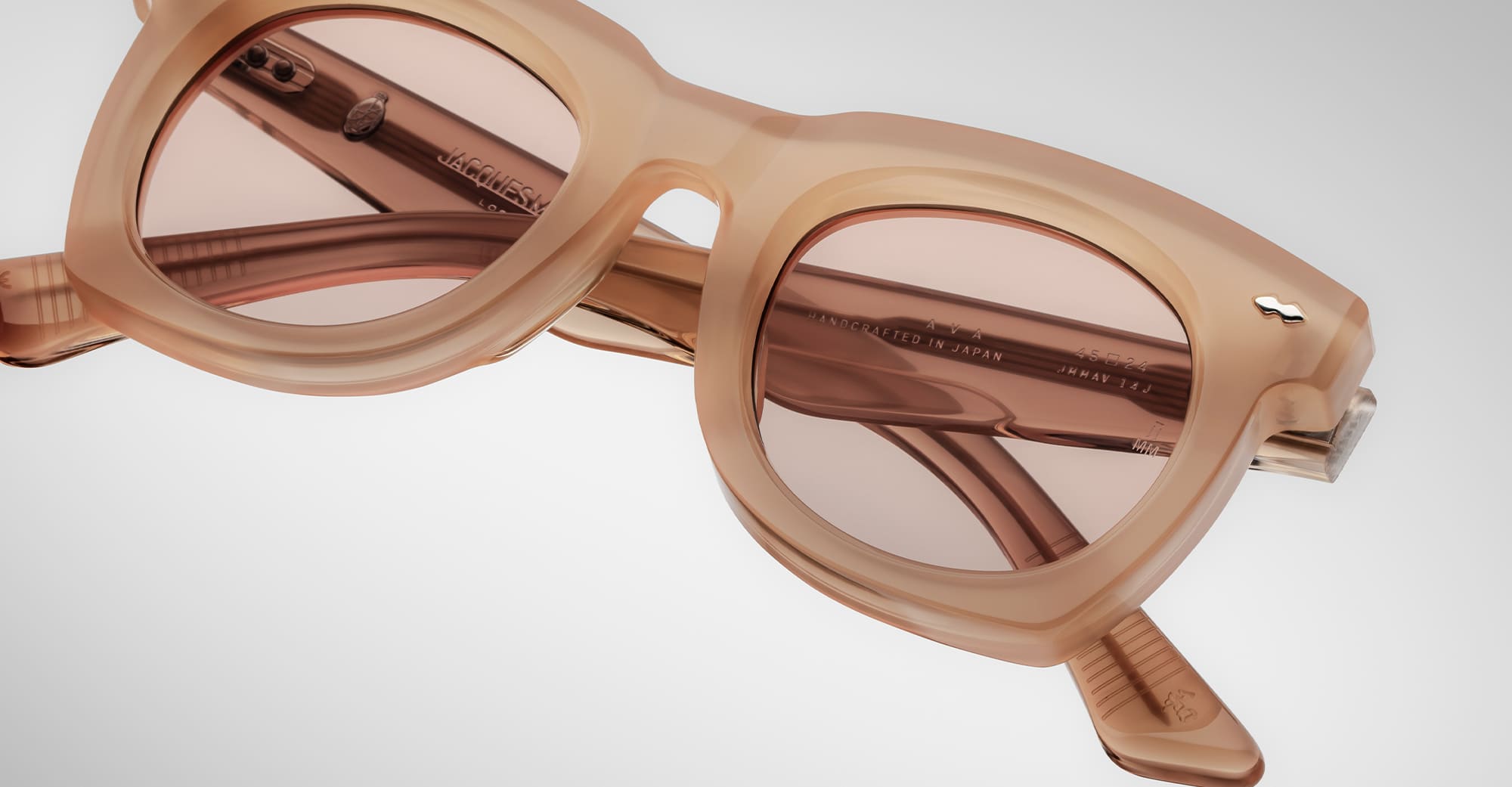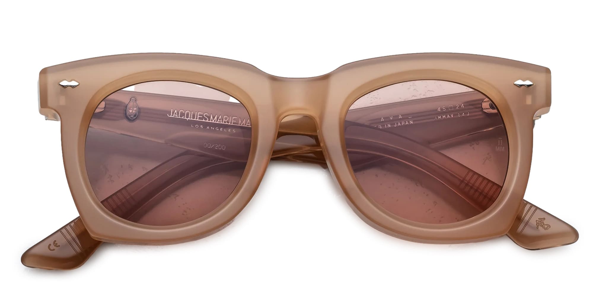 Jacques Marie Mage AVA - SUNDIAL (JMMAV-14J) are sleek '50s-inspired round sunglasses made in Japan. They feature brown 8mm acetate frame, custom double laminated acetate, sterling silver signature double-arrowhead front pin, exposed wirecore with 'Lever' decoration, tension-secured custom barrel hinge, marrakesh brown 4 base CR39 lens with backside anti-reflective treatment and 100% UV protection.
