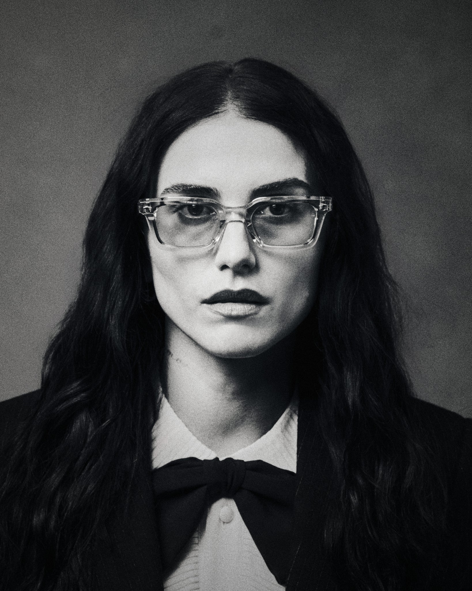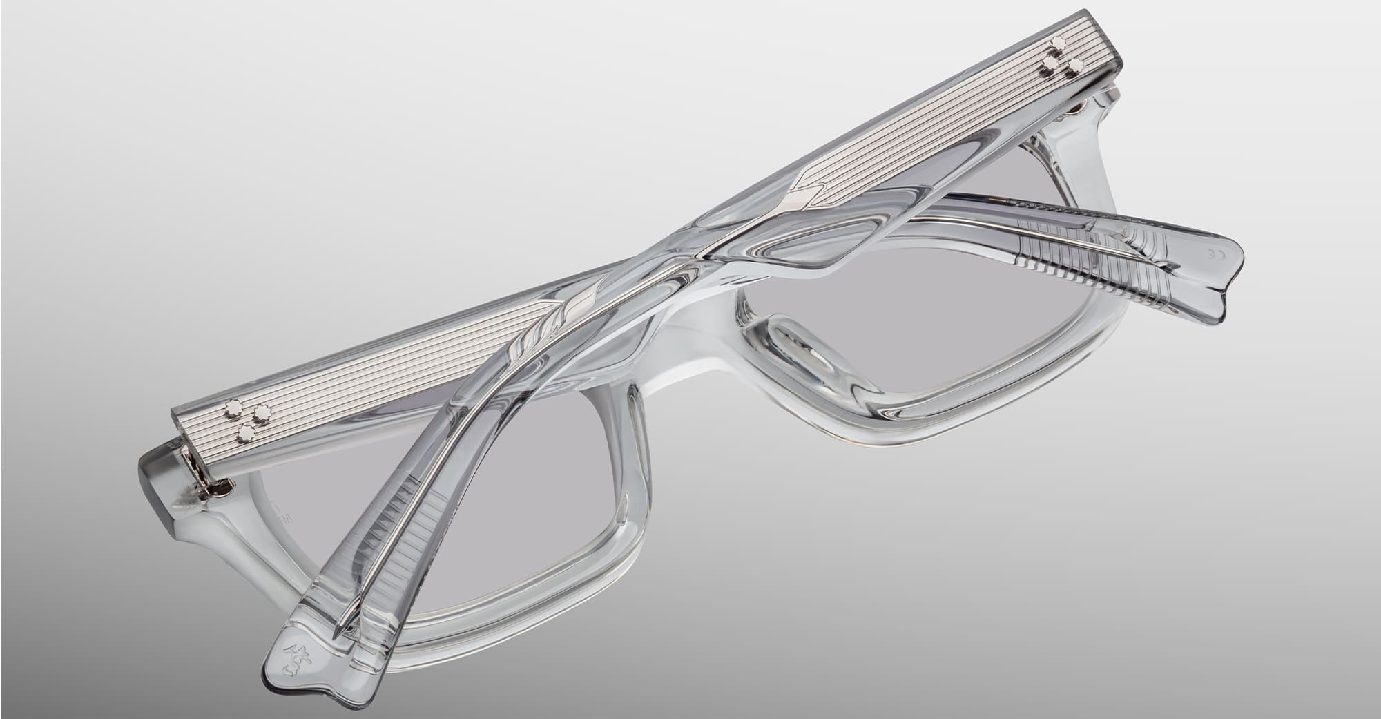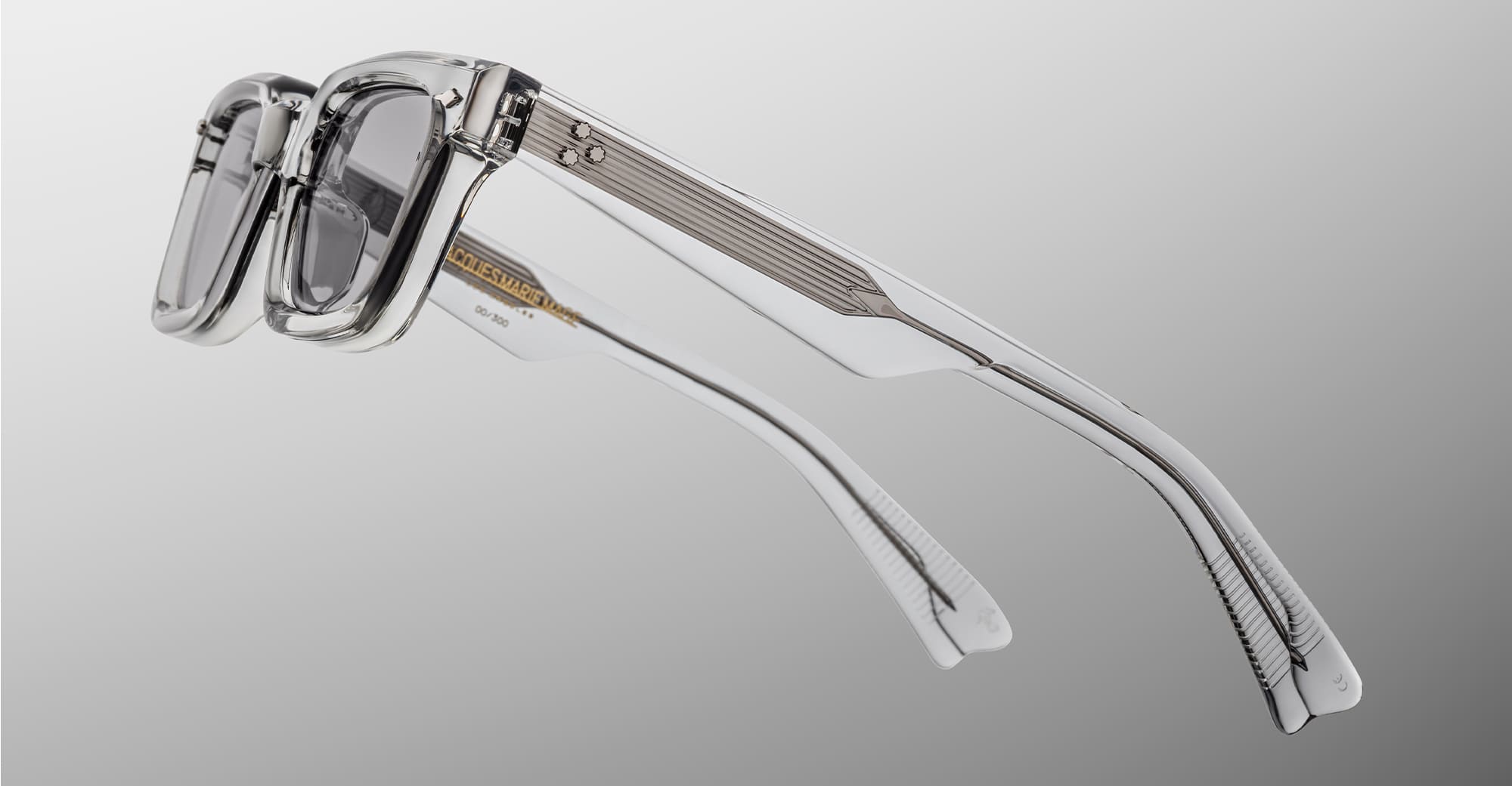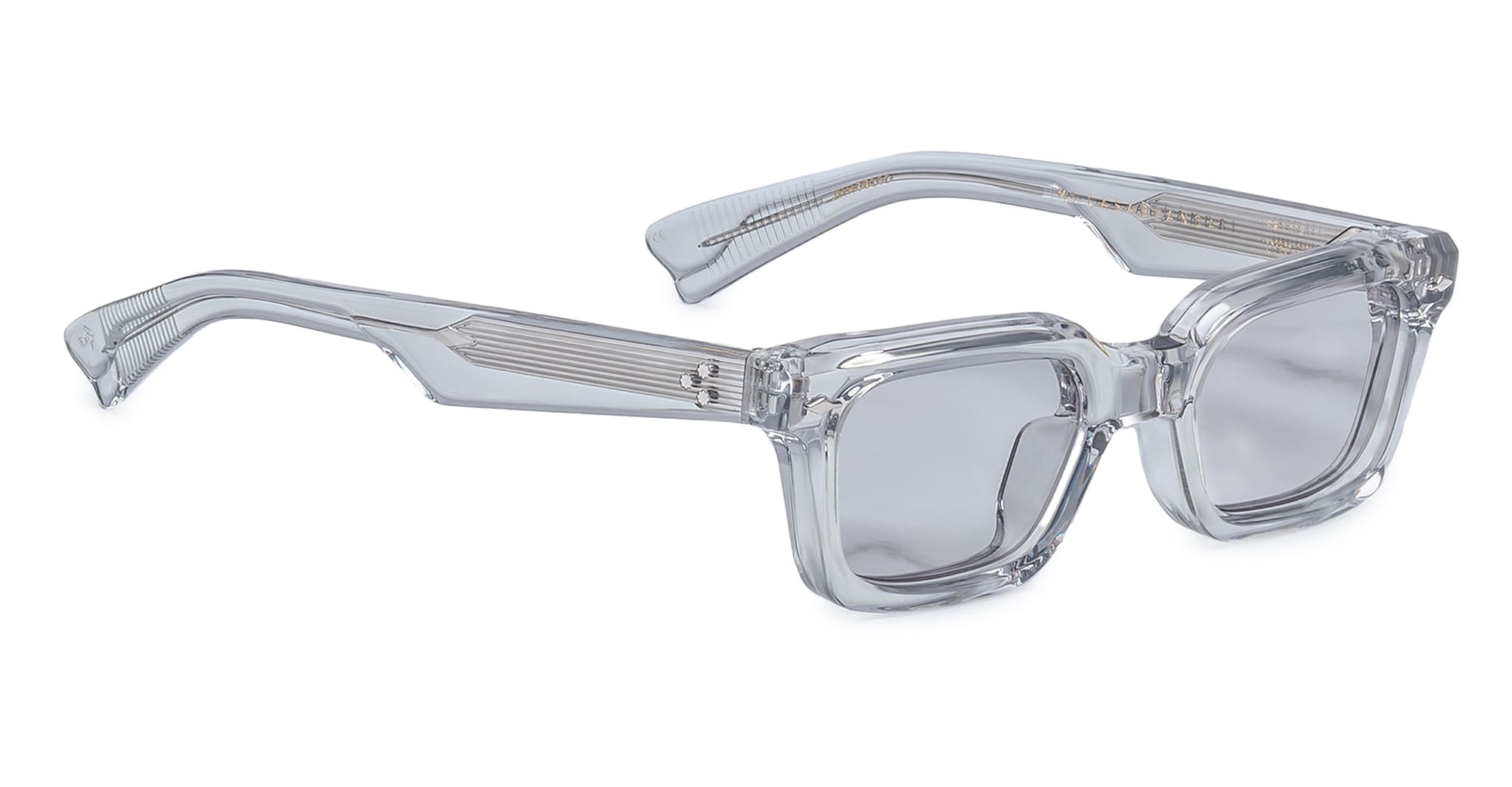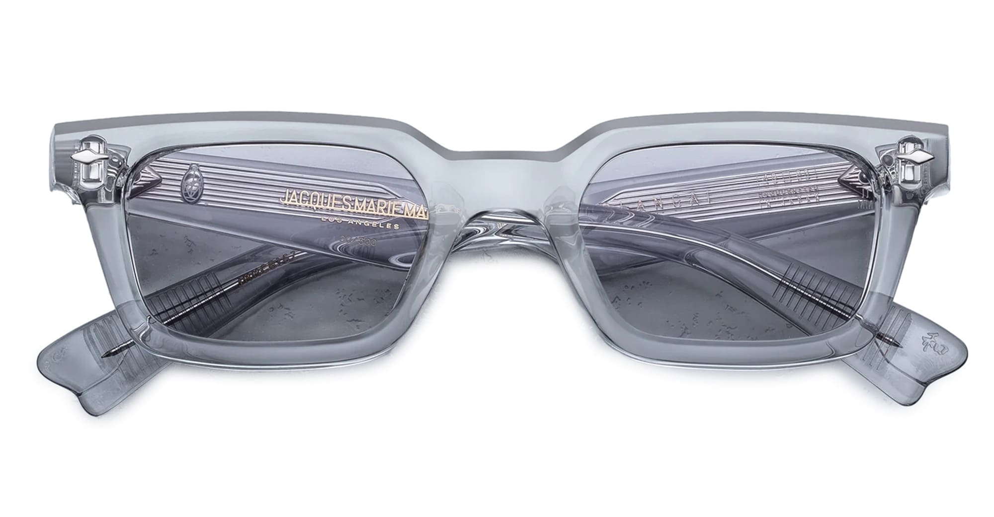 Jacques Marie Mage CASABLANCA - SULFUR (JMMCB-15Z) are compact sunglasses with a small, rectangular lens shape. They feature 10mm transparent grey cured cellulose acetate frame with clever brow line and thin nose bridge, custom double laminated acetate temples, silver arrowhead front pins, exposed wirecore, custom 7 barrel hinge, dove grey 4 base CR39 lens with backside anti-reflective treatment and 100% UV protection.