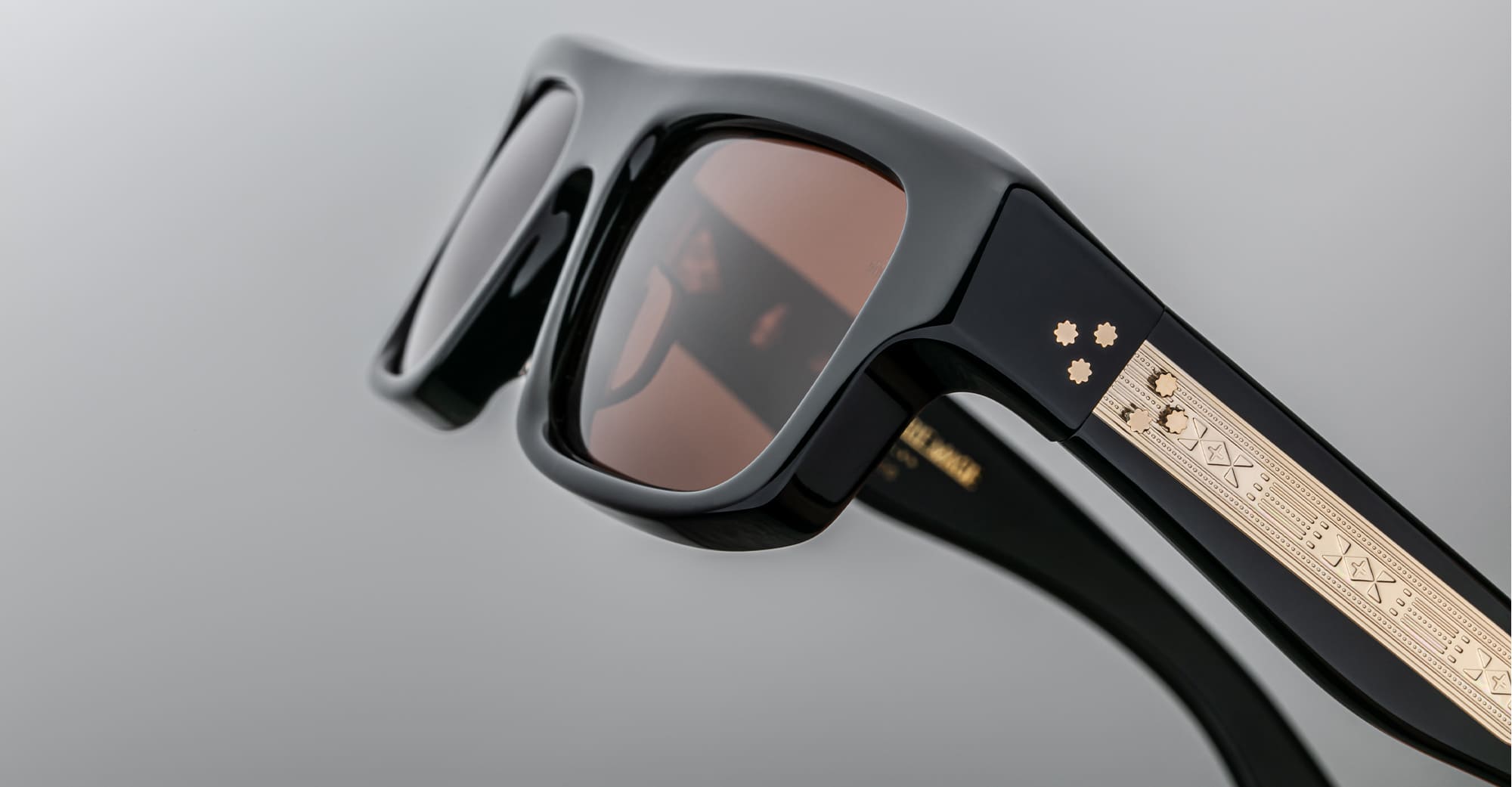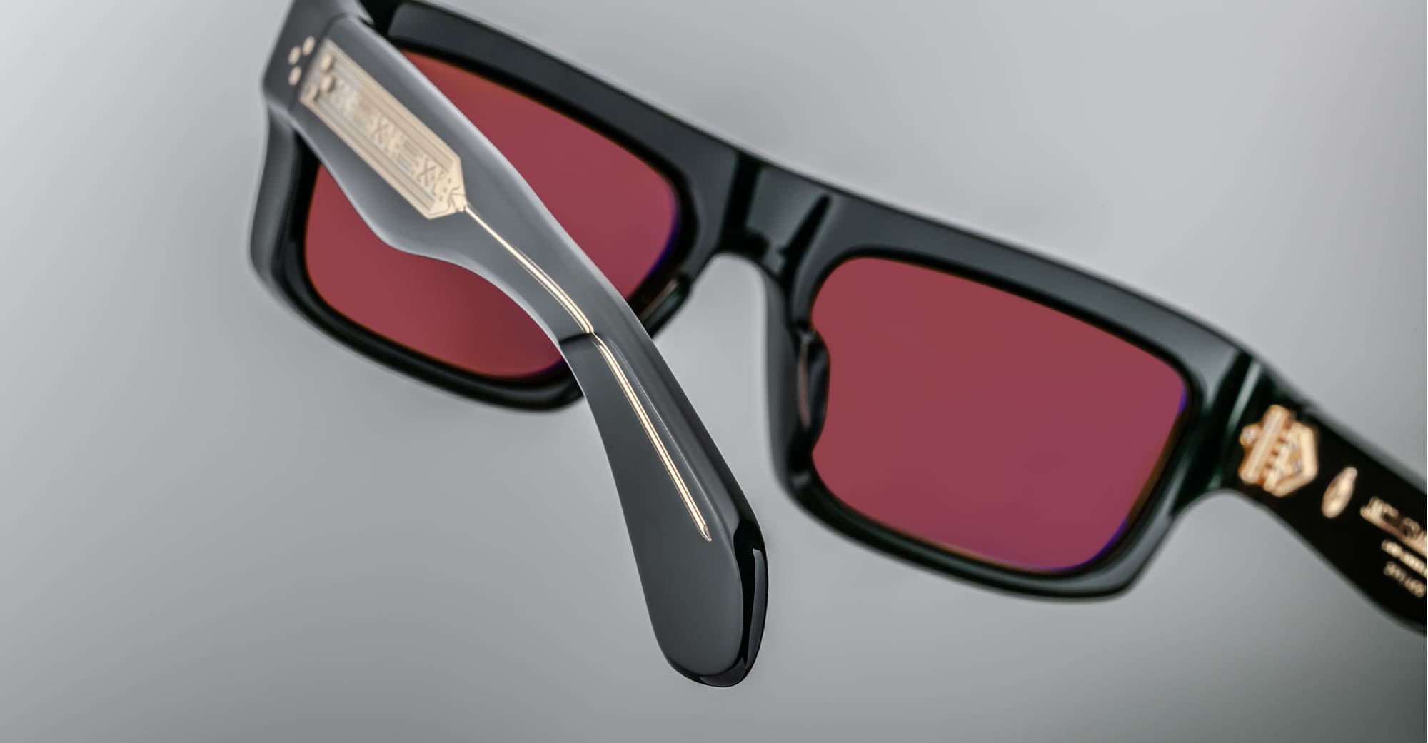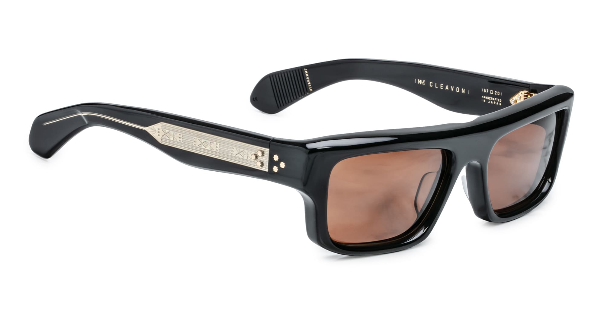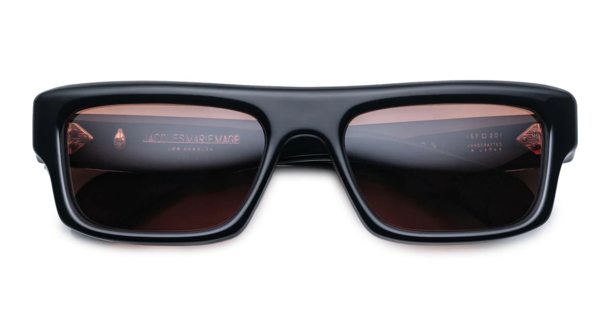 Jacques Marie Mage CLEAVON 57 - ECLIPSE 2 (JMMVNX-11D) are elegant '80s-inspired rectangular sunglasses with a soft wrap-around effect. A bigger version of the classic Cleavon. They feature 8mm black cured cellulose acetate frame, custom double laminated temples, exposed dark gold wirecore, tension-secured custom 9 barrel hinge with spur-shaped rivets, sienna 6 base armorlite lens with back-side anti-reflective treatment, and 100% UV protection.