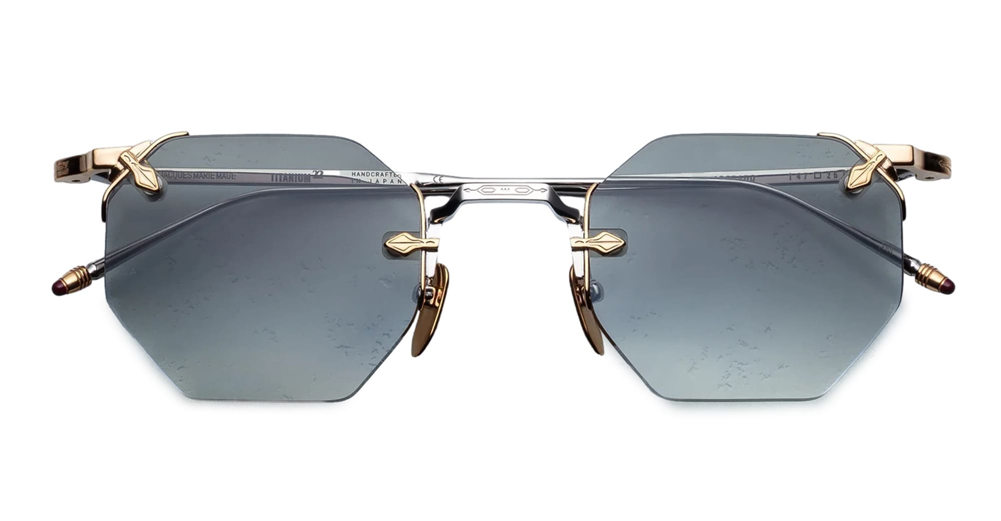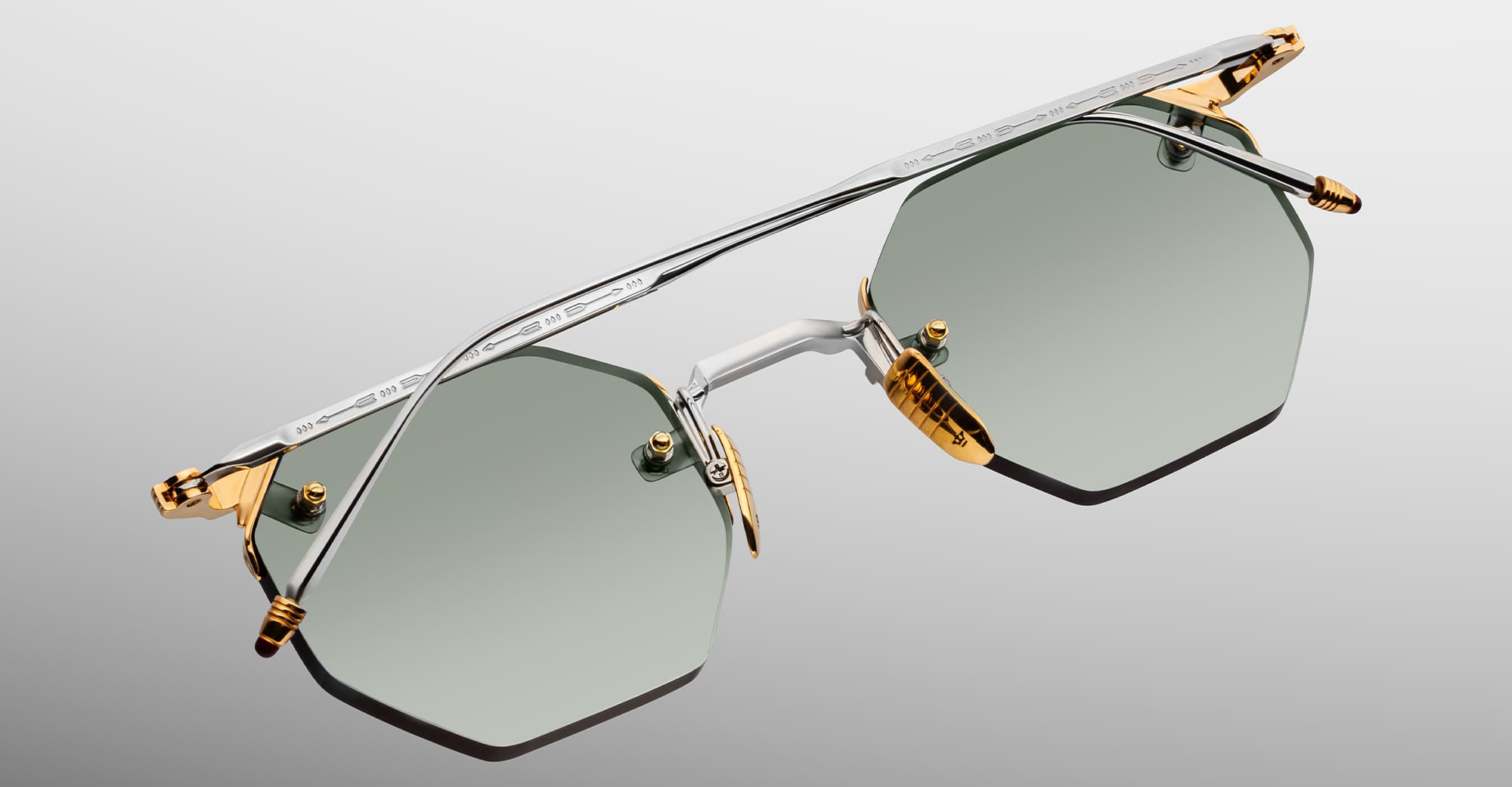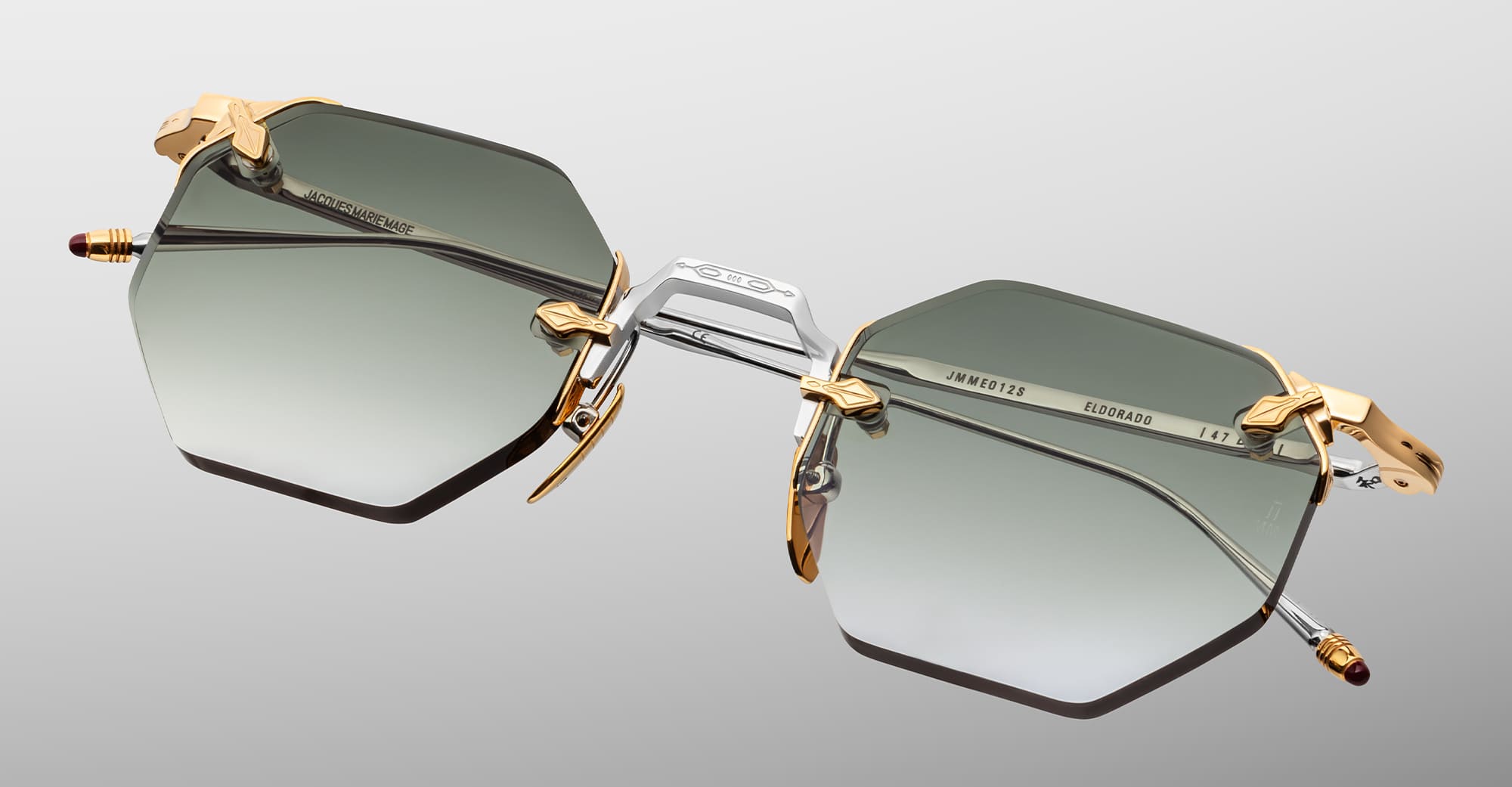Jacques Marie Mage EL DORADO - ELECTRUM (JMMEO-12S) are elegant '30s-inspired octagonal rimless sunglasses. They feature dual-tone silver and gold 100% beta titanium frame, custom bone hinge, engraved titanium temples with epoxy tips detail, custom nose pads, emerald green gradient CR39 2 base lens with backside anti-reflective treatment, and 100% UV protection.