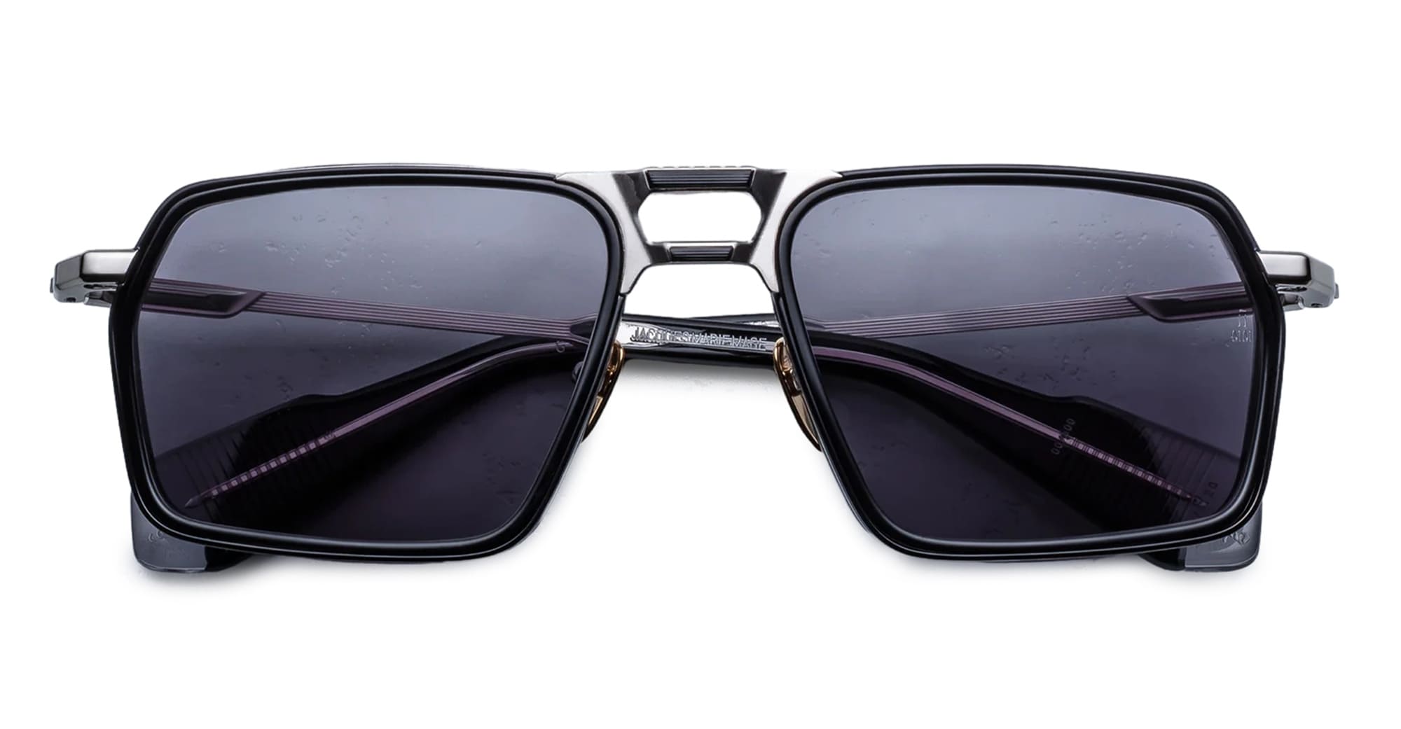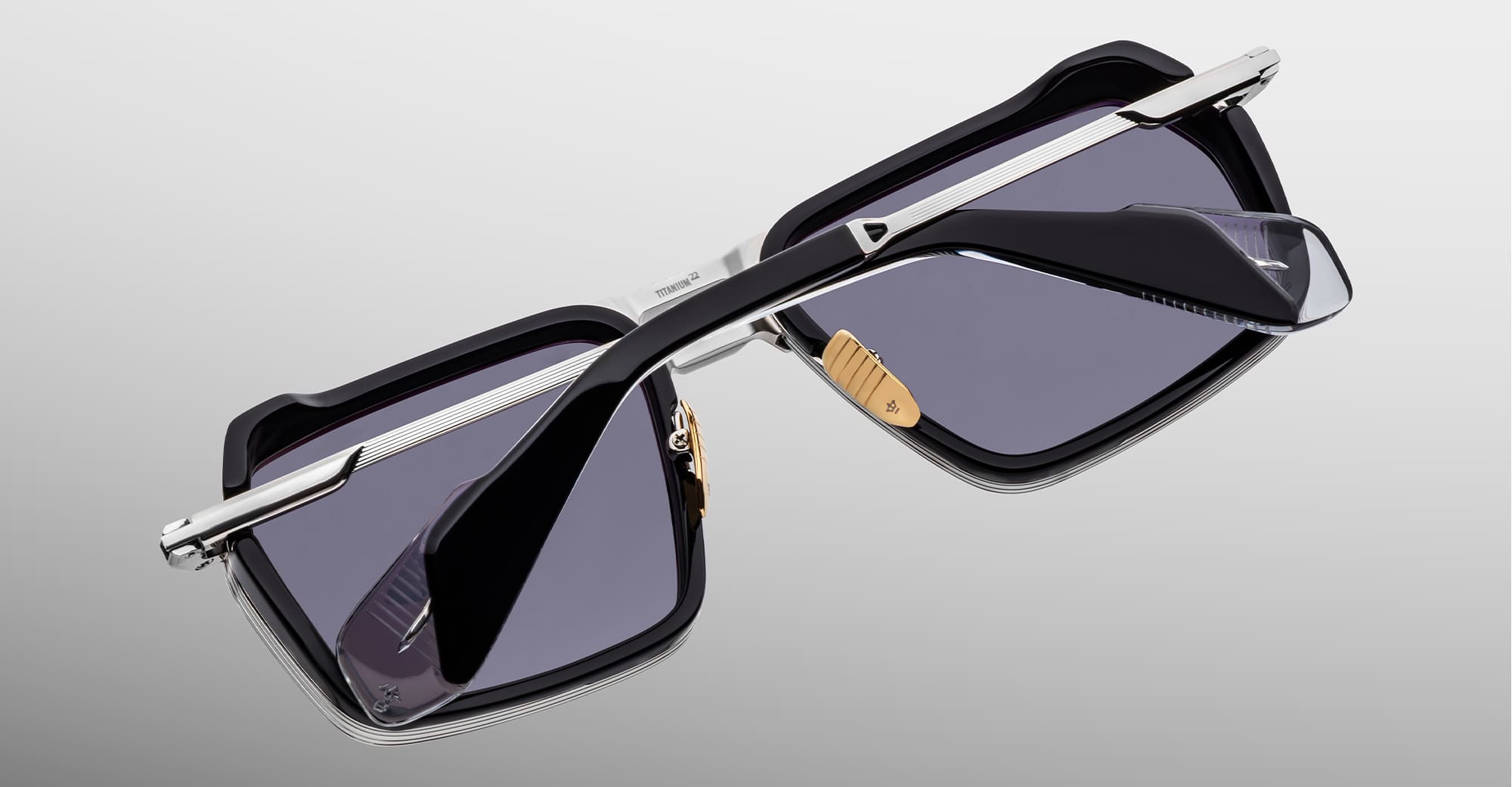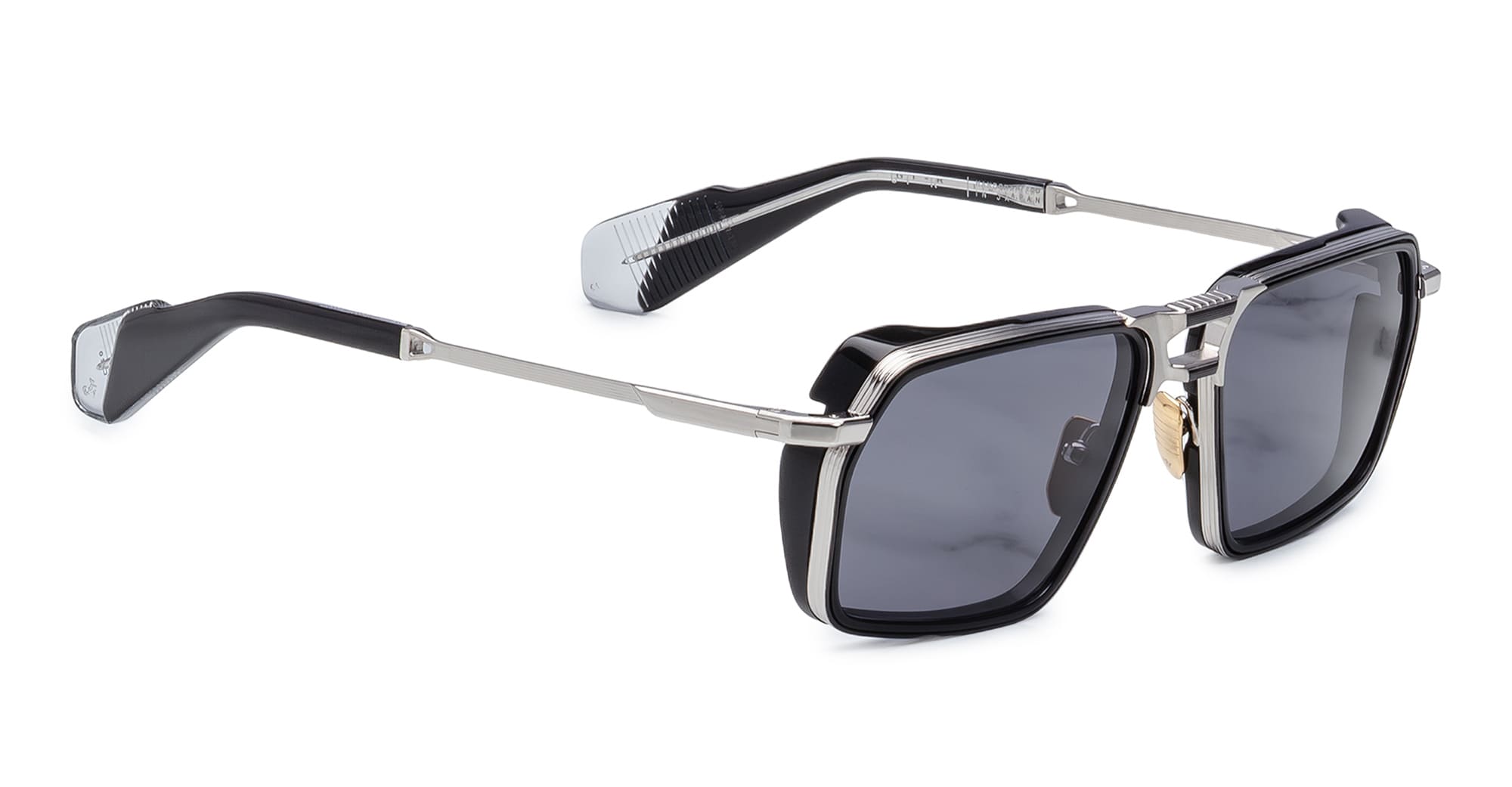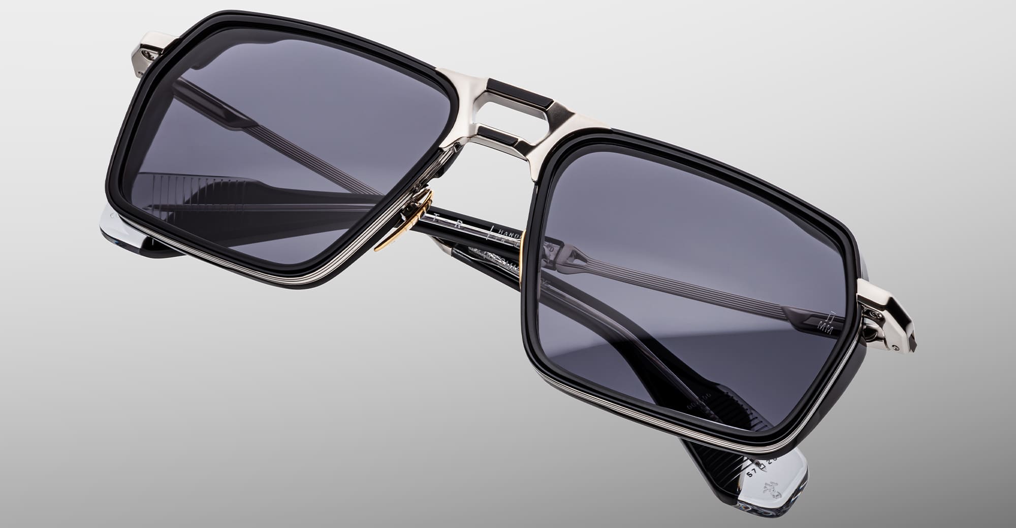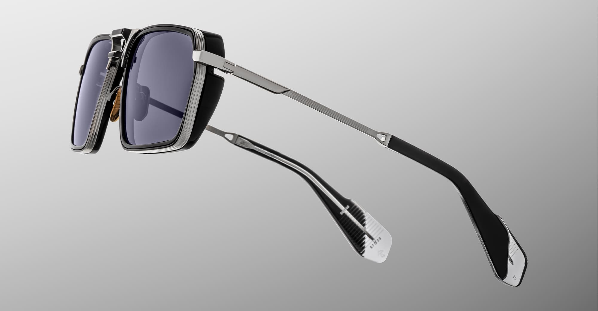 Jacques Marie Mage GT-R - ARMOUR (JMMGTR-17G) are 70s-inspired navigators spectacles, a new iteration of a celebrated JMM style. They feature silver 100% beta titanium frame with 11mm black cured cellulose acetate lens rim inserts, engraved 100% beta titanium temples with acetate temple tips, custom nose pads, tension-secured custom 917 hinge, and charcoal CR39 4 base lens with backside anti-reflective treatment and 100% UV protection.