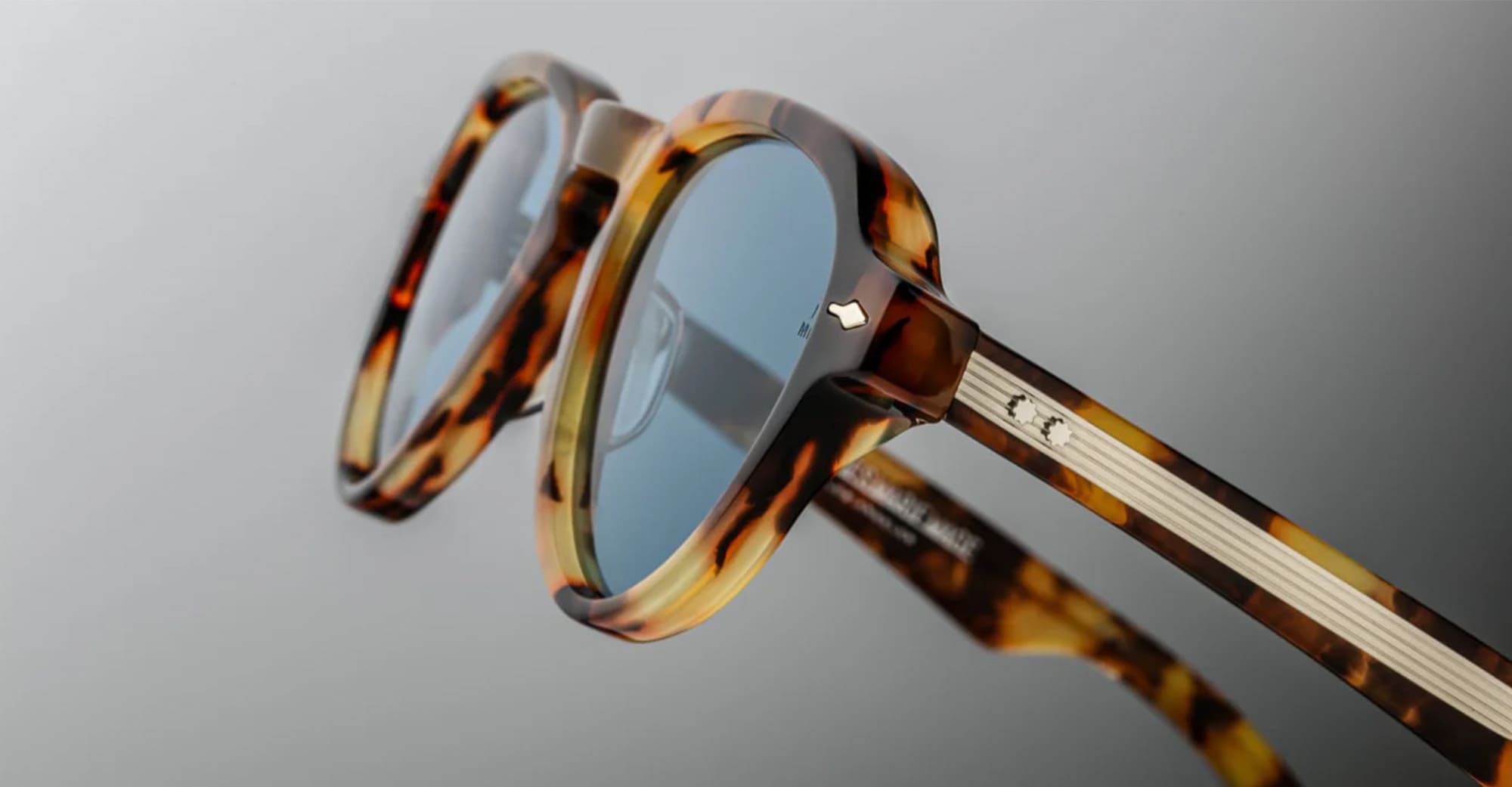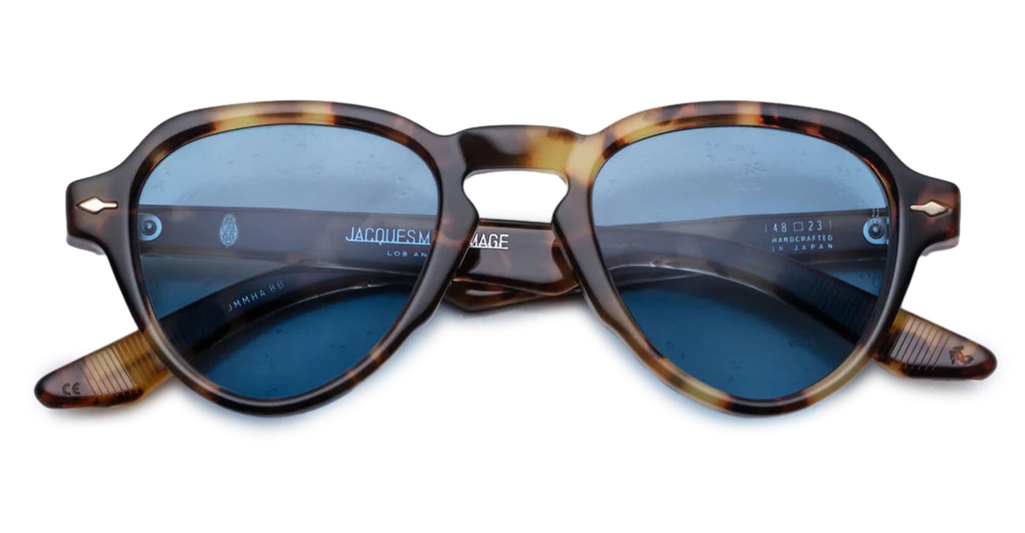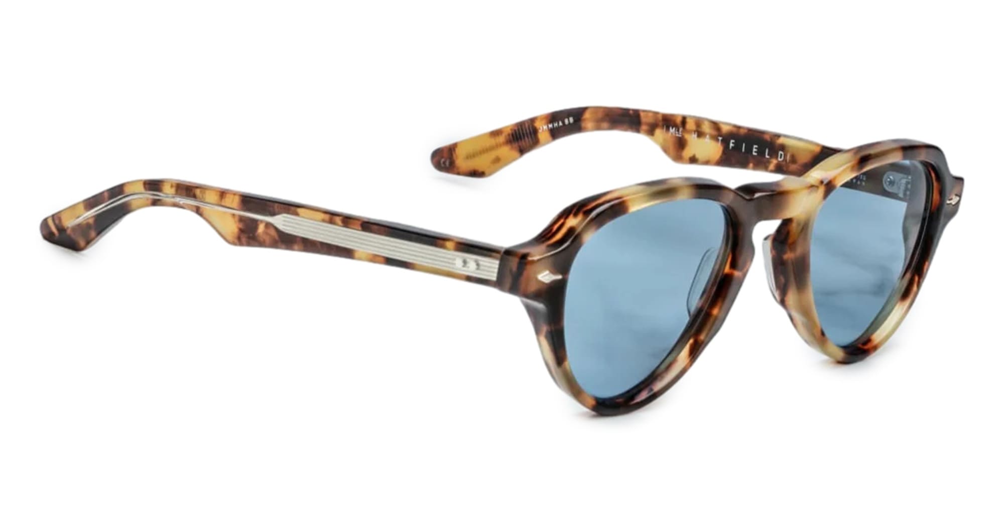 Jacques Marie Mage HATFIELD - HAVANA 8 (JMMHA-8B) are sleek and balanced aviator sunglasses with an exaggerated teardrop lens shape. They feature 10mm havana cured cellulose acetate frame, custom double laminated temples, sterling silver arrowhead front pins, keyhole nose bridge, exposed wirecore, tension-secured custom 5 barrel hinge, blue CR39 lens with anti-reflective treatment and 100% UV protection.