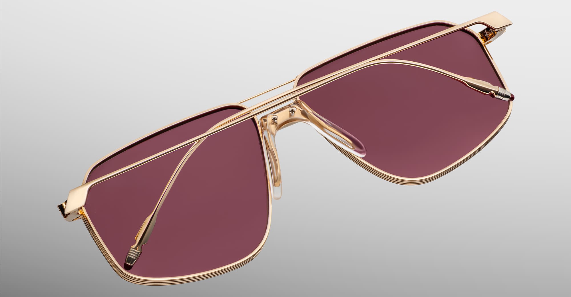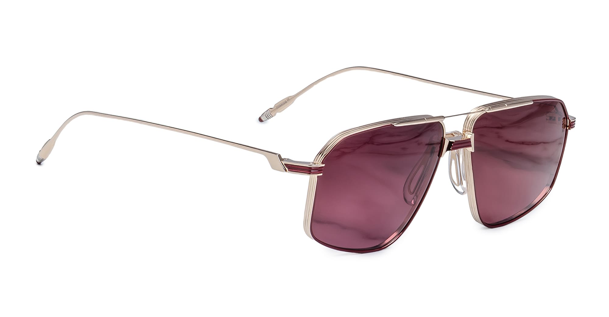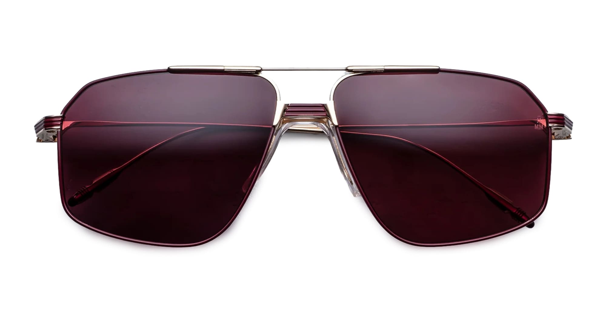 Jacques Marie Mage JAGGER - CHAMPAGNE (JMMJG-22) are oversized late '70s-inspired aviator sunglasses with sculptural Art Deco-inspired double bridge. They feature light gold 100% beta titanium frame with gold accent, custom monoblock hinge construction, custom clear nose pads, silver and burgundy epoxy tailfin temple tips, mahogany gradient 4 base CR39 lens with backside anti-reflective treatment and 100% UV protection.