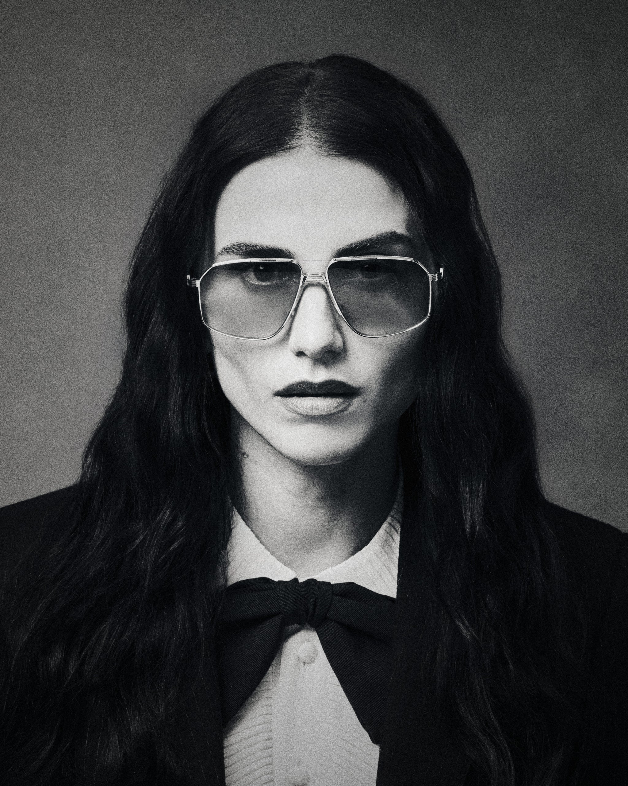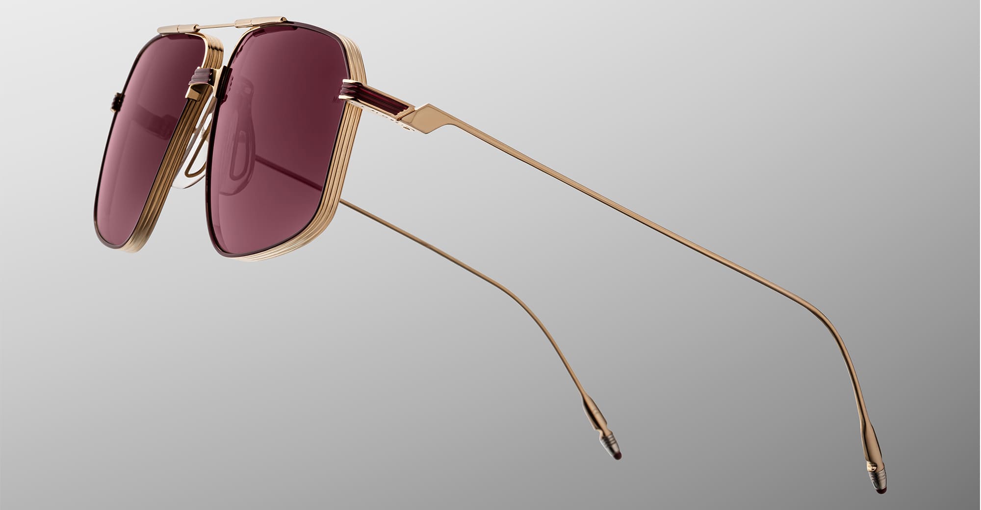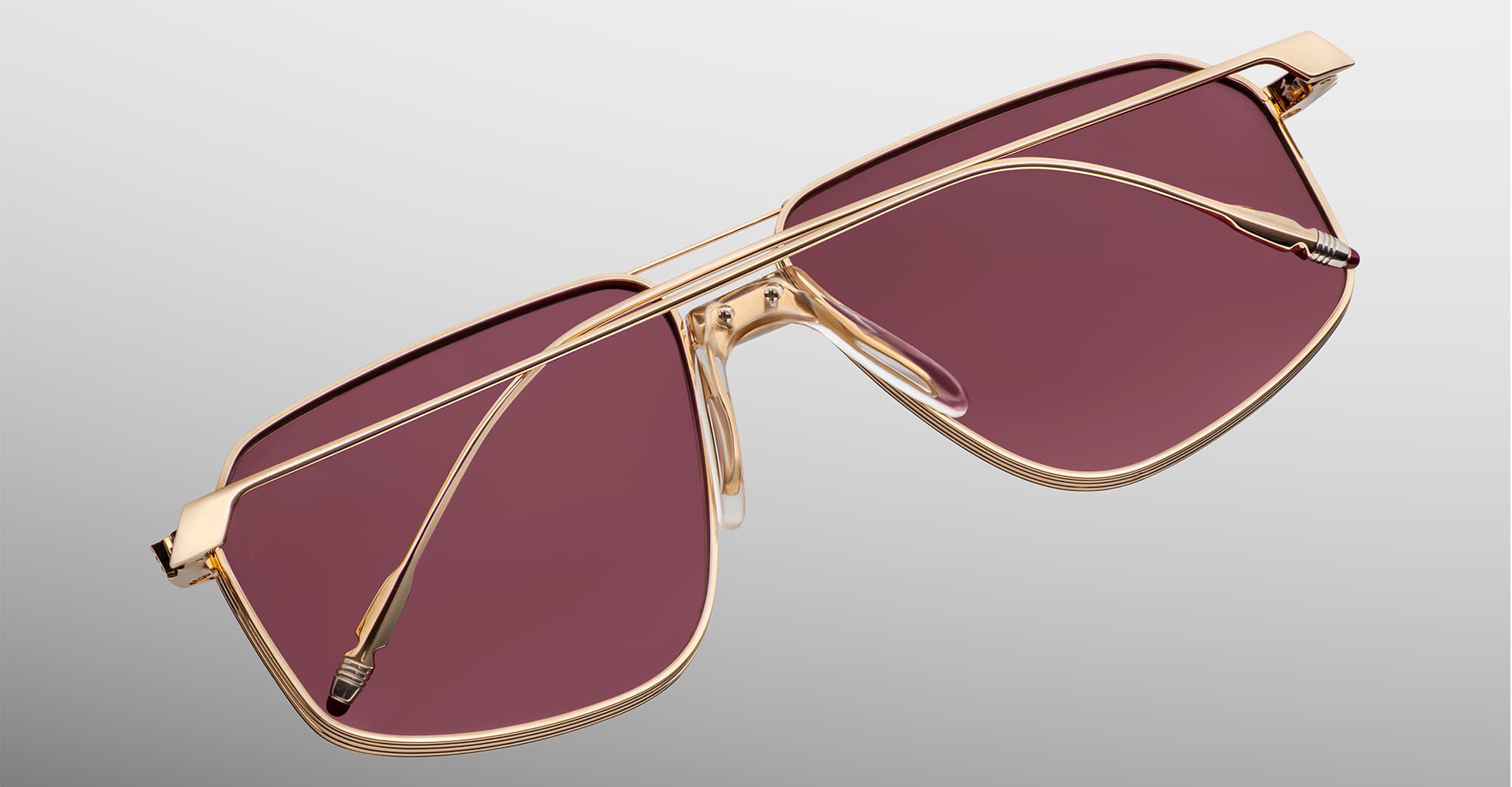 Jacques Marie Mage JAGGER - CHAMPAGNE (JMMJG-22) are oversized late '70s-inspired aviator sunglasses with sculptural Art Deco-inspired double bridge. They feature light gold 100% beta titanium frame with gold accent, custom monoblock hinge construction, custom clear nose pads, silver and burgundy epoxy tailfin temple tips, mahogany gradient 4 base CR39 lens with backside anti-reflective treatment and 100% UV protection.