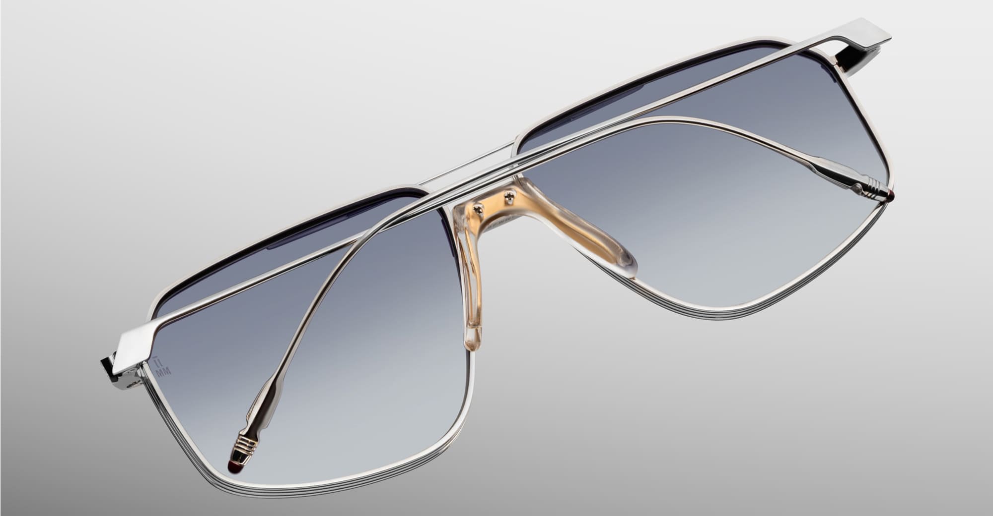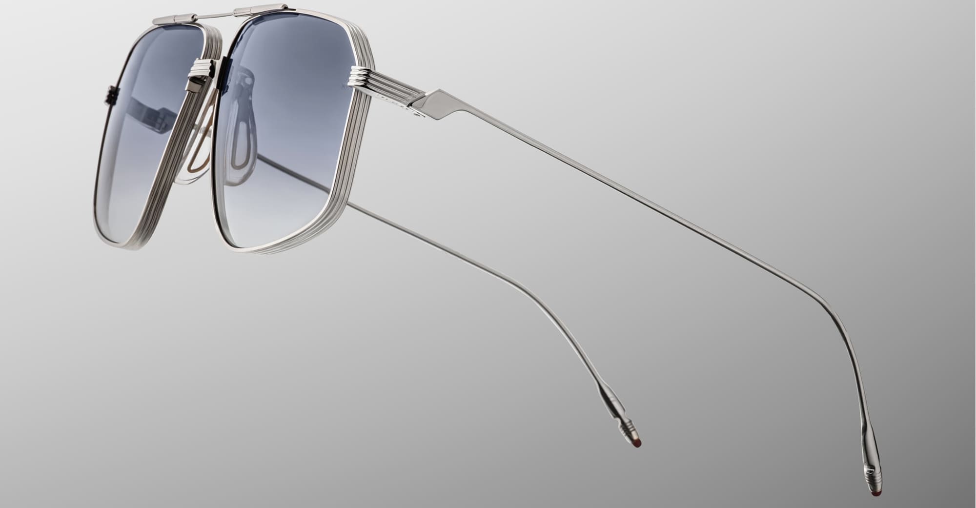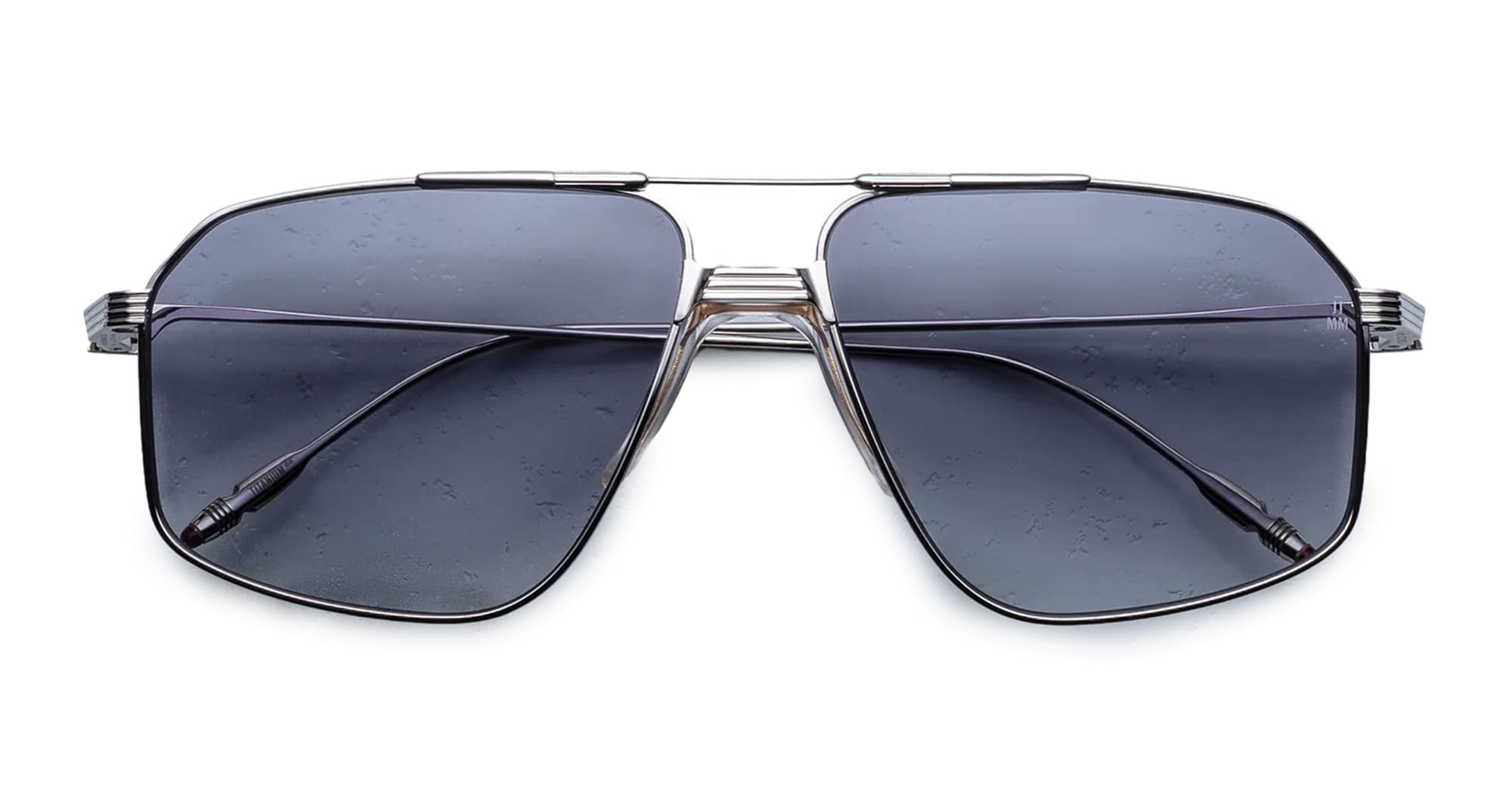Jacques Marie Mage JAGGER - SULFUR (JMMJG-15Z) are oversized late '70s-inspired aviator sunglasses with sculptural Art Deco-inspired double bridge. They feature silver 100% beta titanium frame with silver accent, custom monoblock hinge construction, custom clear nose pads, silver and burgundy epoxy tailfin temple tips, charcoal 4 base CR39 lens with backside anti-reflective treatment and 100% UV protection.