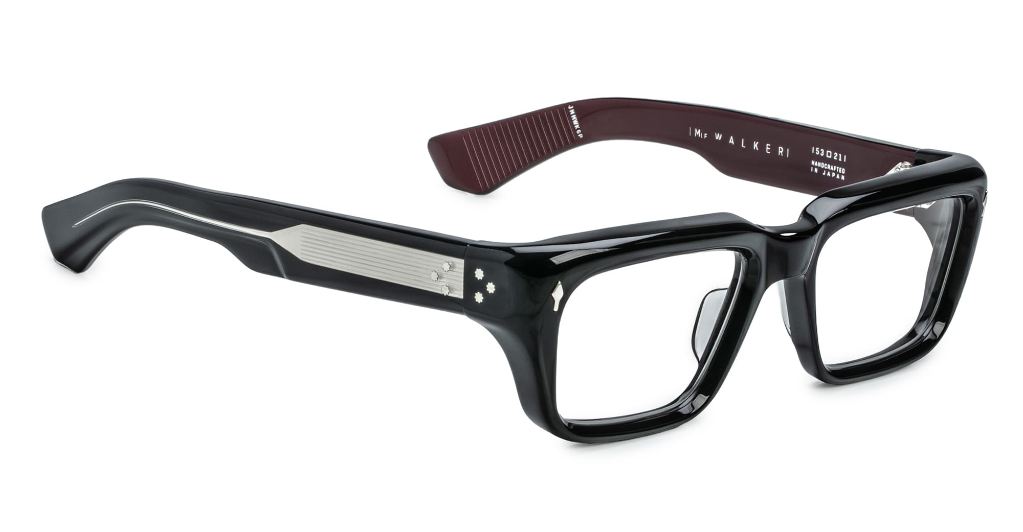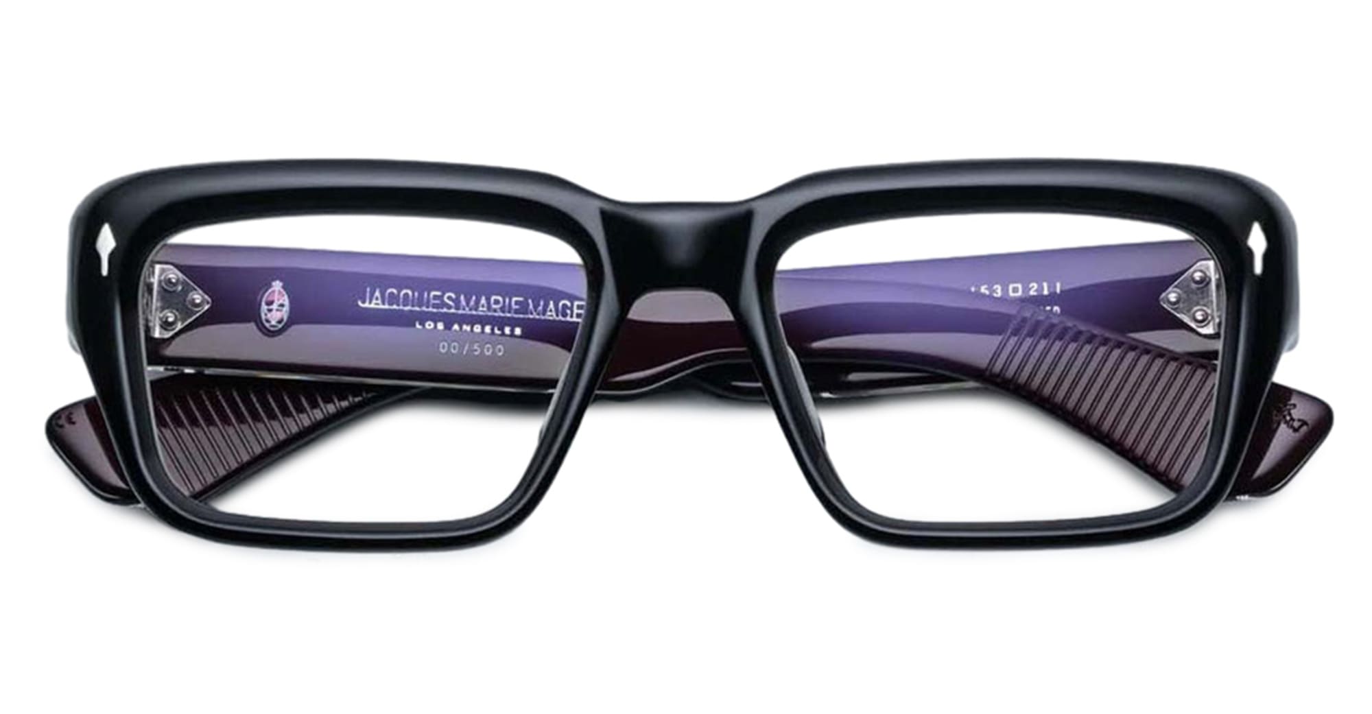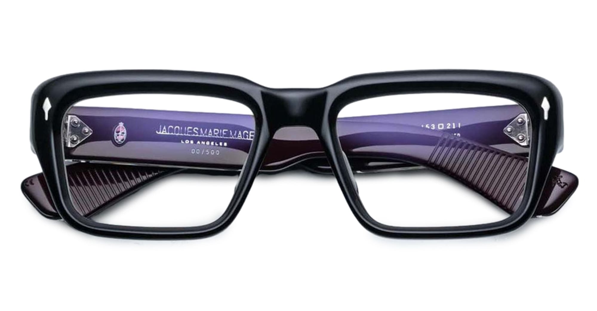 Jacques Marie Mage WALKER - BLOODSTONE RX (JMMWKRX-6P) are bold rectangular eyeglasses, named after experimental singer Scott Walker. They feature 10mm black cured cellulose acetate frame with soft angles, custom double laminated temples with burgundy inner side, silver arrowhead front pin, exposed wirecore, tension-secured custom 9 barrel hinge with spur-shaped rivets.