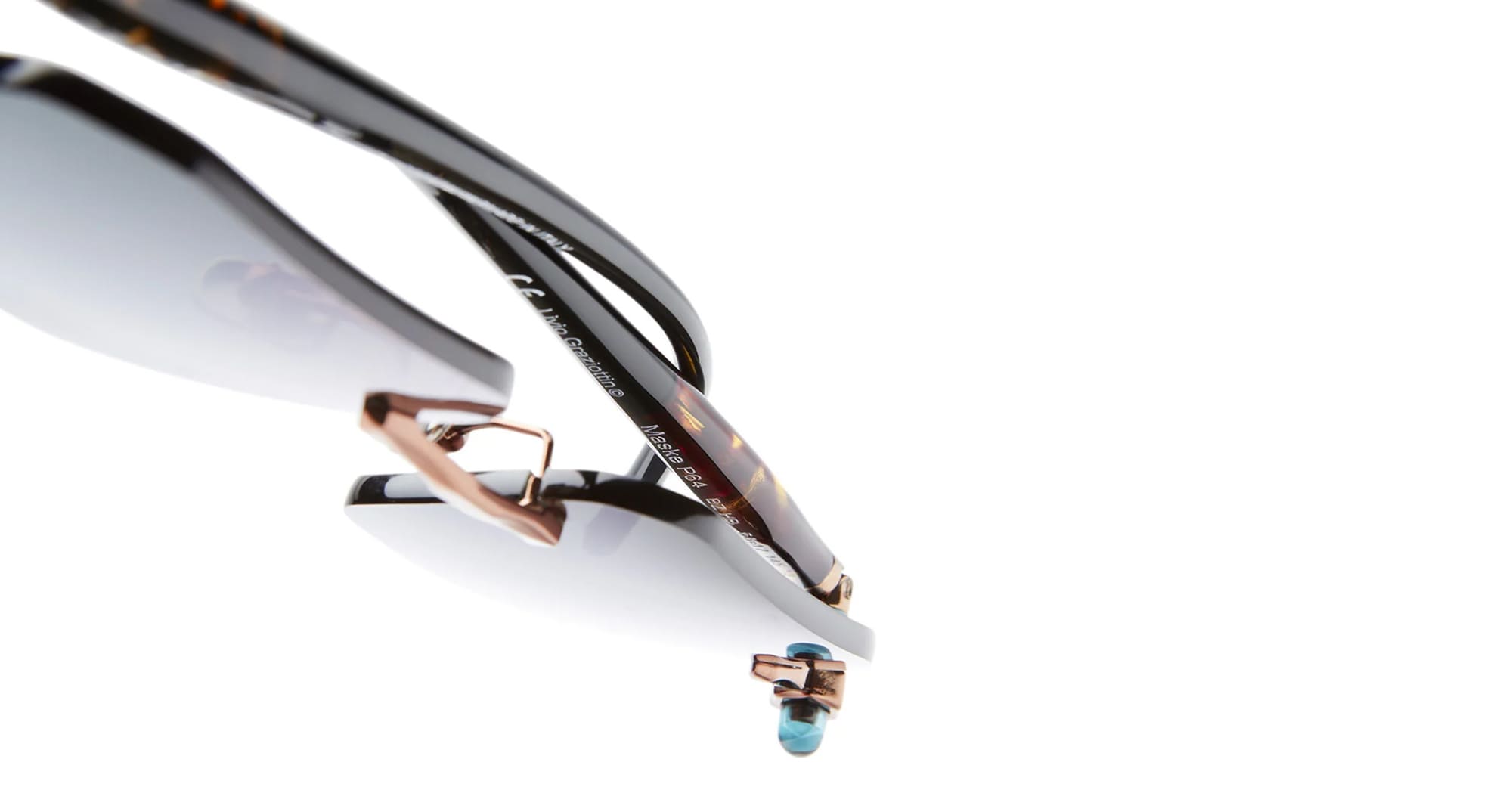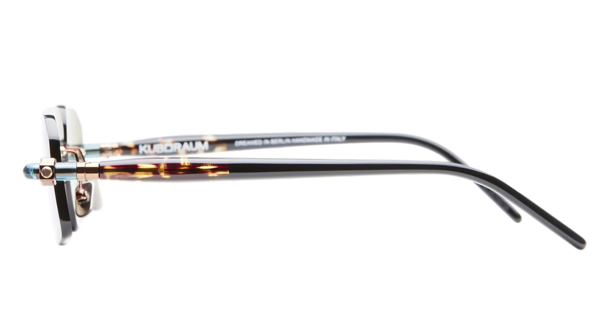 Kuboraum MASK P64 BZ HB - BRONZE (KRSP64BZHB000040) are rectangular rimless sunglasses with a retro lens shape. They feature bronze metal structure, iconic bi-color Kuboraum acetate round temples, custom hinge, and green lens with 100% UV protection.