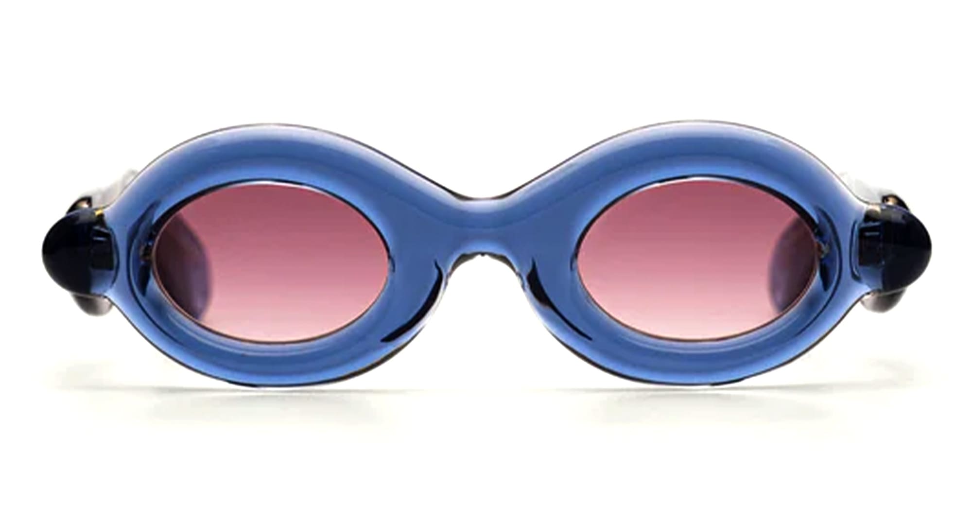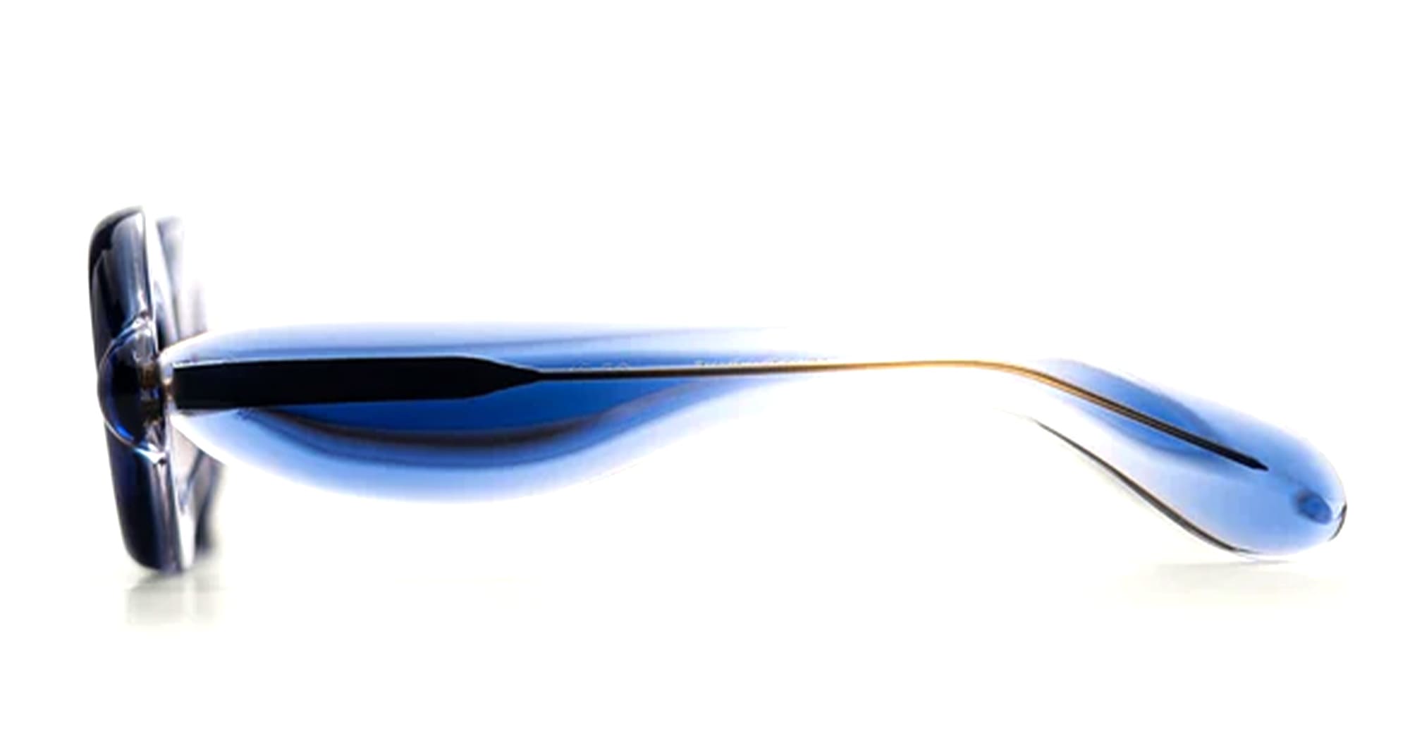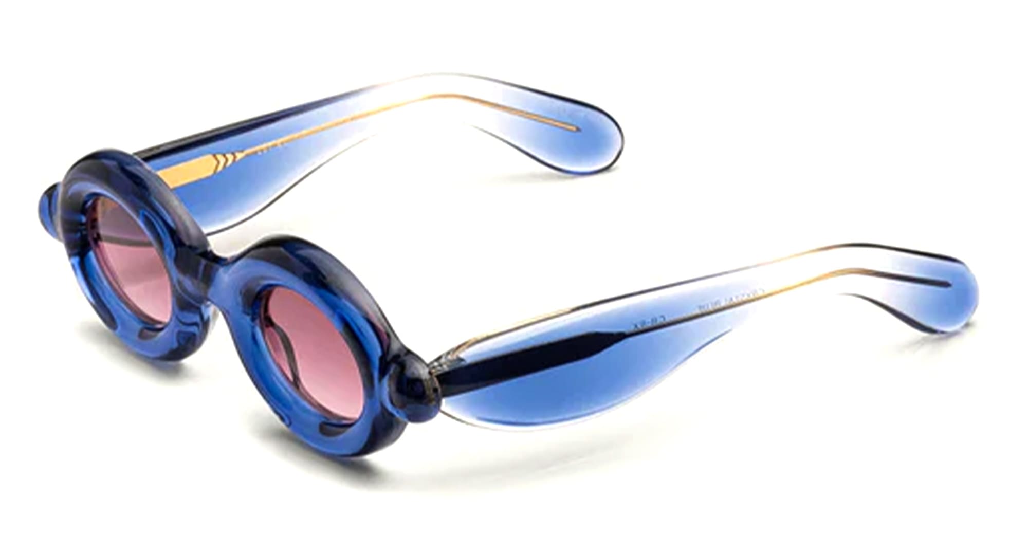 Paloceras PEBBLE - CRYSTAL BLUE RX (CB-RX) are round sunglasses with exaggerated, inflated volumes. They feature 8mm crystal blue cured Mazzucchelli acetate frame with DualLayer™ laminated construction, custom Visottica gold-plated wirecore and 5-joint hinge system, gold-tone engraving logo, and CR39 2 base red gradient lens with backside anti-reflective treatement and 100% UV protection.