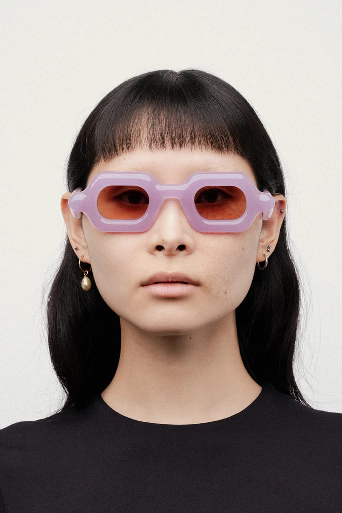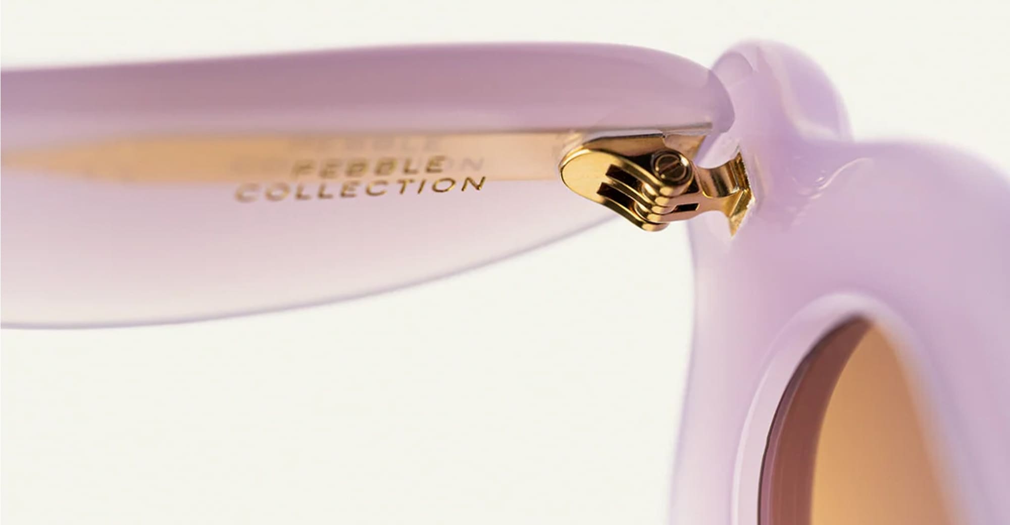 Paloceras PEBBLE - LILAC DREAM SX (pebble-lilac-dream-sx) are squared sunglasses with exaggerated, inflated volumes. They feature 8mm violet cured Mazzucchelli acetate frame with DualLayer™ laminated construction, custom Visottica gold-plated wirecore and 5-joint hinge system, gold-tone engraving logo, and CR39 2 base brown lens with backside anti-reflective treatement and 100% UV protection.