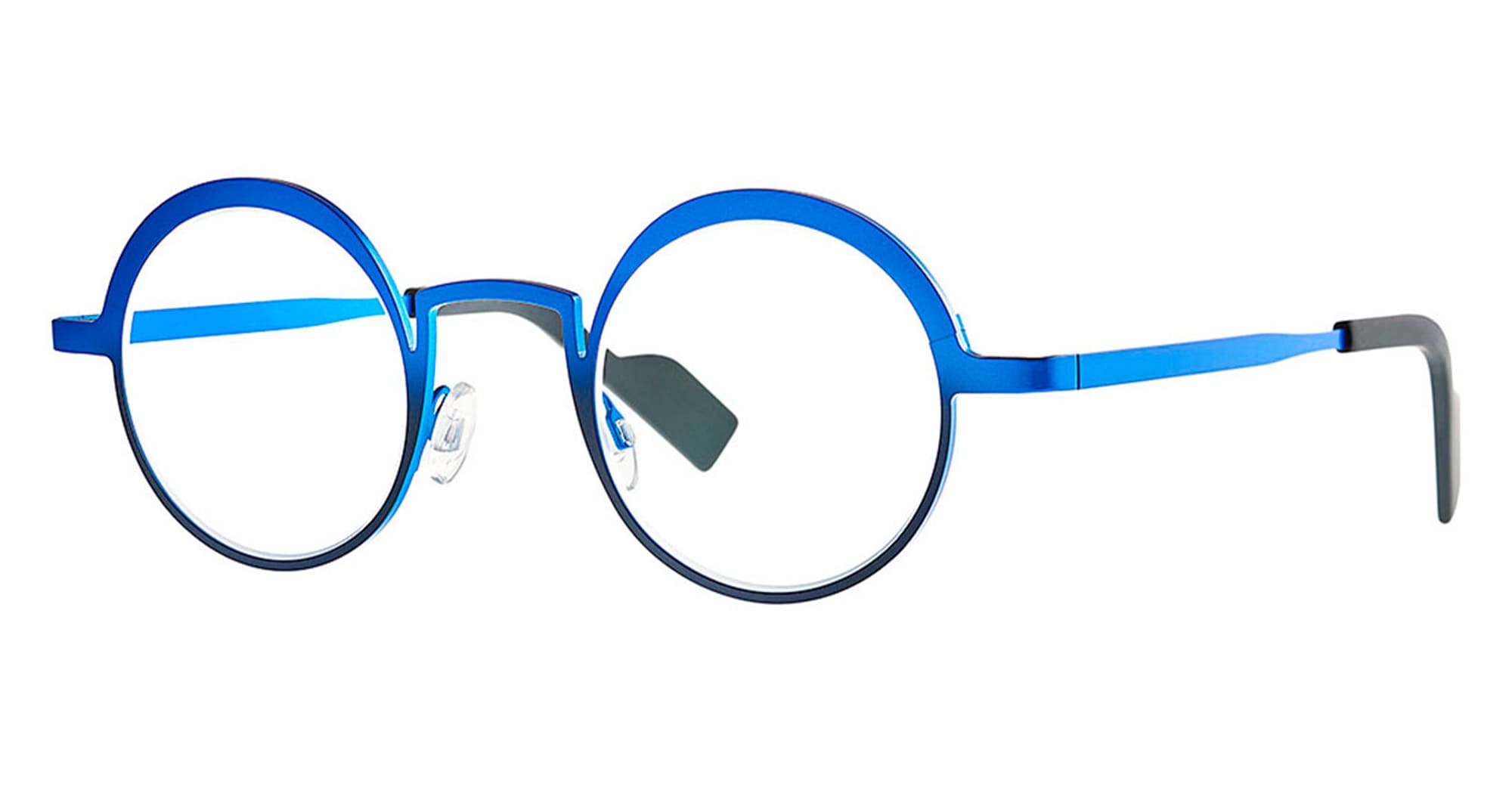 Theo eyewear BREATH - 412 ELECTRIC BLUE / DARK NIGHT RX (BRET-412) are elegant, colorful eyeglasses made in Belgium. They feature a lightweight bi-color titanium frame with a round shape, and acetate temple tips.
